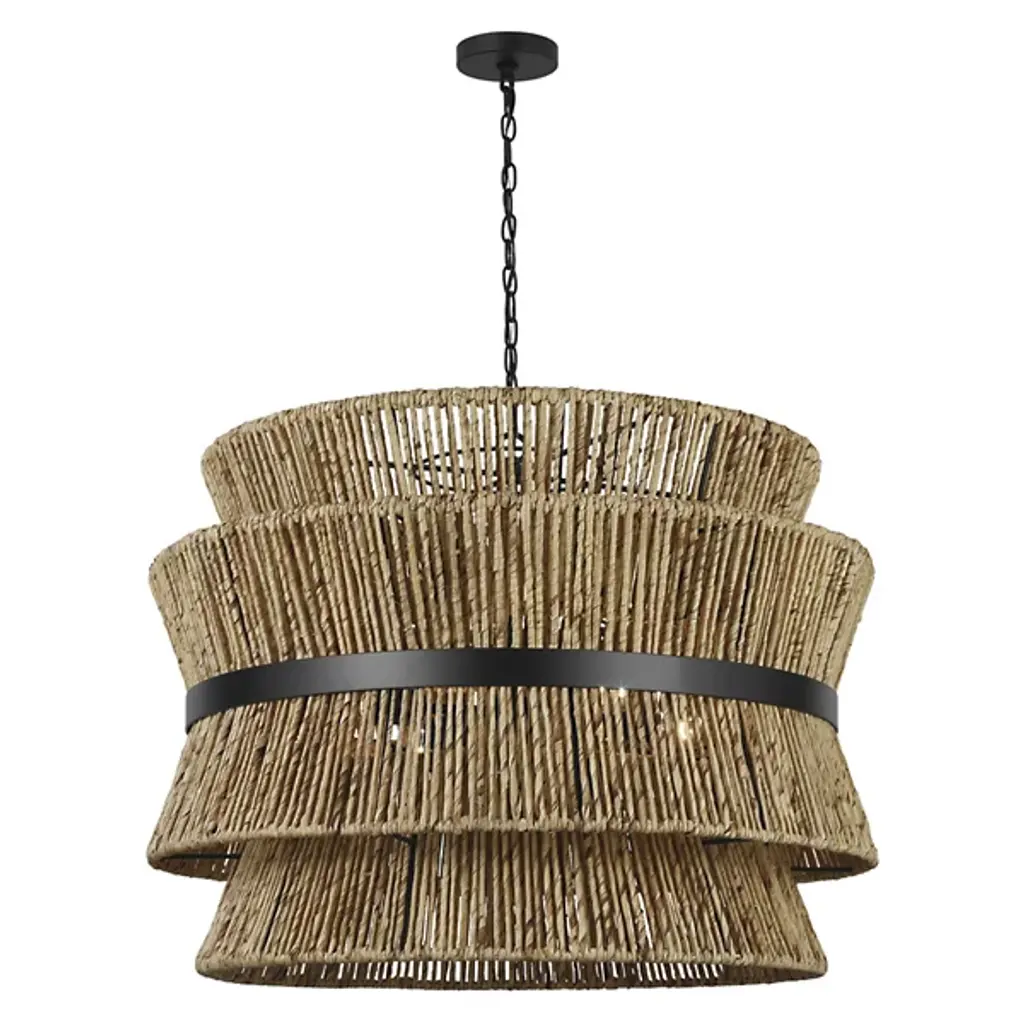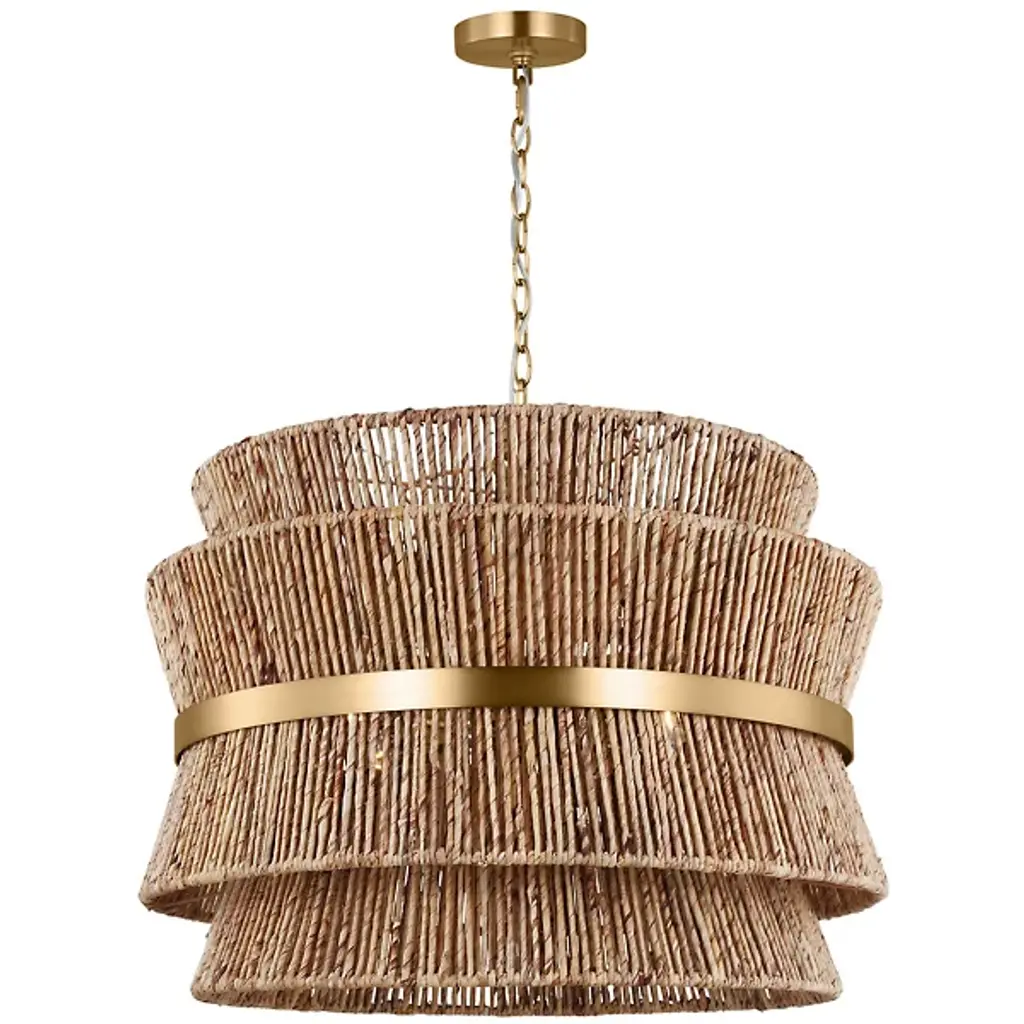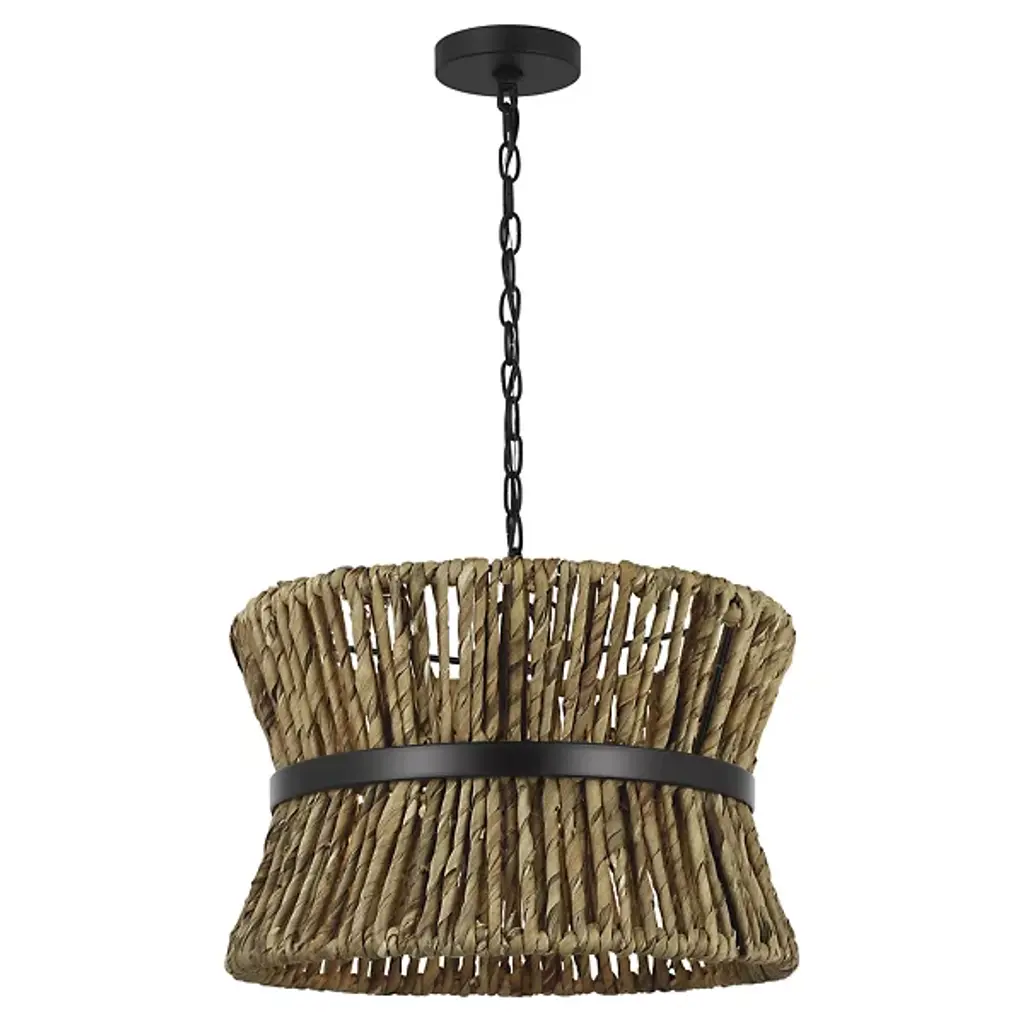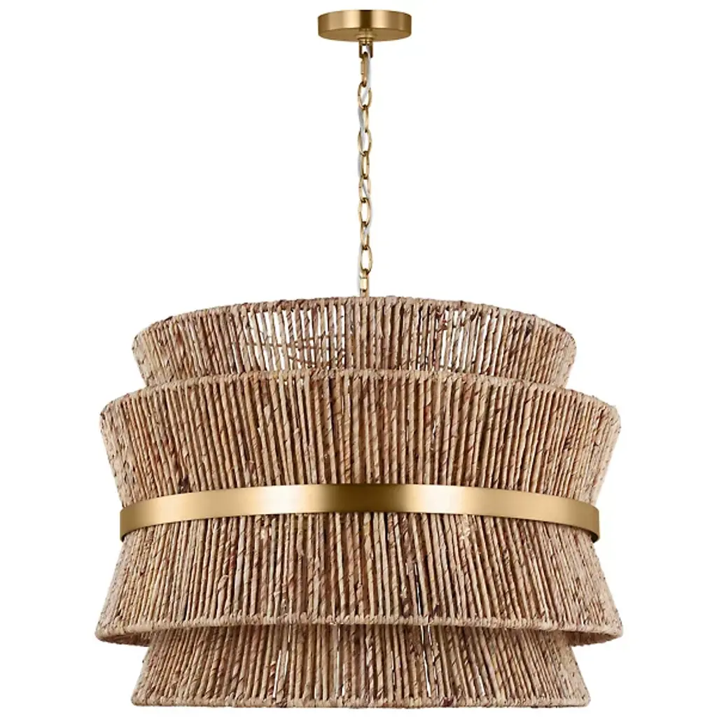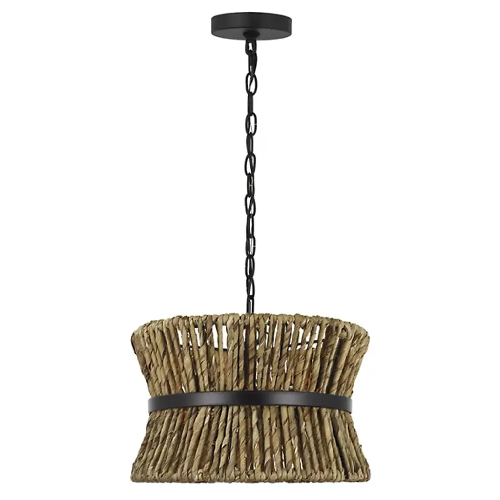 Lend an intricate appeal to inside ceilings with the Thurlo Pendant from Visual Comfort Studio. A clean-surfaced circular canopy extends a fine chain downward to strong lamping placed beneath an hourglass shade of vertically-arranged paper rope. A horizontal metal hoop wraps the center of the shade, confining the rope strands and angling them inward. The vertical rope extends a mix of warm ambiance around direct downlight, creating a stylish bohemian character.
