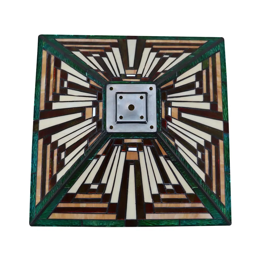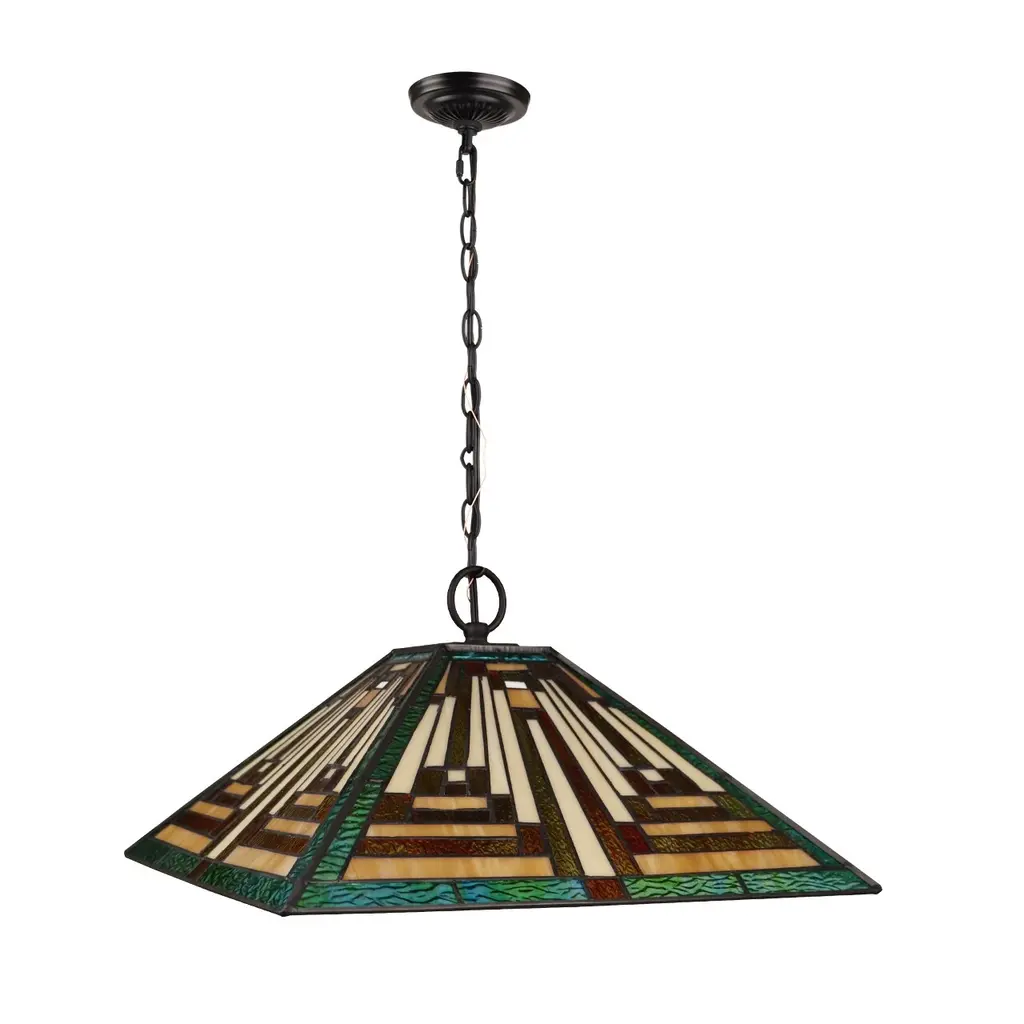 This is a stunning 2 light ceiling pendant, featuring a beautiful mission shade. This piece would be perfect in a hallway or even over a bed frame. Each shade is hand crafted, using the same methods developed by Louis Comfort Tiffany in the early 1900's. This process entails using 268 hand cut stained art glass pieces, each wrapped in fine copper foil and soldered together at extremely high temperatures to form each unique piece. Exact size to the nearest inch may vary, and exact color of each glass piece may vary due to each piece being hand crafted. First image is with the light shining through, second image is with no light. Dry listed and recommended for an indoor setting.Since these are hand-crafted products, the exact color of glass pieces may vary. Colors of the glass will appear darker and less vibrant when not illuminated. Handmade glass will vary from one piece to the other; glass made at different times will also vary. Light bulbs used in lamps or ambient lighting may affect the appearance of the products. Stained glass product has been protected with mineral oil as part of the finishing process. Please use a soft dry cloth to remove any excess oil.