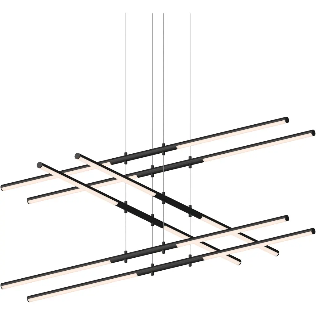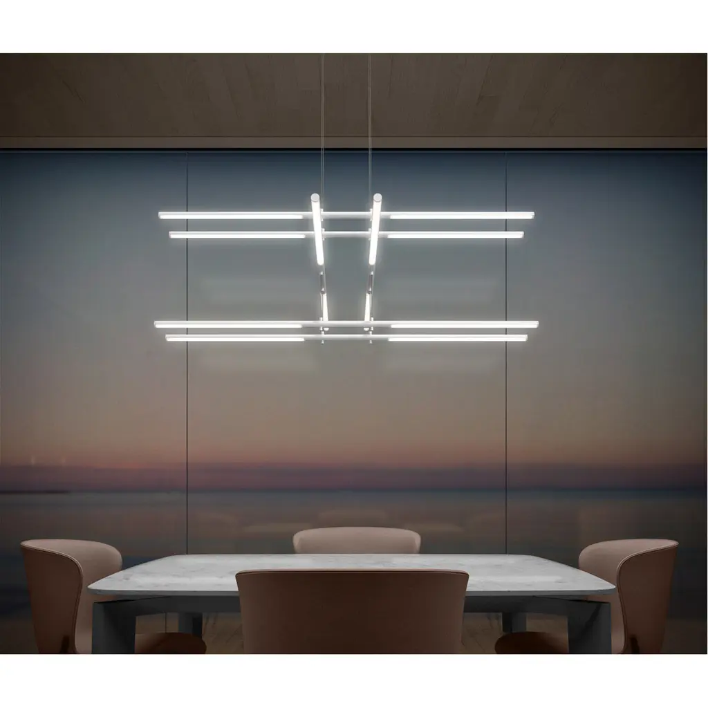 LED rods are suspended in tandem pairs on multiple levels, perpendicular to each other. Each rod can be independently positioned as up or down light, and adjusted with infinite variability to any height along the suspension cables. Dramatic in the precision of their orientation and range of verticality, Tik-Tak brings a crisp presence to the volume of space.