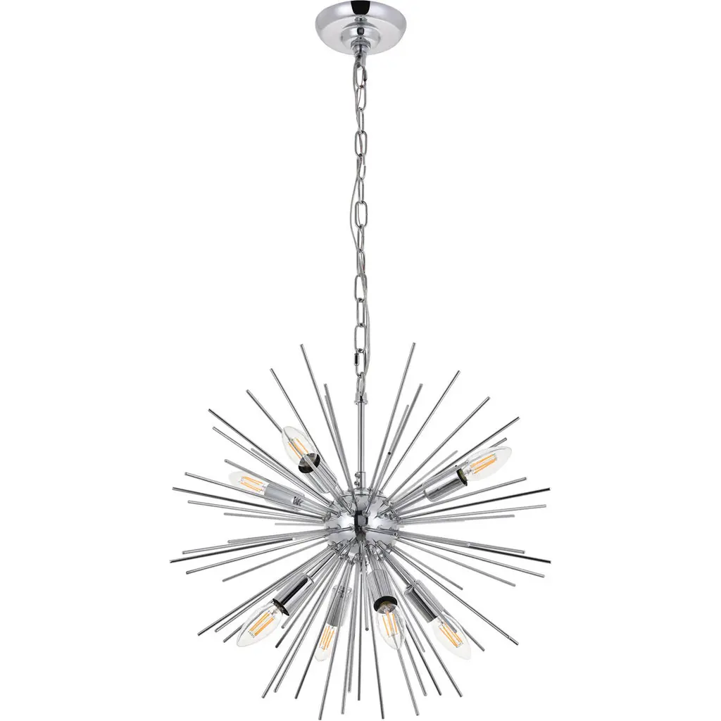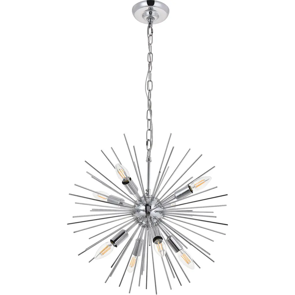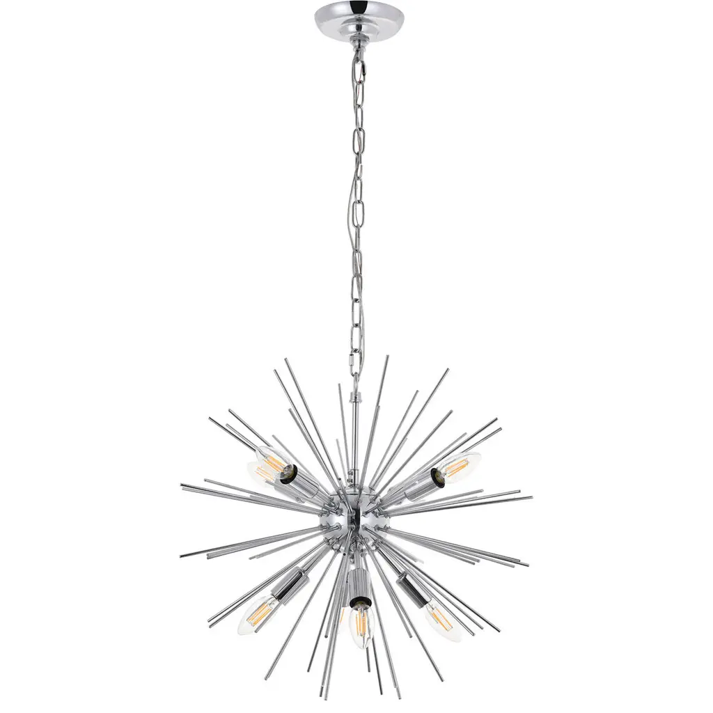 Experience the modern beauty that is the Timber collection pendant lamp in a chrome finish. Its lights are interspersed between a multitude of gleaming slender rods that are as if a firework frozen in mid-air. The contemporary style and unorthodox design makes it a wonderful statement lighting choice for your home--whether it hangs in the entry way, livens up the living room, or sets the mood at your home bar.