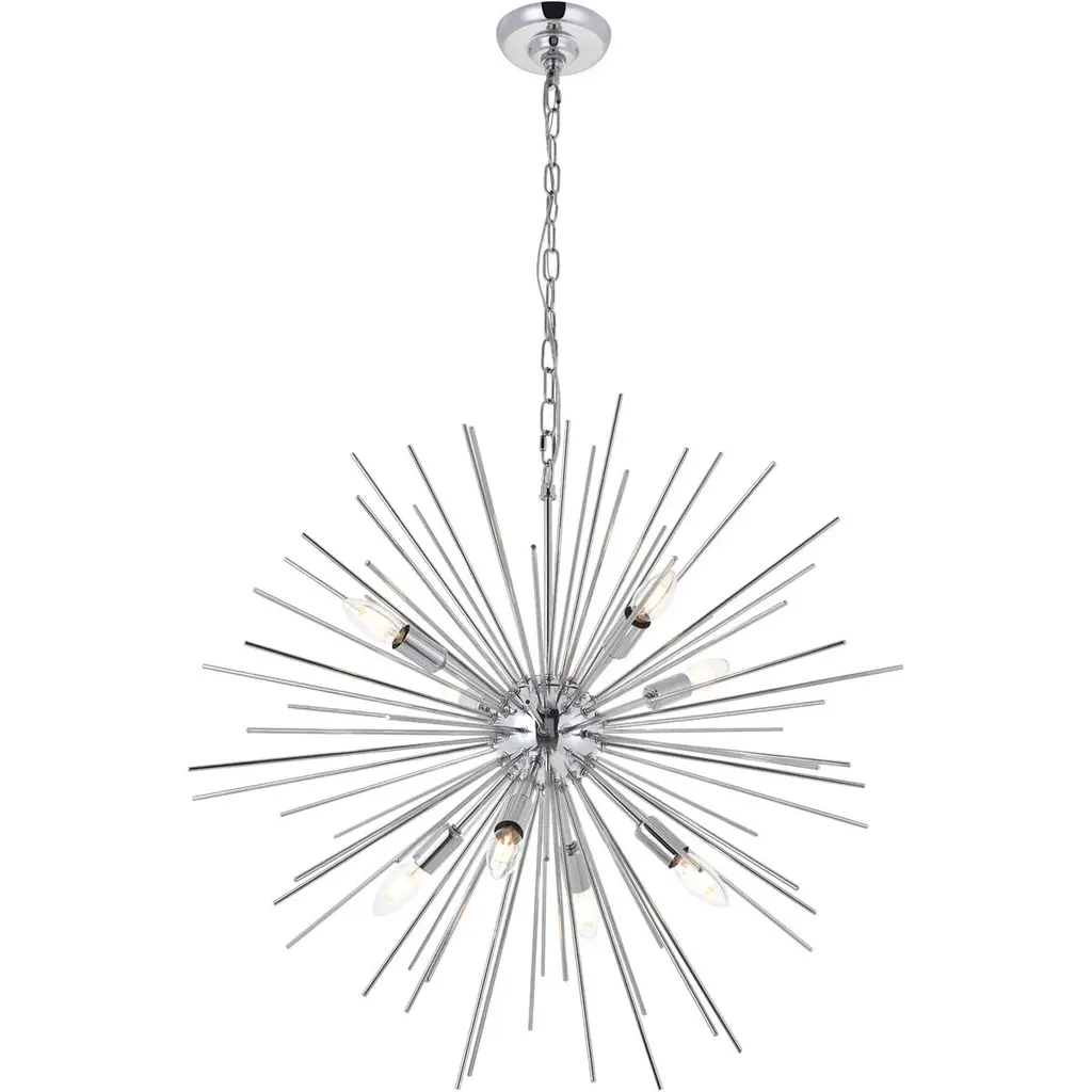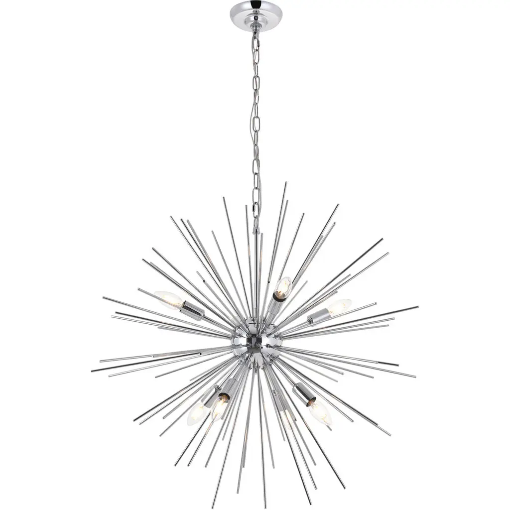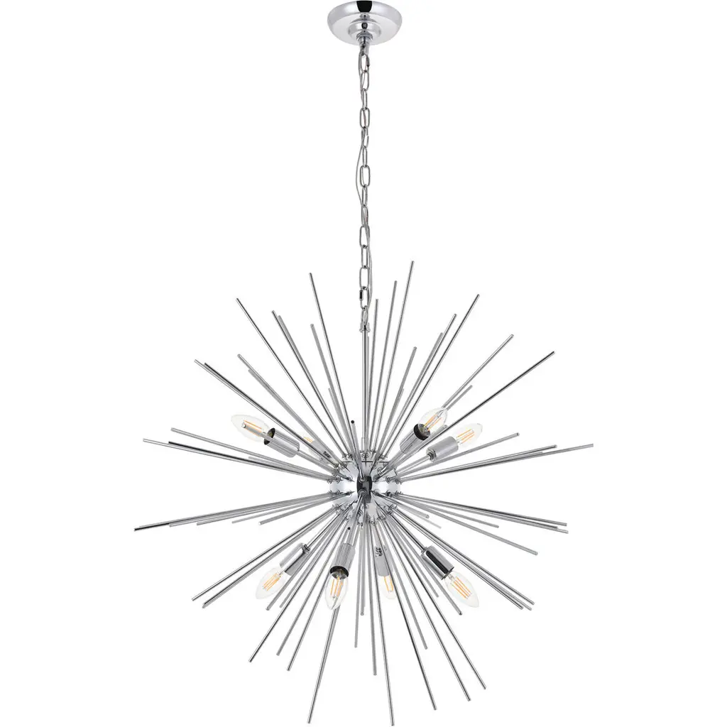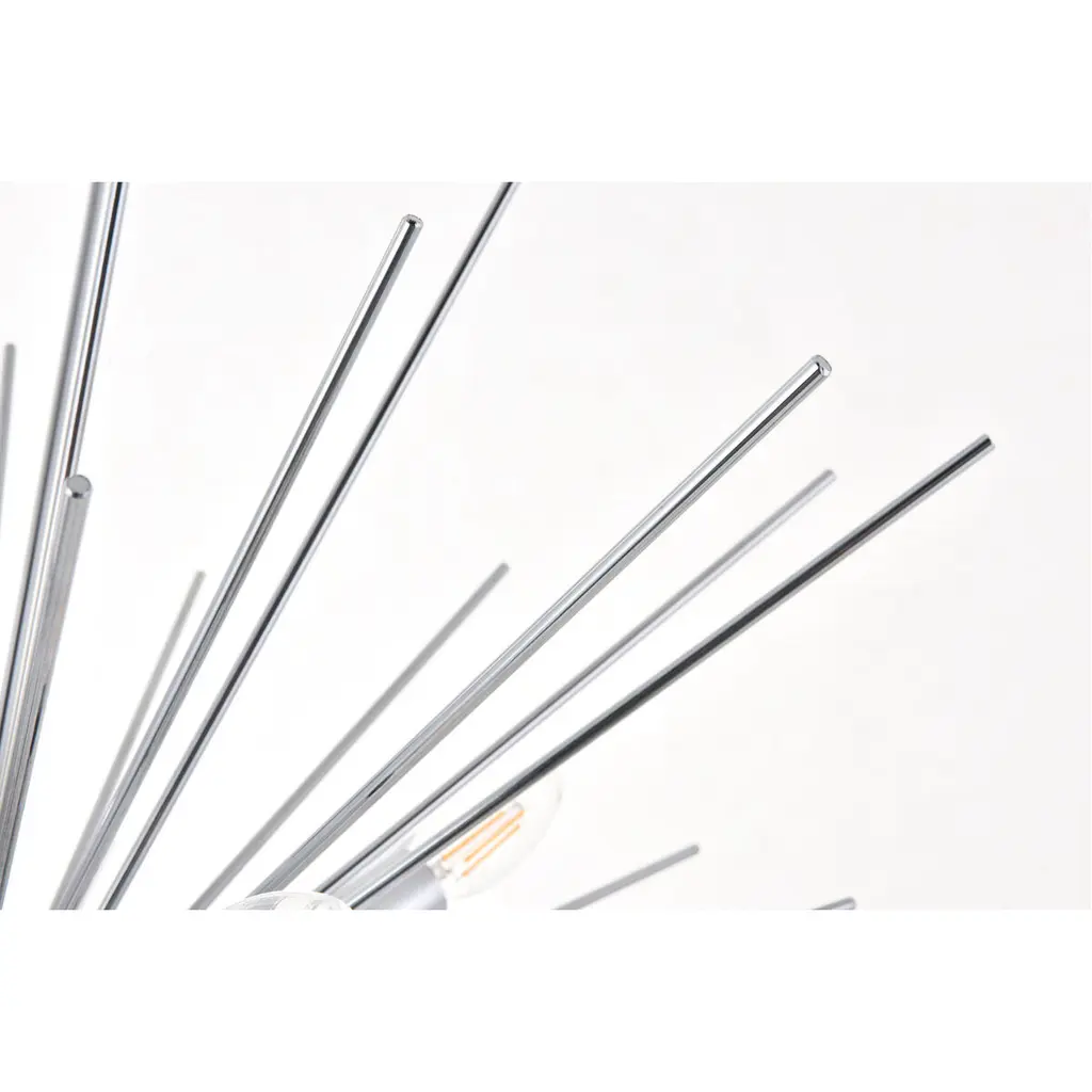 Experience the modern beauty that is the Timber collection pendant lamp in a chrome finish. Its lights are interspersed between a multitude of gleaming slender rods that are as if a firework frozen in mid-air. The contemporary style and unorthodox design makes it a wonderful statement lighting choice for your home--whether it hangs in the entry way, livens up the living room, or sets the mood at your home bar.