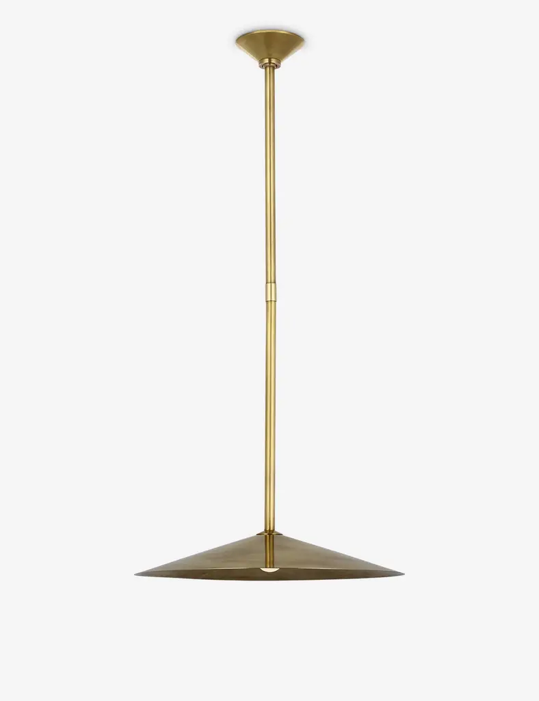 Tinto large pendant by CTO Lighting.Materials: satin brass.Also available in dark bronze shade and finial with satin brass drop rod and ceiling rose,satin brass shade and finial with dark bronze drop rod and ceiling rose,all dark bronze, all satin brass with black silk braided flex,all dark bronze with black silk braided flex.Dimensions: H 100 x D 60 cm All our lamps can be wired according to each country. If sold to the USA it will be wired for the USA for instance.Other sizes available.integrated LED - dimmable - 8w - 2700kweight 9kg (19.8lbs)supplied with 1000mm (39.4”) drop rod as standard (adjustable on site)for installation a minimum of drop of 120mm (4.7”) is required (this is achievedwithout rod), maximum 3000mm (118”)mounts onto 4” junction boxFounded in 1998 by Chris and Clare Turner, CTO Lighting launched their first collection on the guiding principles of designing lights of uncompromising quality, using only the finest materials and working with elite British craftsmen. This collection of lighting symbolised elegance and the excellence of British design and manufacturing; the benchmark for all future collections.