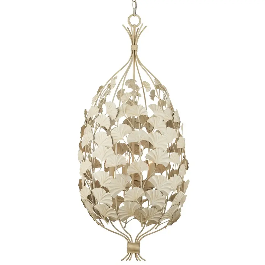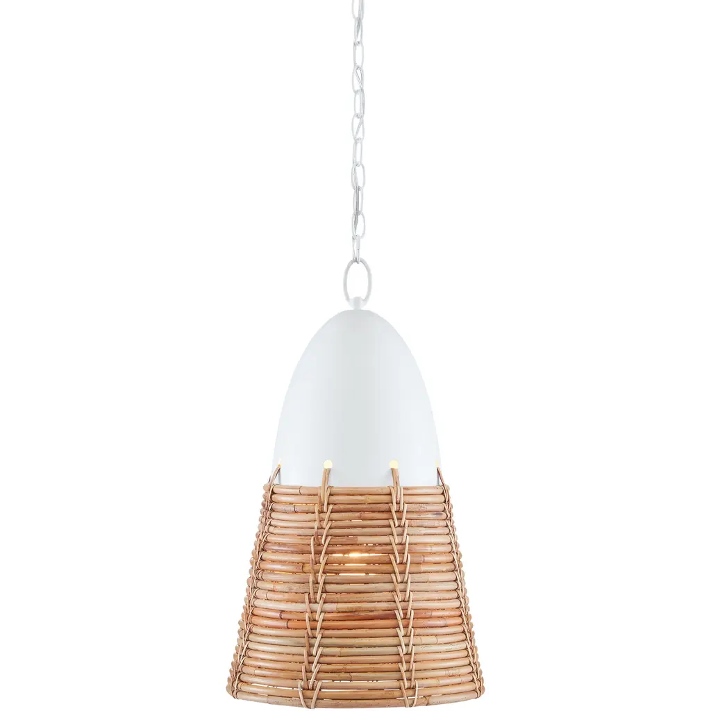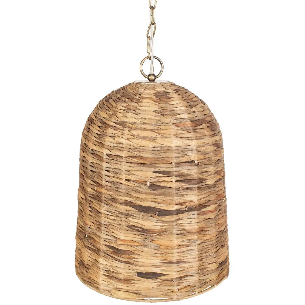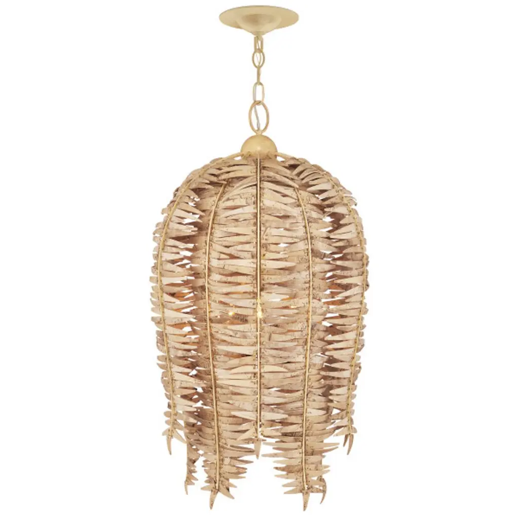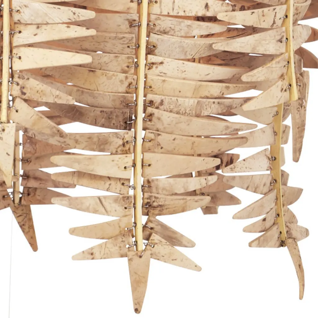 A tremendous amount of effort goes into creating the Tiptur Pendant, as the coconut shells are cut, bleached, drilled, and pinned to the frame by hand to form its bell shape. Tied to thin ribs of wrought iron, the color of the shells blends beautifully with the metal to create a veritable work of art. Adjustable from 34" to 102" with use of included chain/rod kit/cable.