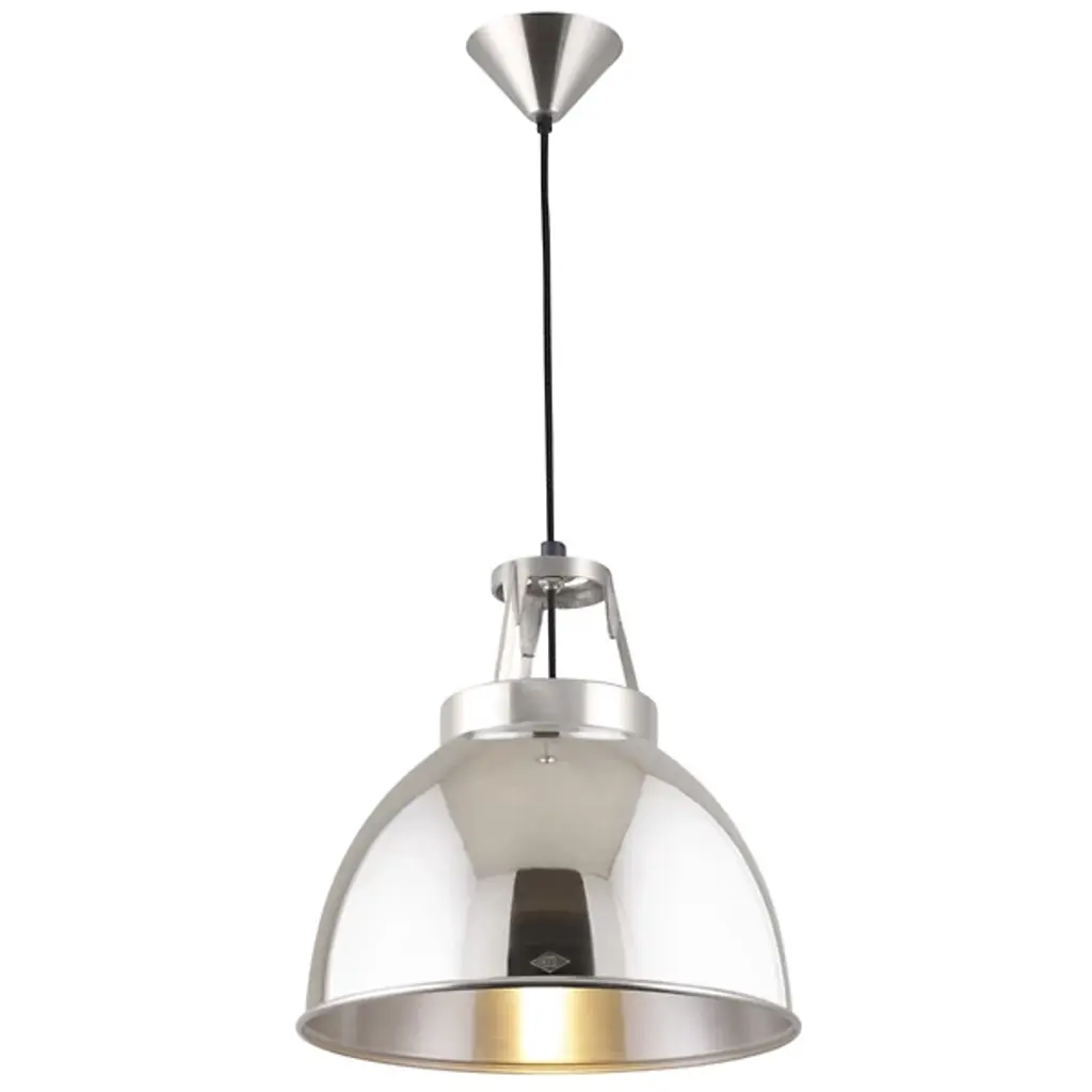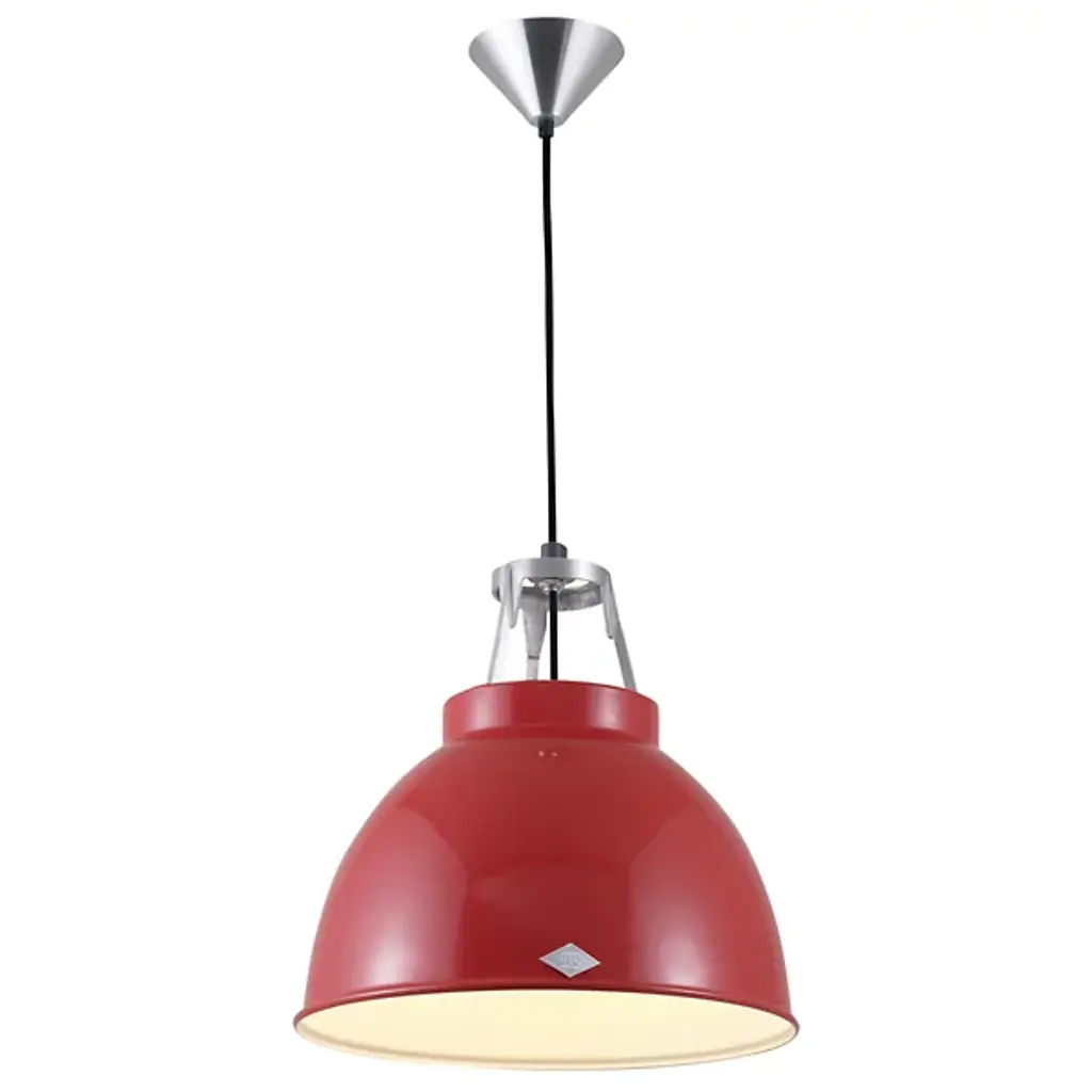 The Original BTC lighting Titan 1 Pendant updates a classic 1940s industrial design with a hand-spun metal shade exclusively crafted in metal workshops of central England. The hard shell is either left in a lightly polished, natural aluminum state or painted, shielding a highly reflective interior which optimizes the amount of down light. Each variation has an open hatch topped with a raw aluminum cage, also spilling light above. The Aluminum finish includes a gridded, etched glass bottom diffuser (or ‘visor’), which will soften the strong task light below.