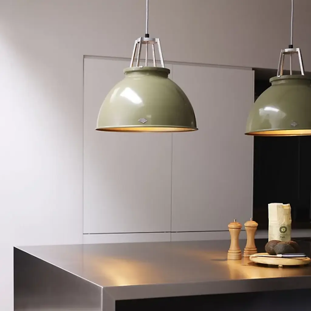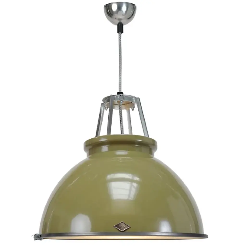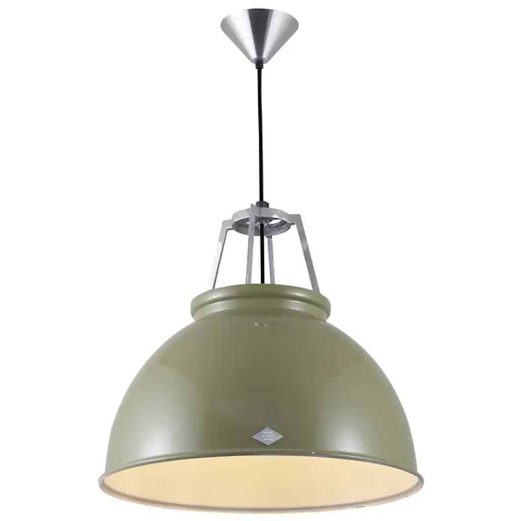 The Original BTC lighting Titan 3 Pendant updates a classic 1940s industrial design with a hand-spun metal shade exclusively crafted in metal workshops of central England. The hard shell is either left in a lightly polished, natural aluminum state or painted, shielding a highly reflective interior which optimizes the amount of down light. Each variation has an open hatch topped with a raw aluminum cage, also spilling light above. The Aluminum finish includes a gridded, etched glass bottom diffuser (or ‘visor’), which will soften the strong task light below.
