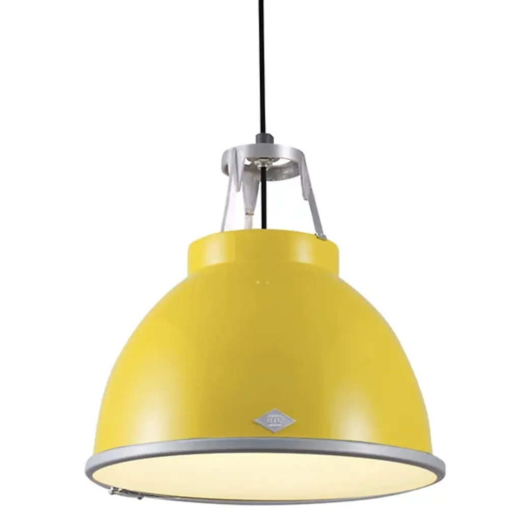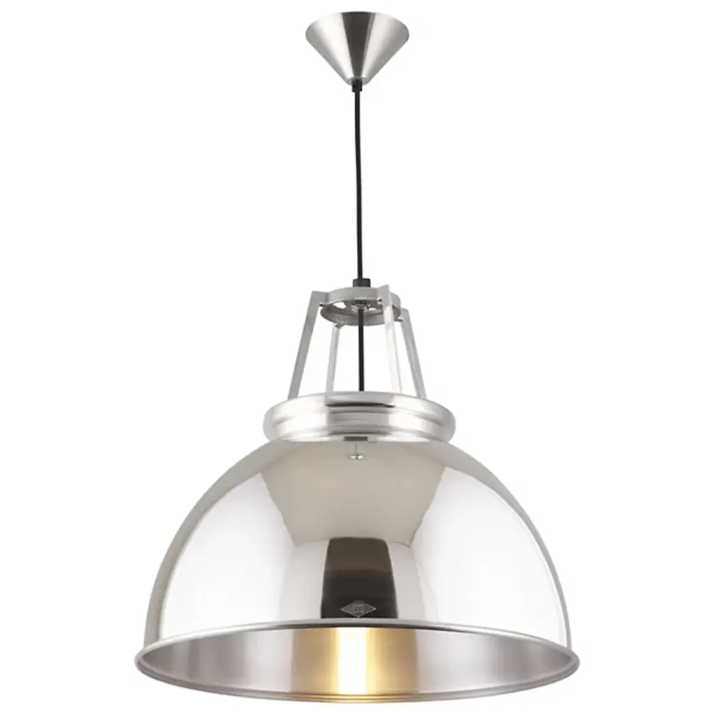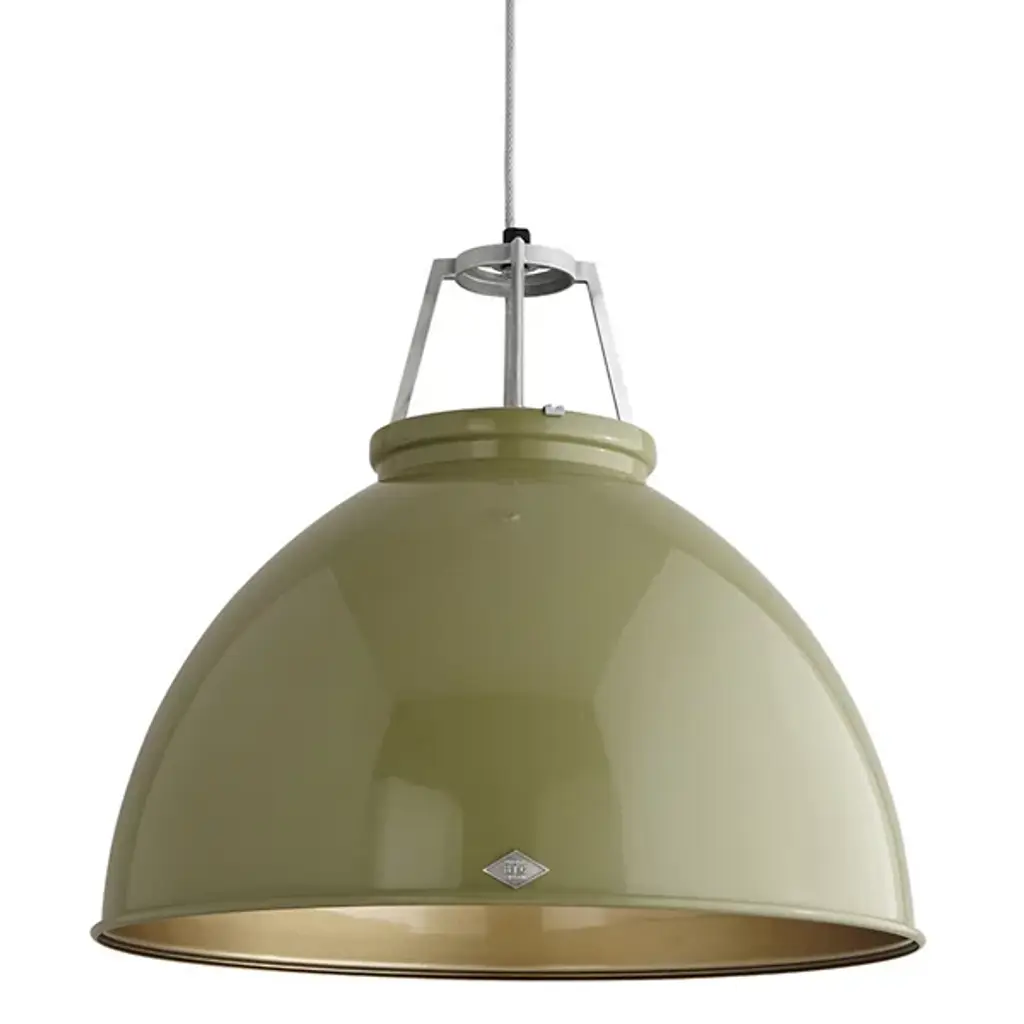The Original BTC lighting Titan 3 Pendant updates a classic 1940s industrial design with a hand-spun metal shade exclusively crafted in metal workshops of central England. The hard shell is either left in a lightly polished, natural aluminum state or painted, shielding a highly reflective interior which optimizes the amount of down light. Each variation has an open hatch topped with a raw aluminum cage, also spilling light above. The Aluminum finish includes a gridded, etched glass bottom diffuser (or ‘visor’), which will soften the strong task light below.