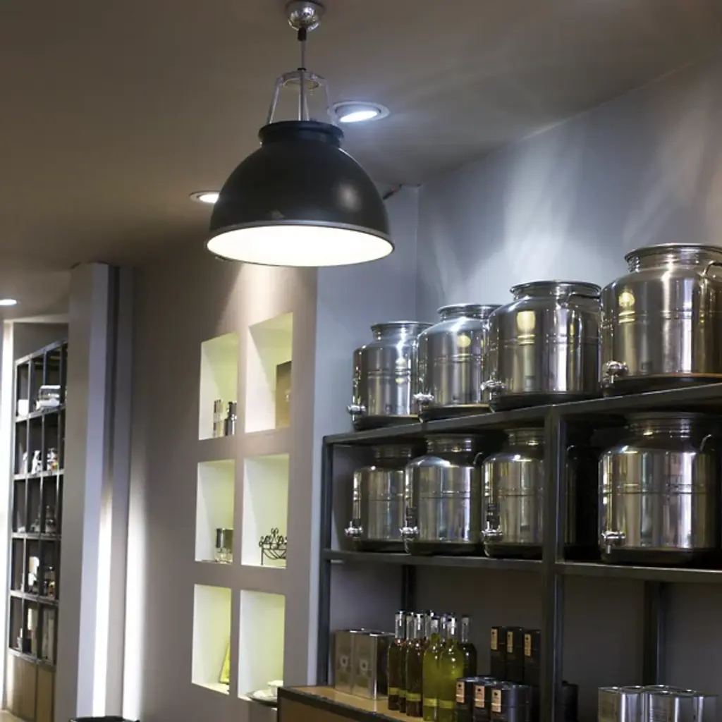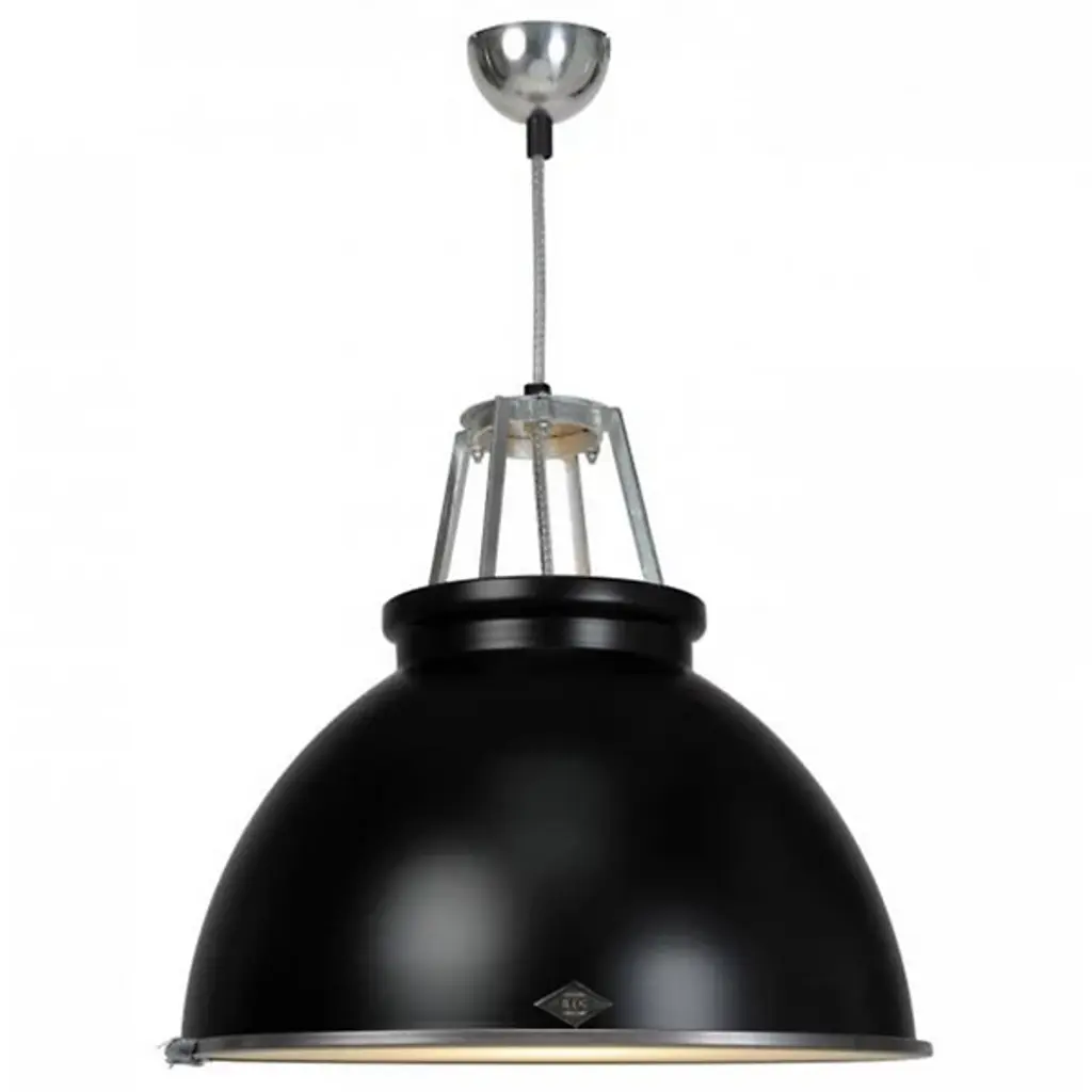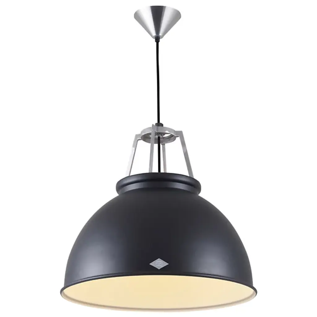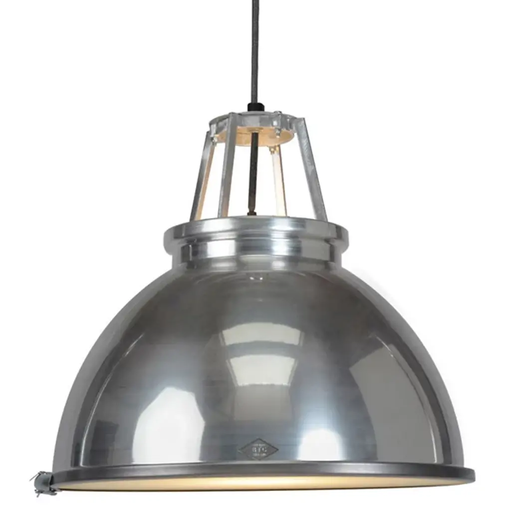 The Original BTC lighting Titan 3 Pendant updates a classic 1940s industrial design with a hand-spun metal shade exclusively crafted in metal workshops of central England. The hard shell is either left in a lightly polished, natural aluminum state or painted, shielding a highly reflective interior which optimizes the amount of down light. Each variation has an open hatch topped with a raw aluminum cage, also spilling light above. The Aluminum finish includes a gridded, etched glass bottom diffuser (or ‘visor’), which will soften the strong task light below.