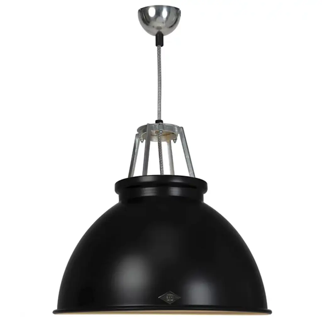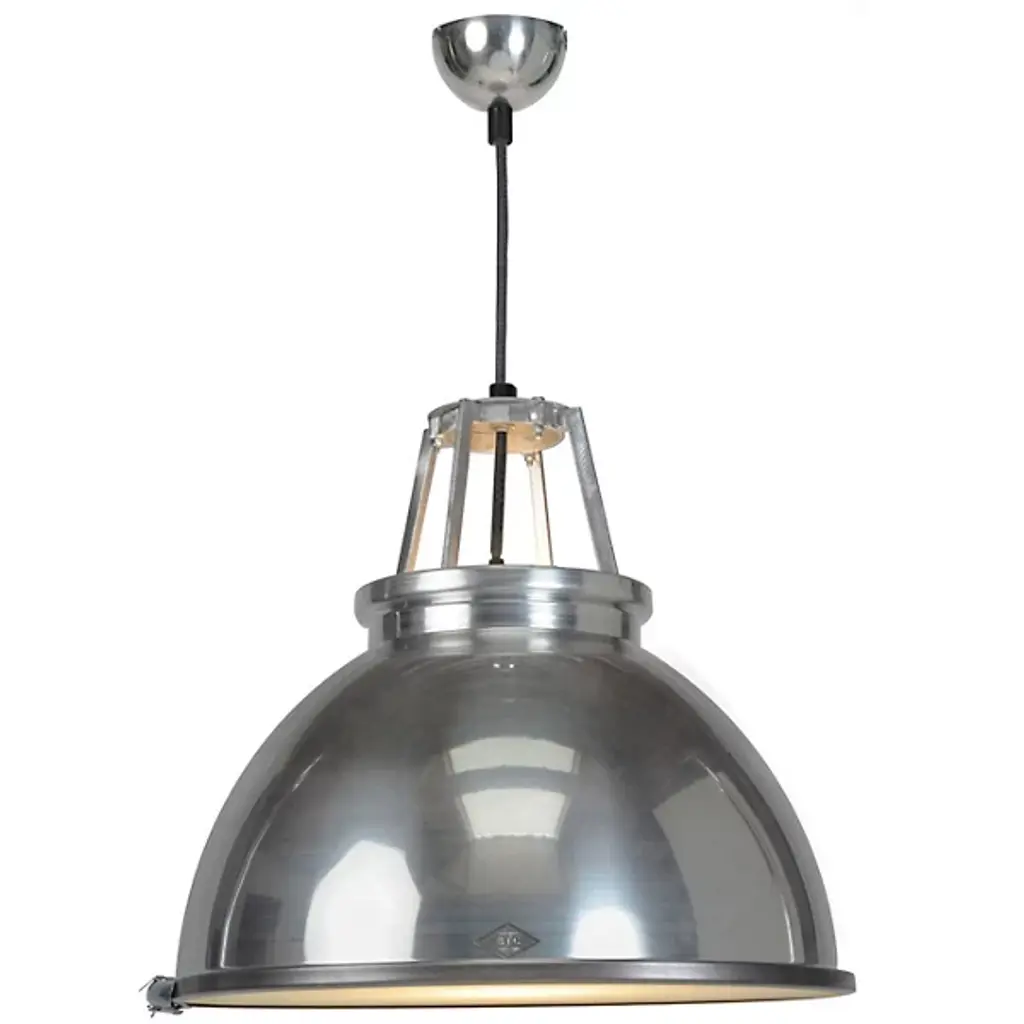 The Original BTC lighting Titan 3 Pendant updates a classic 1940s industrial design with a hand-spun metal shade exclusively crafted in metal workshops of central England. The hard shell is either left in a lightly polished, natural aluminum state or painted, shielding a highly reflective interior which optimizes the amount of down light. Each variation has an open hatch topped with a raw aluminum cage, also spilling light above. The Aluminum finish includes a gridded, etched glass bottom diffuser (or ‘visor’), which will soften the strong task light below.