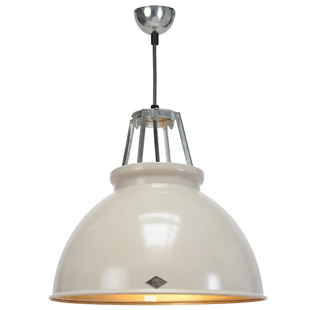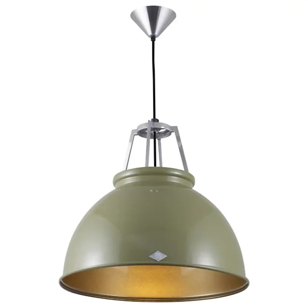 The Original BTC lighting Titan 3 Pendant updates a classic 1940s industrial design with a hand-spun metal shade exclusively crafted in metal workshops of central England. The hard shell is either left in a lightly polished, natural aluminum state or painted, shielding a highly reflective interior which optimizes the amount of down light. Each variation has an open hatch topped with a raw aluminum cage, also spilling light above. The Aluminum finish includes a gridded, etched glass bottom diffuser (or ‘visor’), which will soften the strong task light below.