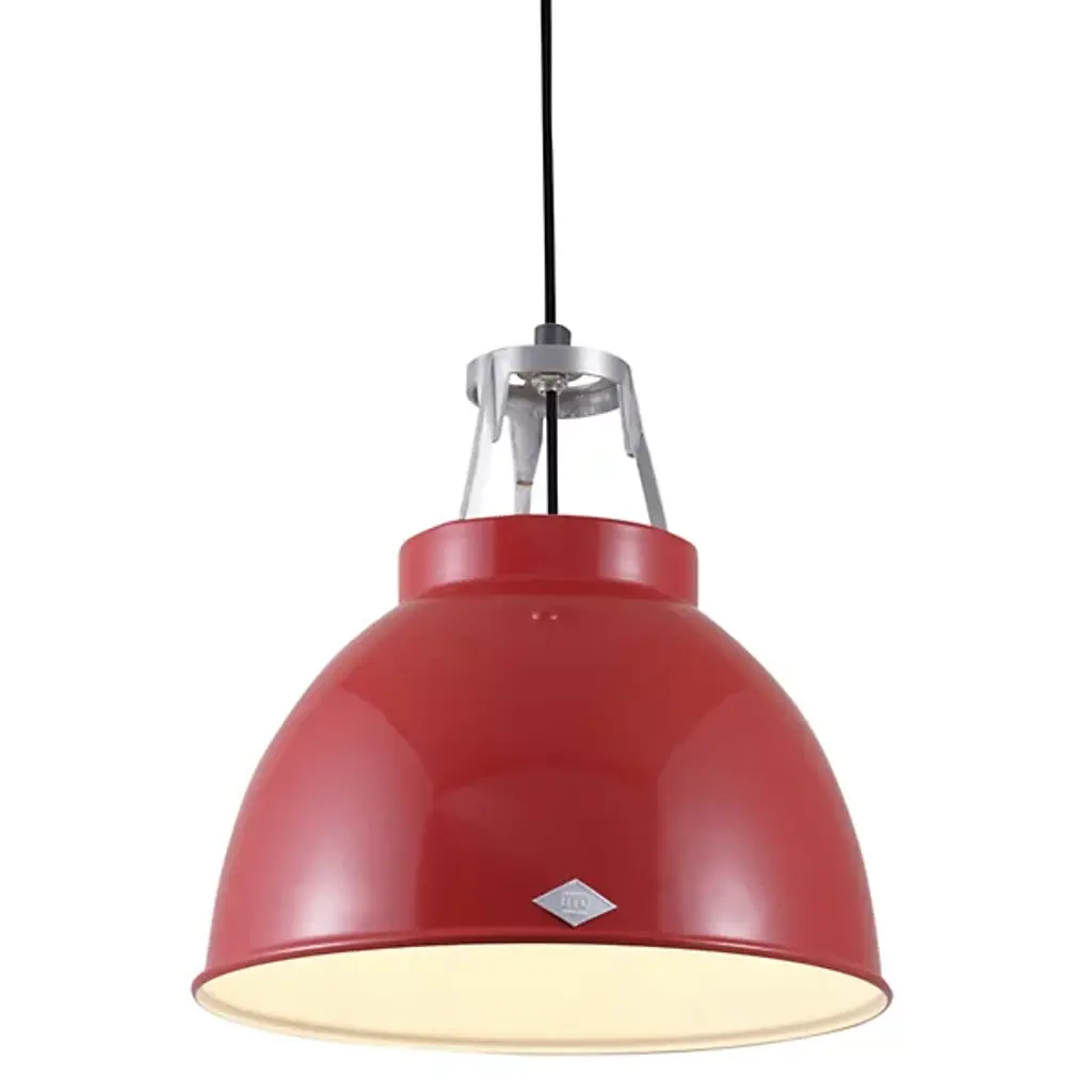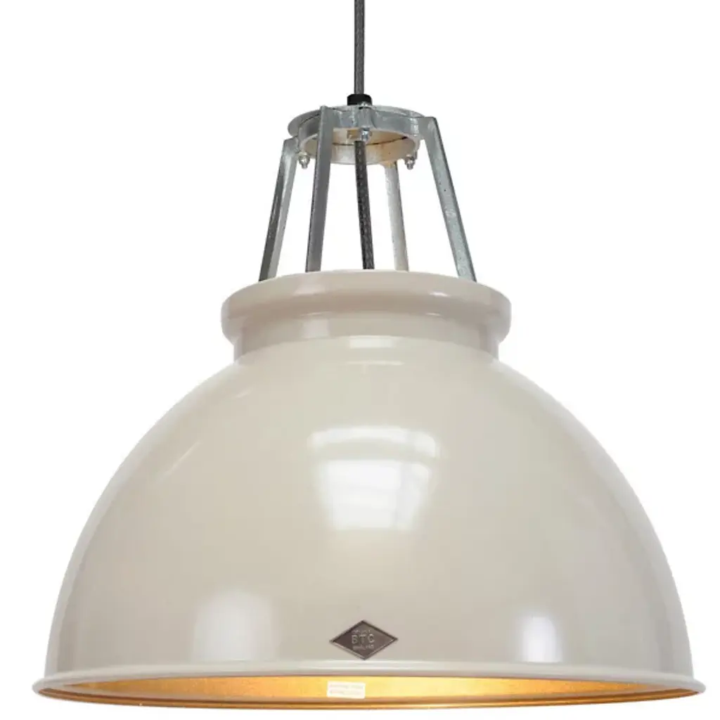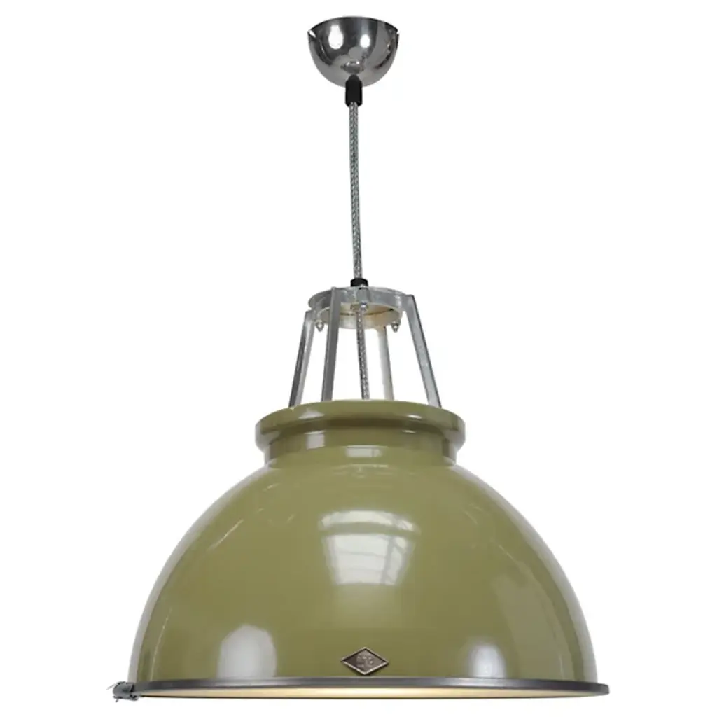 The Original BTC lighting Titan 3 Pendant updates a classic 1940s industrial design with a hand-spun metal shade exclusively crafted in metal workshops of central England. The hard shell is either left in a lightly polished, natural aluminum state or painted, shielding a highly reflective interior which optimizes the amount of down light. Each variation has an open hatch topped with a raw aluminum cage, also spilling light above. The Aluminum finish includes a gridded, etched glass bottom diffuser (or ‘visor’), which will soften the strong task light below.