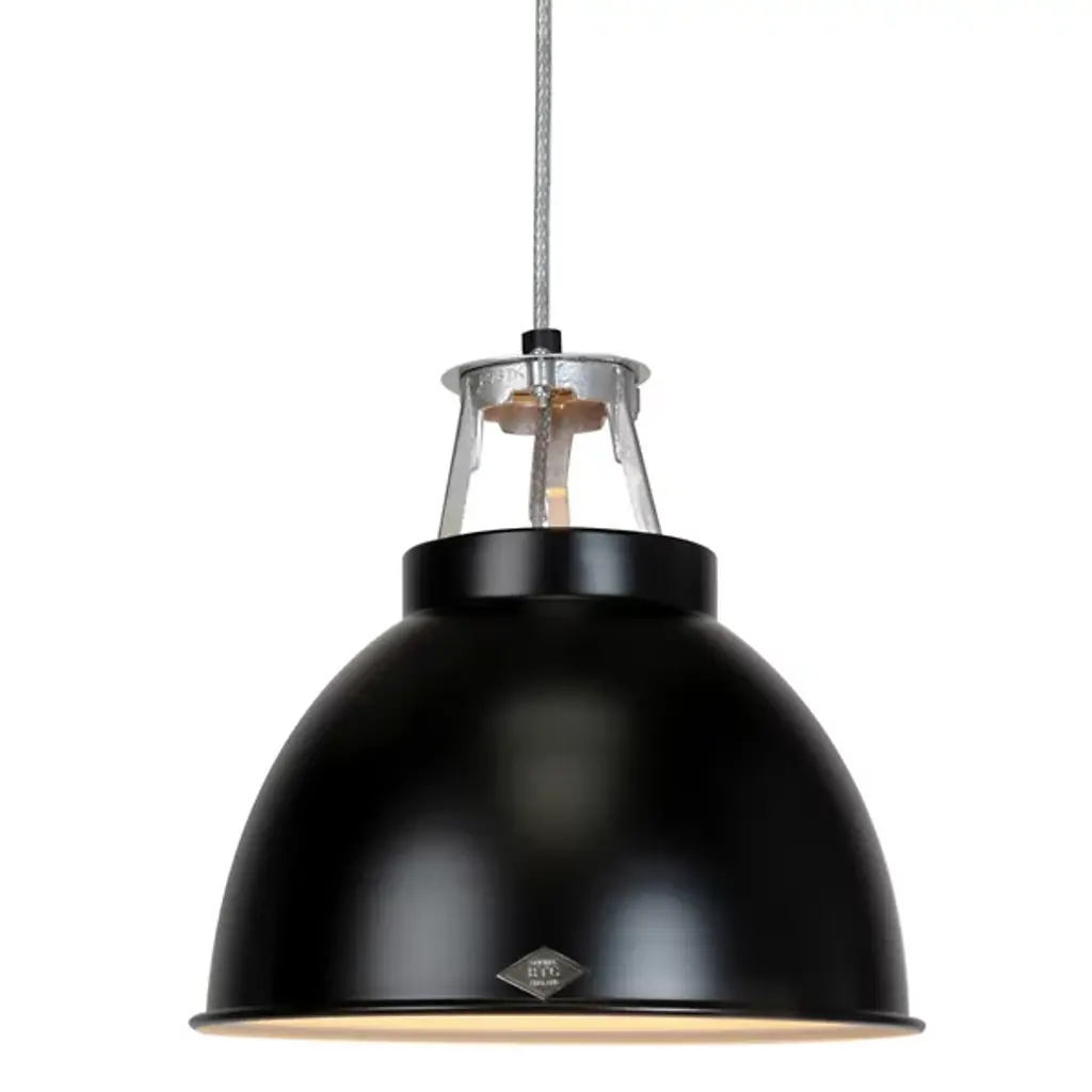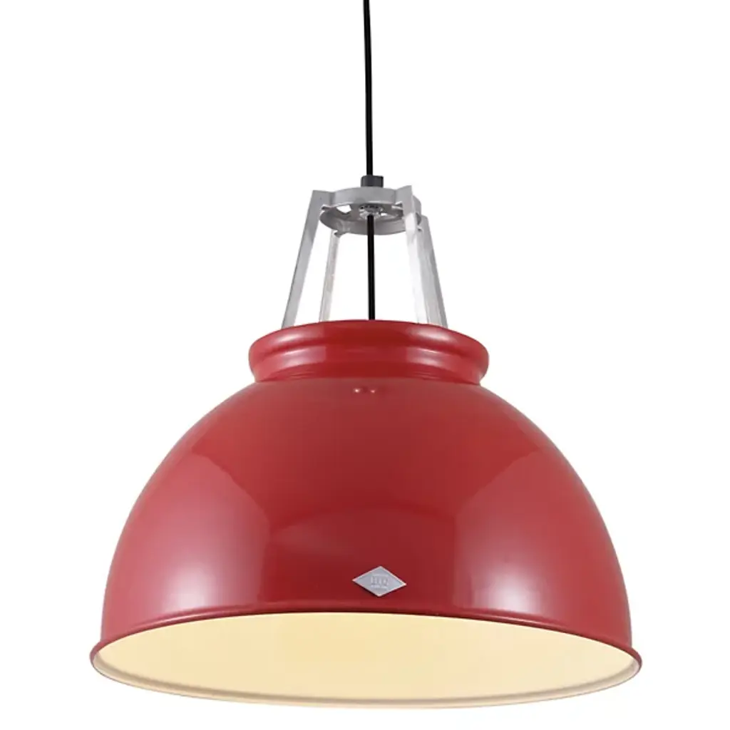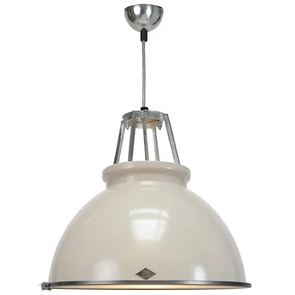 The Original BTC lighting Titan 3 Pendant updates a classic 1940s industrial design with a hand-spun metal shade exclusively crafted in metal workshops of central England. The hard shell is either left in a lightly polished, natural aluminum state or painted, shielding a highly reflective interior which optimizes the amount of down light. Each variation has an open hatch topped with a raw aluminum cage, also spilling light above. The Aluminum finish includes a gridded, etched glass bottom diffuser (or ‘visor’), which will soften the strong task light below.