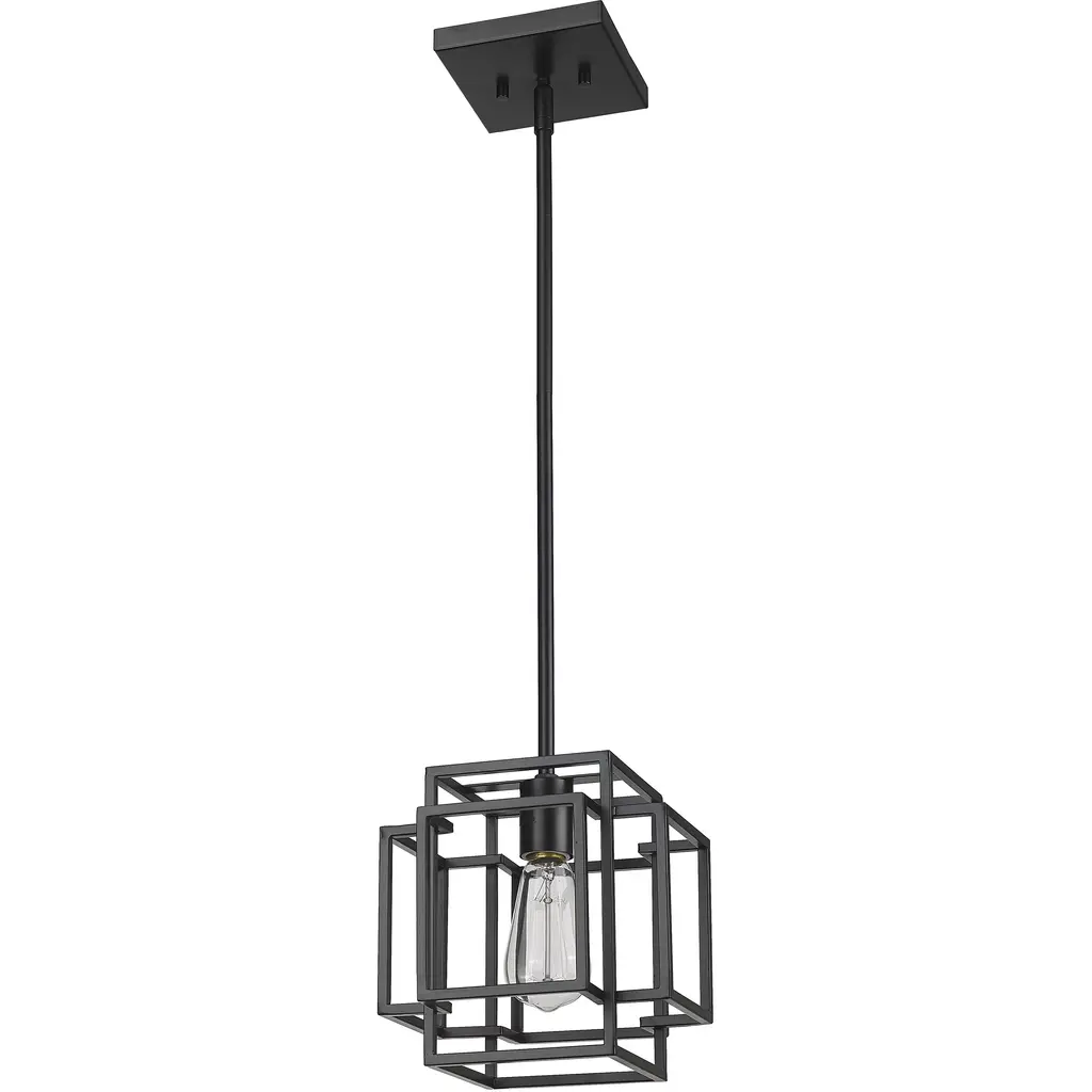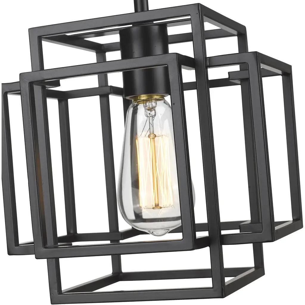 A matte black finish steel cage casts a striking silhouette to this contemporary mini pendant, offering a daring tesseract-like geometric design for modernized transitional interiors and the perfect amount of glow over kitchen islands, countertops and more. The sharply angled steel cage pushes the minimalist modern artisan feel, reminiscent of the Frank Lloyd Wright style and the Arts and Crafts architectural era. The open and airy cage design also invites you to showcase an exposed old-world style Edison bulb for glow and ambiance that is more pleasing to the eye.