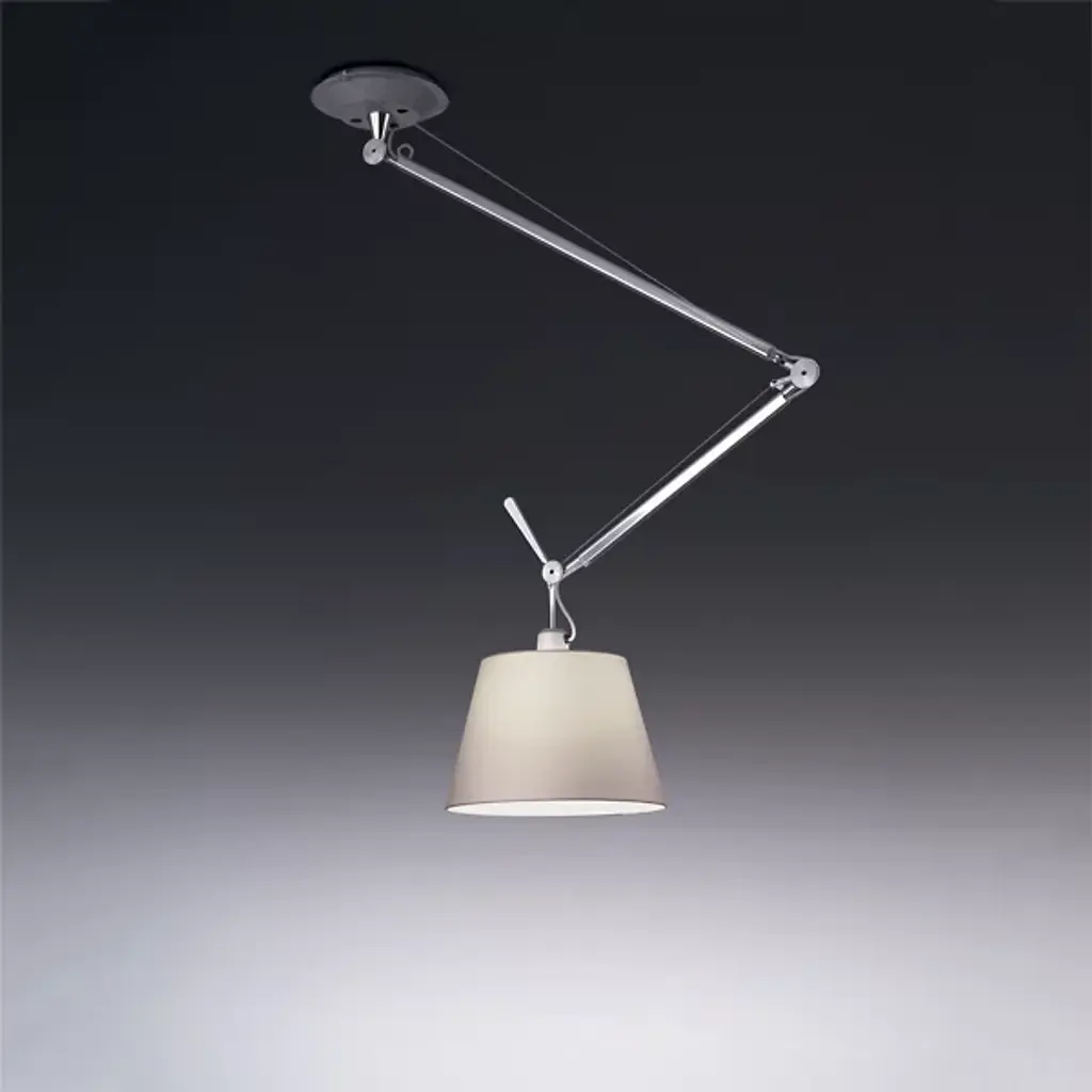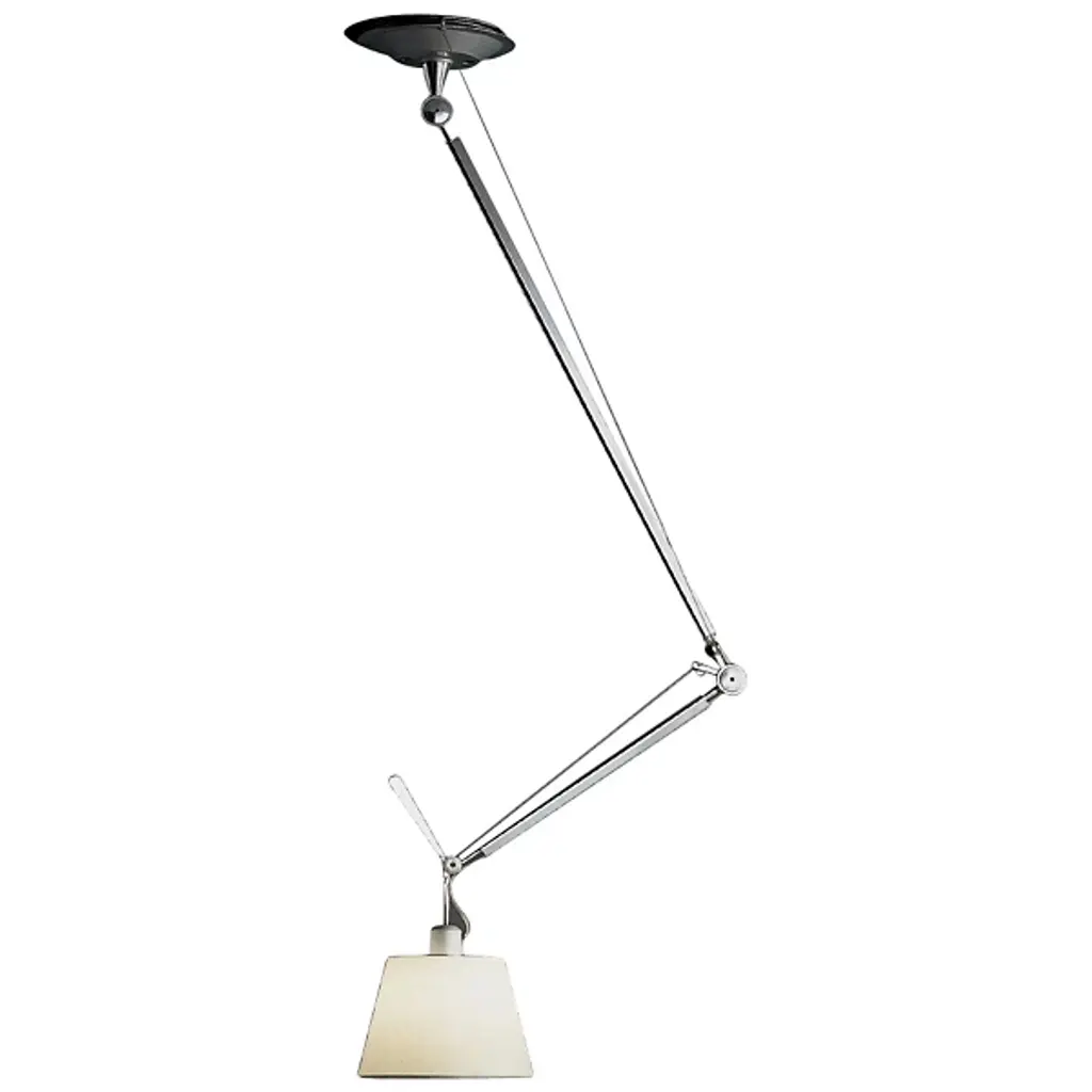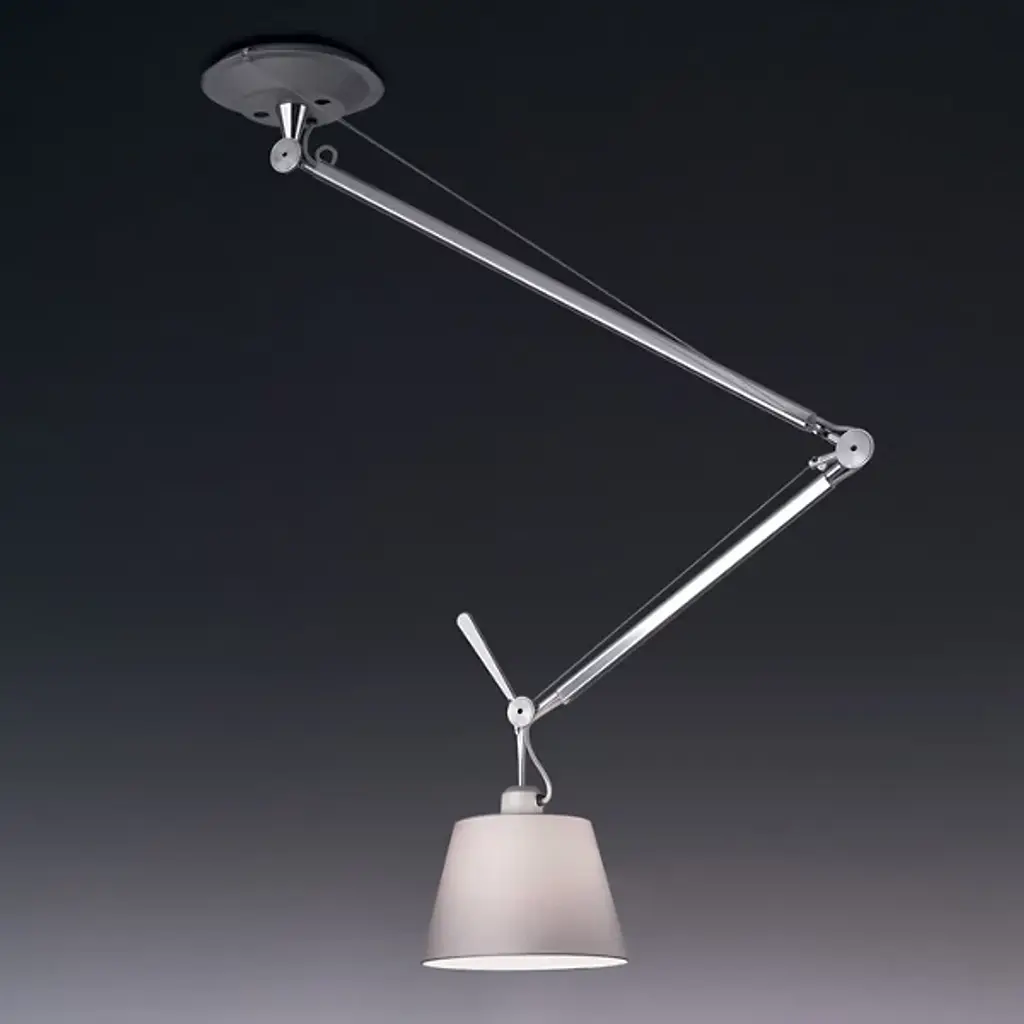 The Artemide Tolomeo Off Center Pendant was designed by Michele De Lucchi and Giancarlo Fassina to shed its bright light more than five feet in any direction, with a fully articulating polished aluminum arm extending from a rotatable ceiling canopy.