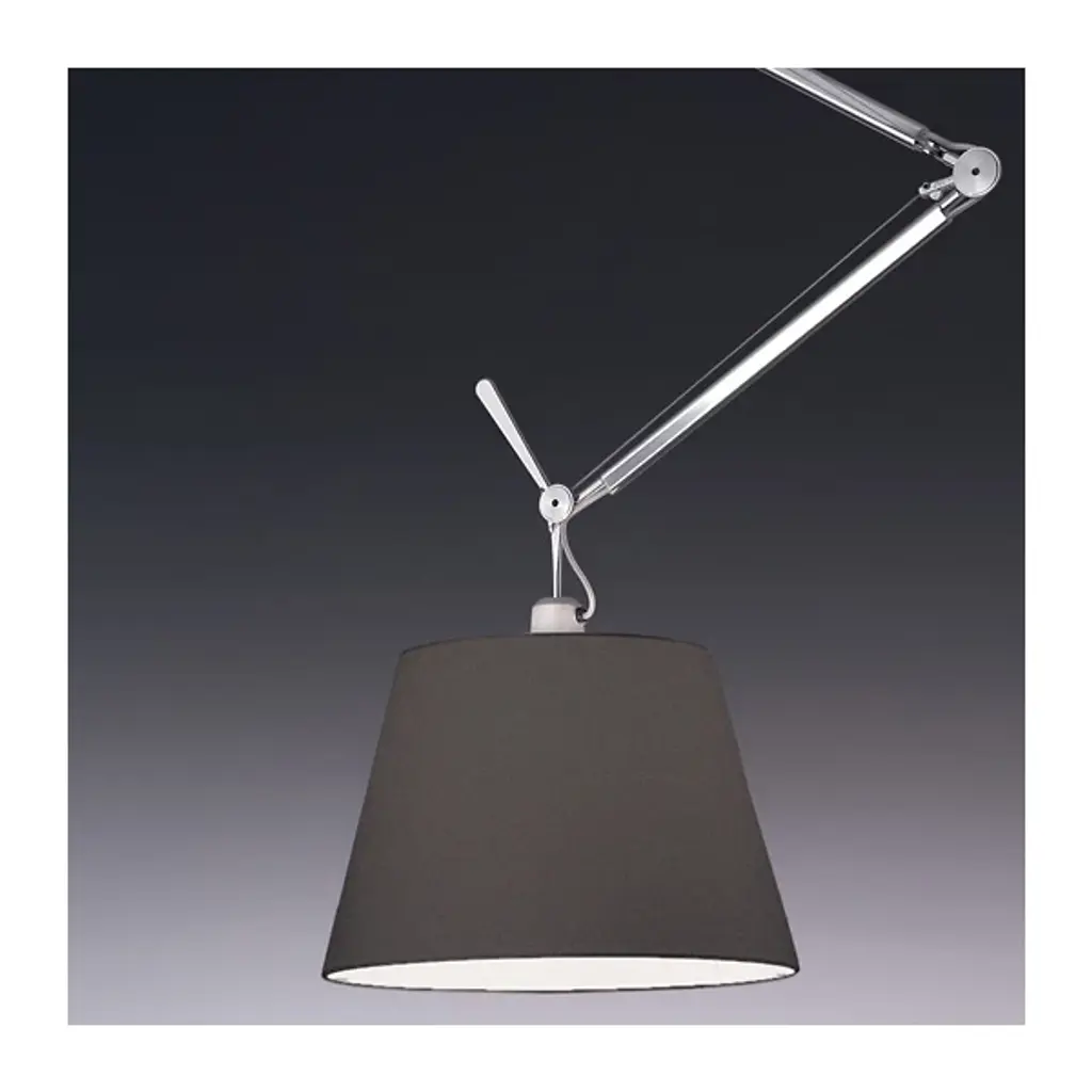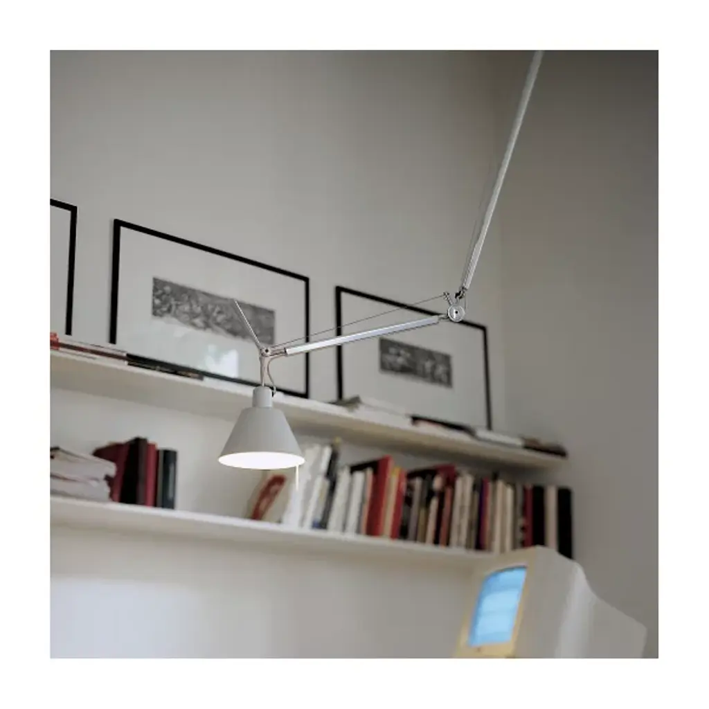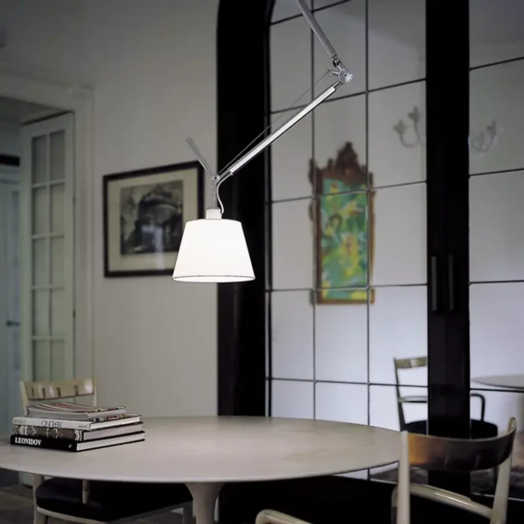 The Artemide Tolomeo Off Center Pendant was designed by Michele De Lucchi and Giancarlo Fassina to shed its bright light more than five feet in any direction, with a fully articulating polished aluminum arm extending from a rotatable ceiling canopy.