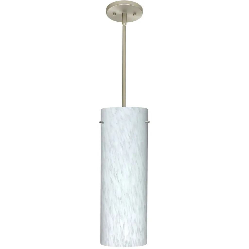 Tondo 18 is a classic open-ended cylinder of handcrafted glass, a shape that will stand the test of time. Our Carrera glass is a classic yet modern décor that gives off a soft white light. Clear molten glass is rolled in alabaster powder like frit, and then blown into shape with a semi-clear frosted white inner finish. This décor is created by rolling molten glass in small bits of white called frit. The smooth satin finish on the clear outer layer is a result of an extensive etching process. This blown glass is handcrafted by a skilled artisan, utilizing century-old techniques passed down from generation to generation. Each piece of this décor has its own artistic nature that can be individually appreciated. The stem pendant fixture is equipped with an adjustable telescoping section, 4 connectable stem sections (3", 6", 12", and 18") and low Profile flat monopoint canopy. These stylish and functional luminaries are offered in a beautiful Satin Nickel finish.
