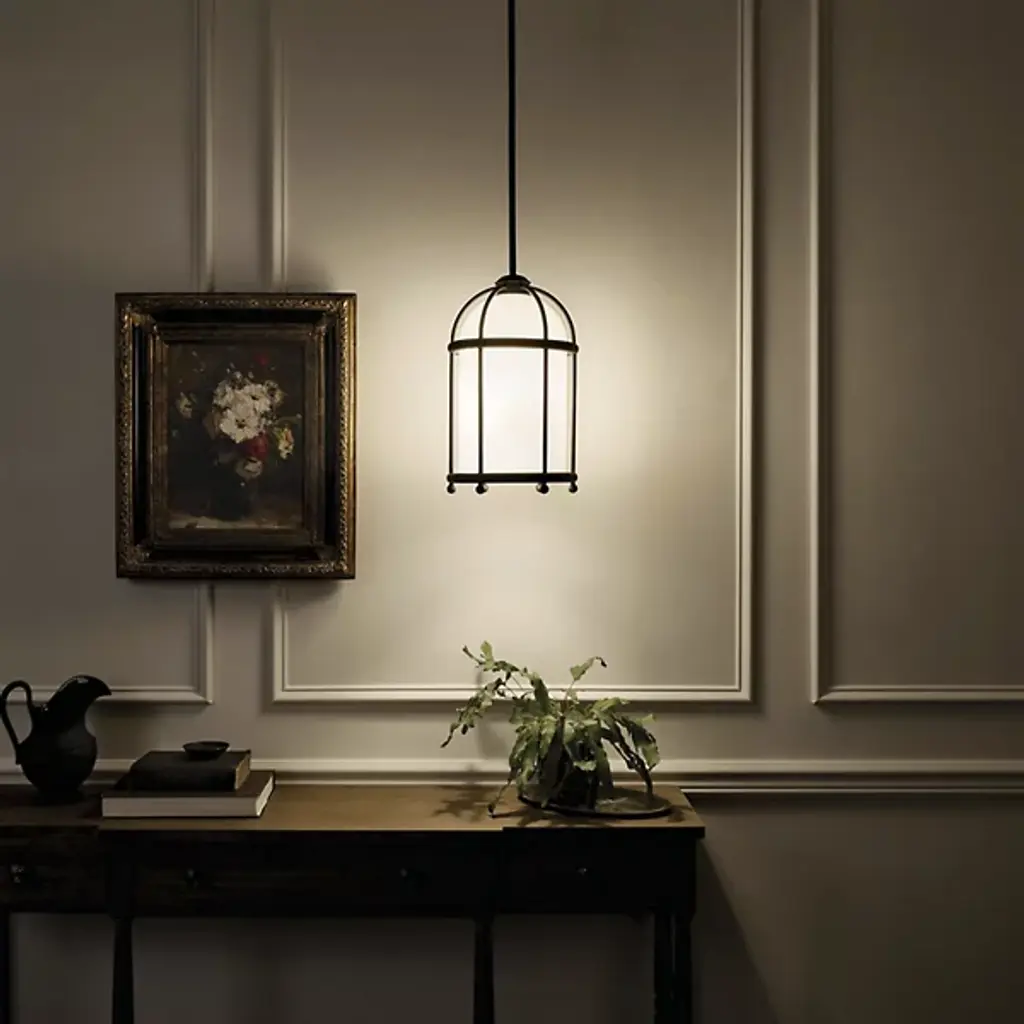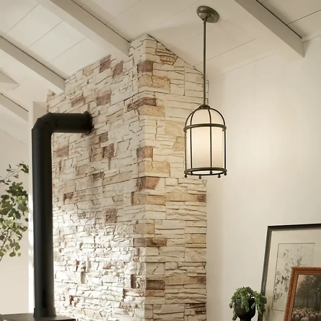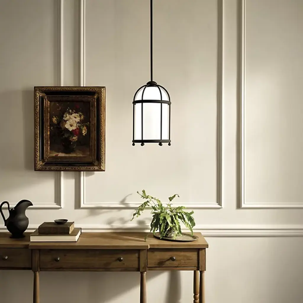 The Topiary Pendant by Kichler illuminates your home while bringing a transitional aesthetic to your living space. An ovular shade of opal glass is beautifully encased by a frame of steel. This pendant maintains suspension in midair through attachment to a downrod extending from a ceiling canopy. A halogen bulb rests inside of the pendant’s shade, allowing bright light to easily diffuse throughout your environment. Take control of your light’s brightness level when you pair the Topiary Pendant with a standard dimmer.