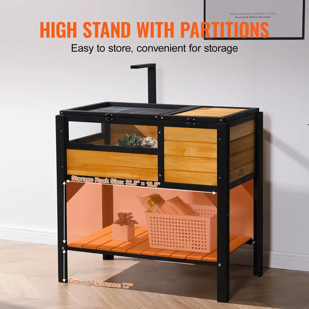 Spacious Double-Level Design: With Roof option: Our tortoise house features two floors with 3 rooms. The upper level includes a house-shaped, secluded sleeping area and a sunbathing balcony. The ground level offers an expansive activity area. Metal ramps connect the floors, allowing the tortoise to move freely. Multi-level design maximizes space without taking up too much floor area. With Light Stand Fully transparent option:Our tortoise house features two separate areas: a private sleeping zone with a solid wood top and an open activity space with a metal mesh window. Measuring 33"x19.7"x32.5"/850x500x825 mm, with a leg frame featuring a heavy-duty storage shelf, you can conveniently store pet food and other supplies, making feeding easy and space-efficient! With Light Stand Translucent option:With a large size of 38"x24"x32.5"/965x610x825 mm and a high stand with lockable wheels, it's perfect for indoor and outdoor use. With no Light Stand option: Measuring 38"x24"x13"/965x610x330 mm, it provides ample room for your pet's daily rest and play, ideal for tortoises, lizards, geckos, snakes, and other reptiles! 100% Cedar Construction: Crafted from high-quality cedar wood, this tortoise habitat is sturdy and durable with a tight grain that resists warping. Coated with water-based paint, it is waterproof, ensuring a safe and comfortable living environment for your pet. User-Friendly Design: With roof option: For ease of interaction and communication with your pet, both the sleeping and activity areas have removable lids. The metal mesh railing on the upper balcony allows for close observation of your tortoise. Secure locks prevent escape, providing peace of mind. / For other options:To support your pet's health and your convenience, the tortoise enclosure includes a hanging light stand for heating control. The top covers two areas open for easy interaction, and high-transparency ABS side panels allow close observation. A locking latch prevents escapes, giving you peace of mind. Easy-Clean Plastic Tray: The fully covered plastic tray prevents it from damaging the wood, extending the enclosure's lifespan. Its easy-to-clean surface requires a quick wipe with a damp cloth, keeping the interior clean and promoting your pet's well-being. Simple Assembly: Designed for easy setup, the turtle enclosure includes pre-drilled holes and assembly instructions. Even if you've never assembled similar products, you can effortlessly assemble them and provide a sturdy, comfortable home for your pet! With roof option Package Content 1 x Wooden Tortoise House 1 x Screws Set 14 x Wood Strips Ø8*20mm 1 x Latch 1 x Black Drawstring Bag 1 x Instruction Manual Package Content 1 x Wooden Tortoise House 1 x Instruction Manual 1 x Screws Set 2 x Black Bow Shaped Latches (Translucent option) / 3 x Black Bow Shaped Latches (Fully transparent option) 4 x Wheels(2 Lockable) (only for with Light Stand Fully transparent option)