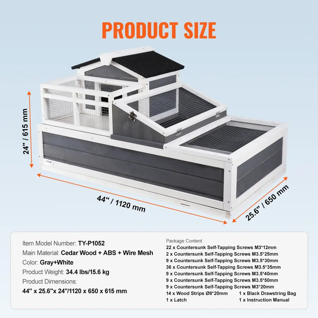 Spacious Double-Level Design: With Roof option: Our tortoise house features two floors with 3 rooms. The upper level includes a house-shaped, secluded sleeping area and a sunbathing balcony. The ground level offers an expansive activity area. Metal ramps connect the floors, allowing the tortoise to move freely. Multi-level design maximizes space without taking up too much floor area. With Light Stand Fully transparent option:Our tortoise house features two separate areas: a private sleeping zone with a solid wood top and an open activity space with a metal mesh window. Measuring 33"x19.7"x32.5"/850x500x825 mm, with a leg frame featuring a heavy-duty storage shelf, you can conveniently store pet food and other supplies, making feeding easy and space-efficient! With Light Stand Translucent option:With a large size of 38"x24"x32.5"/965x610x825 mm and a high stand with lockable wheels, it's perfect for indoor and outdoor use. With no Light Stand option: Measuring 38"x24"x13"/965x610x330 mm, it provides ample room for your pet's daily rest and play, ideal for tortoises, lizards, geckos, snakes, and other reptiles! 100% Cedar Construction: Crafted from high-quality cedar wood, this tortoise habitat is sturdy and durable with a tight grain that resists warping. Coated with water-based paint, it is waterproof, ensuring a safe and comfortable living environment for your pet. User-Friendly Design: With roof option: For ease of interaction and communication with your pet, both the sleeping and activity areas have removable lids. The metal mesh railing on the upper balcony allows for close observation of your tortoise. Secure locks prevent escape, providing peace of mind. / For other options:To support your pet's health and your convenience, the tortoise enclosure includes a hanging light stand for heating control. The top covers two areas open for easy interaction, and high-transparency ABS side panels allow close observation. A locking latch prevents escapes, giving you peace of mind. Easy-Clean Plastic Tray: The fully covered plastic tray prevents it from damaging the wood, extending the enclosure's lifespan. Its easy-to-clean surface requires a quick wipe with a damp cloth, keeping the interior clean and promoting your pet's well-being. Simple Assembly: Designed for easy setup, the turtle enclosure includes pre-drilled holes and assembly instructions. Even if you've never assembled similar products, you can effortlessly assemble them and provide a sturdy, comfortable home for your pet! With roof option Package Content 1 x Wooden Tortoise House 1 x Screws Set 14 x Wood Strips Ø8*20mm 1 x Latch 1 x Black Drawstring Bag 1 x Instruction Manual Package Content 1 x Wooden Tortoise House 1 x Instruction Manual 1 x Screws Set 2 x Black Bow Shaped Latches (Translucent option) / 3 x Black Bow Shaped Latches (Fully transparent option) 4 x Wheels(2 Lockable) (only for with Light Stand Fully transparent option)