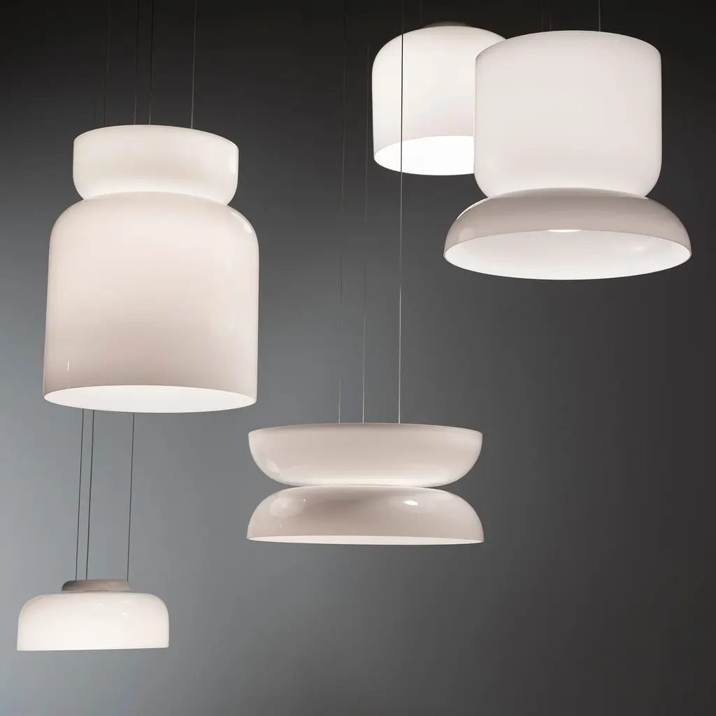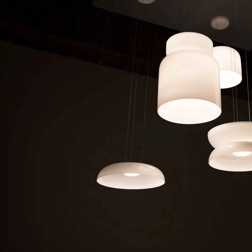 The single downlight version of Totem offers a choice of 4 different shade styles in exquisitely blown opal glass. Pablo Designs' pendant provides both direct and indirect illumination by employing a 2-part LED light engine that provides both uplight and downlight for a warm and dimmable ambient glow. Each of the soft, pure-white geometric forms provides warmth and elegance to any space, both deployed singly and in site-specific personalized combinations.