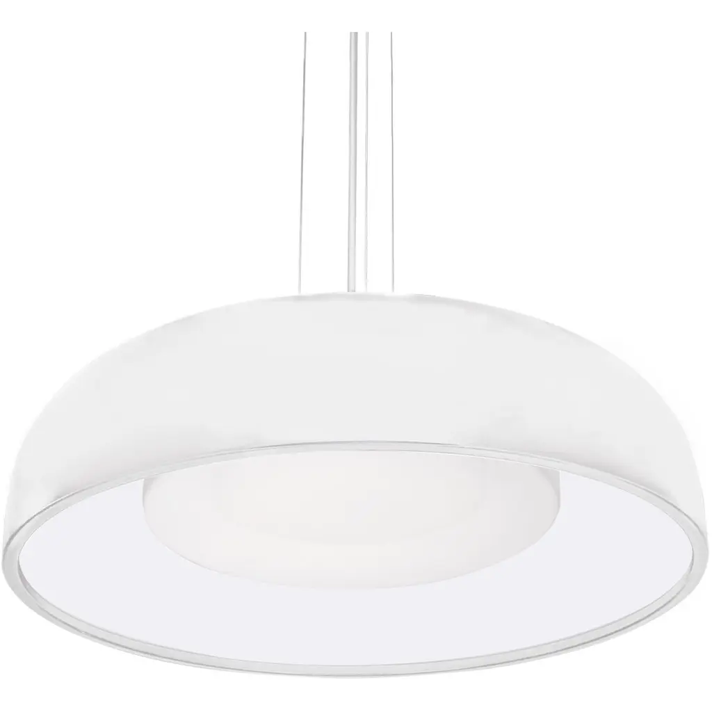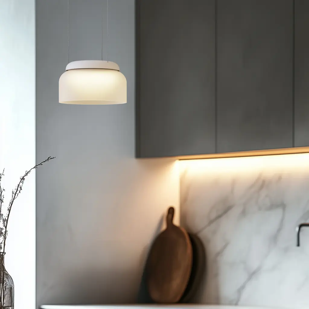 The pendant light features a hand-blown opal glass shade that emits a soft, diffused glow. It utilizes a high-output LED array consuming 13W of power to deliver 1,400 lumens. The dim-to-warm function allows adjustment of the color temperature from 2,700K to 2,200K. Fully dimmable and equipped with a 10-foot cable.