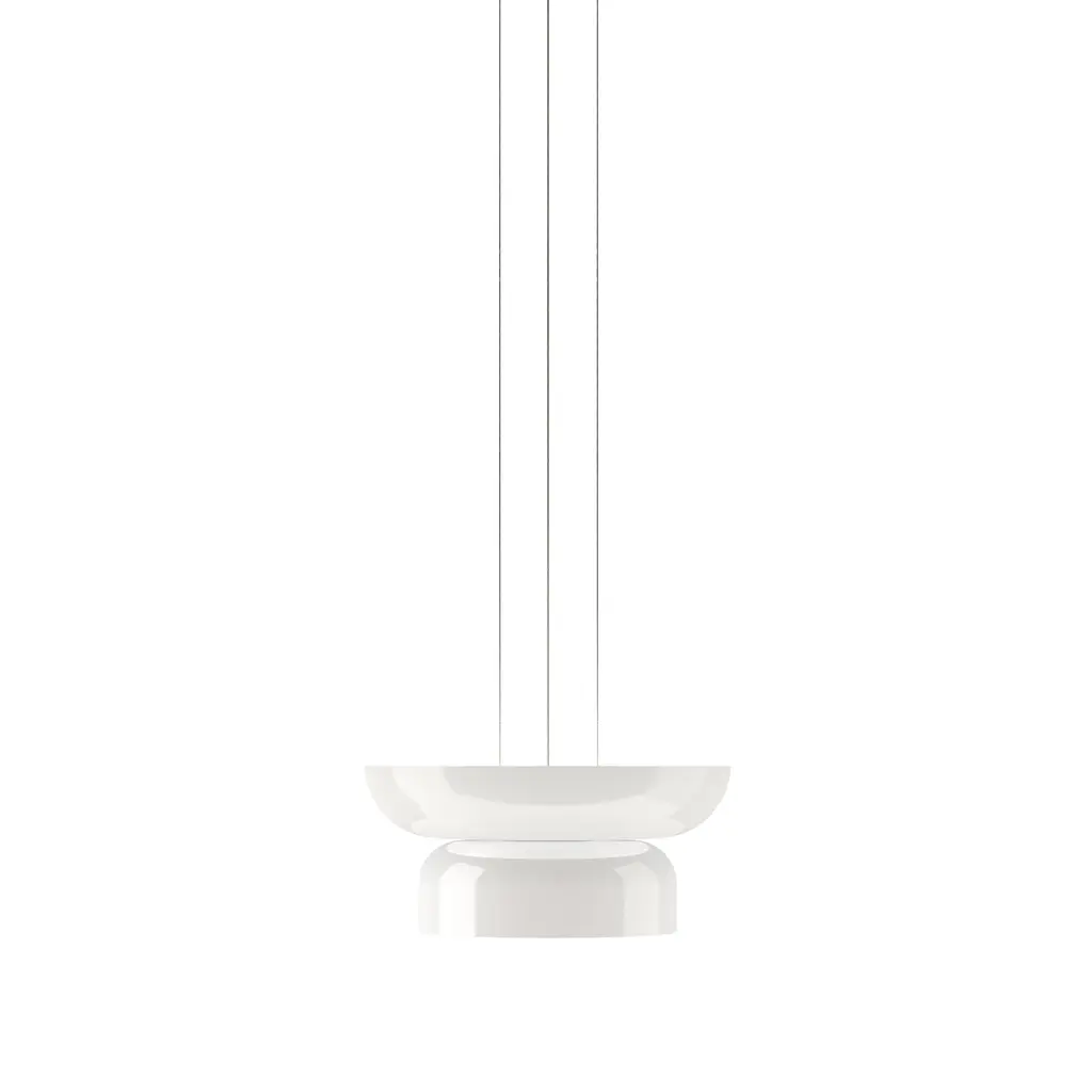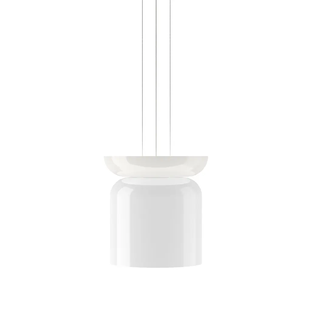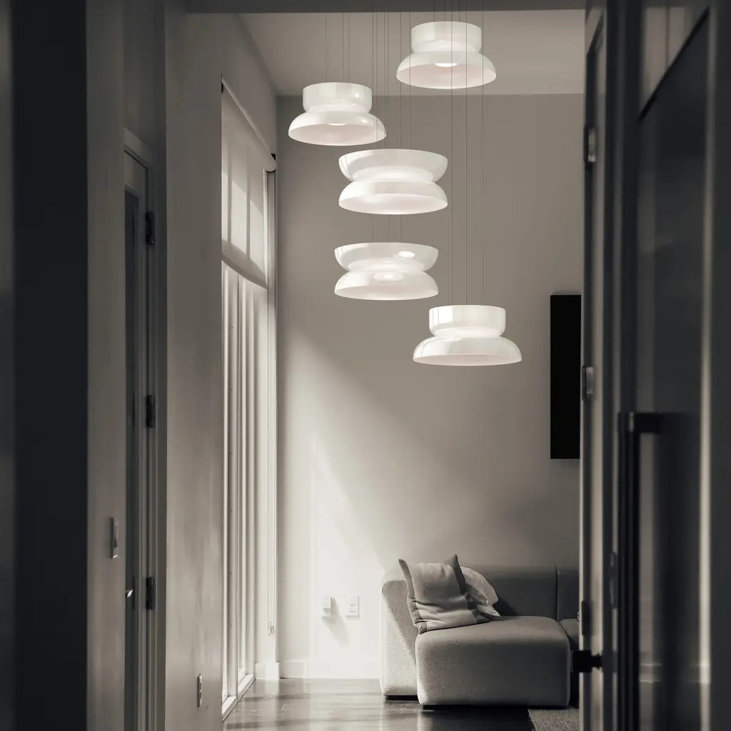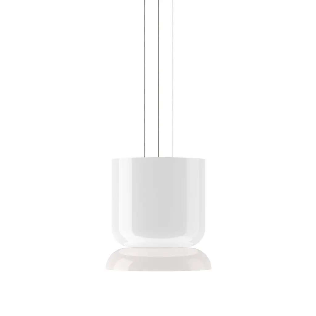 Radiant pure-white forms animate the highly versatile Up-Down version in Pablo Designs' LED lighting system Totem. Exquisite blown opal glass shades in 4 sizes of descending order (A,B,C,D) yield 16 doubled-up pendant variations designed around the modular platform. Each shade houses its own light engine that results in a warm and dimmable ambient glow via the softly diffusing glass structure—creating the option for personalized lighting solutions unique to any given space.
