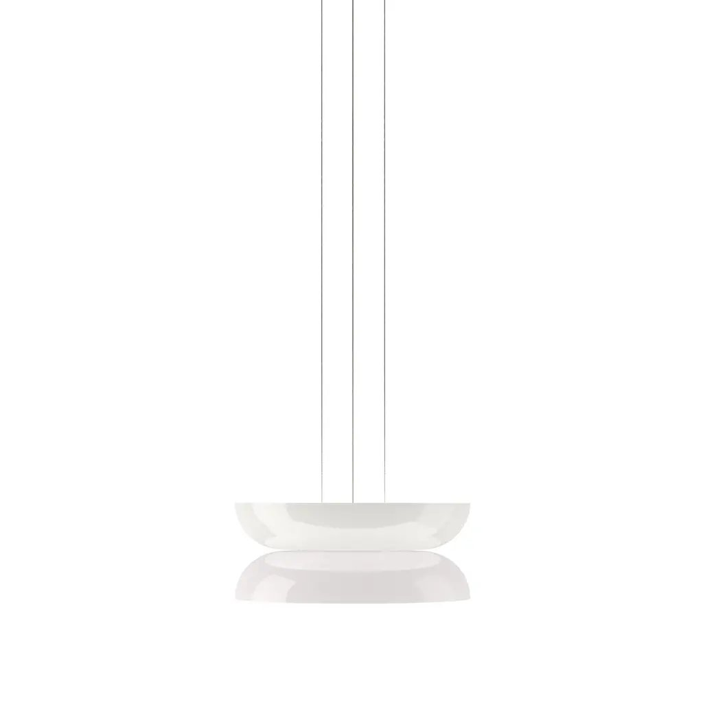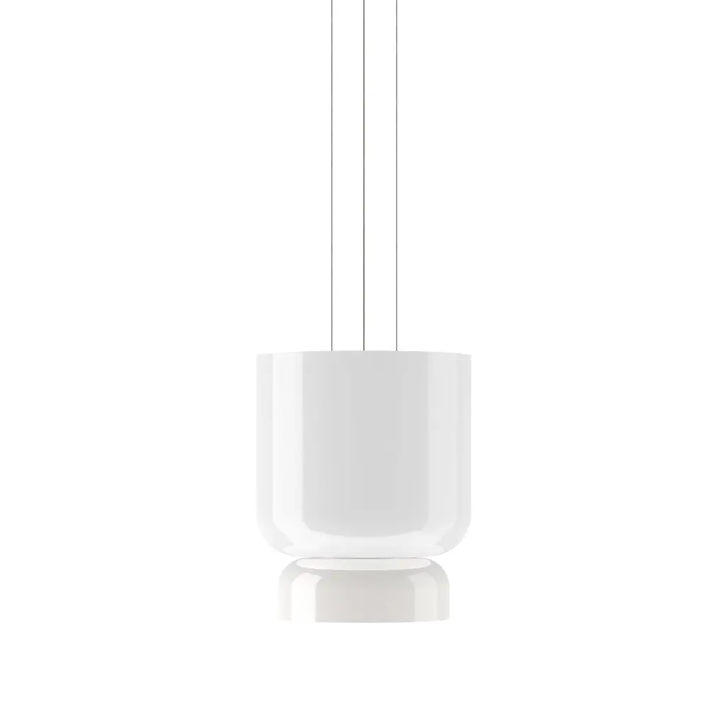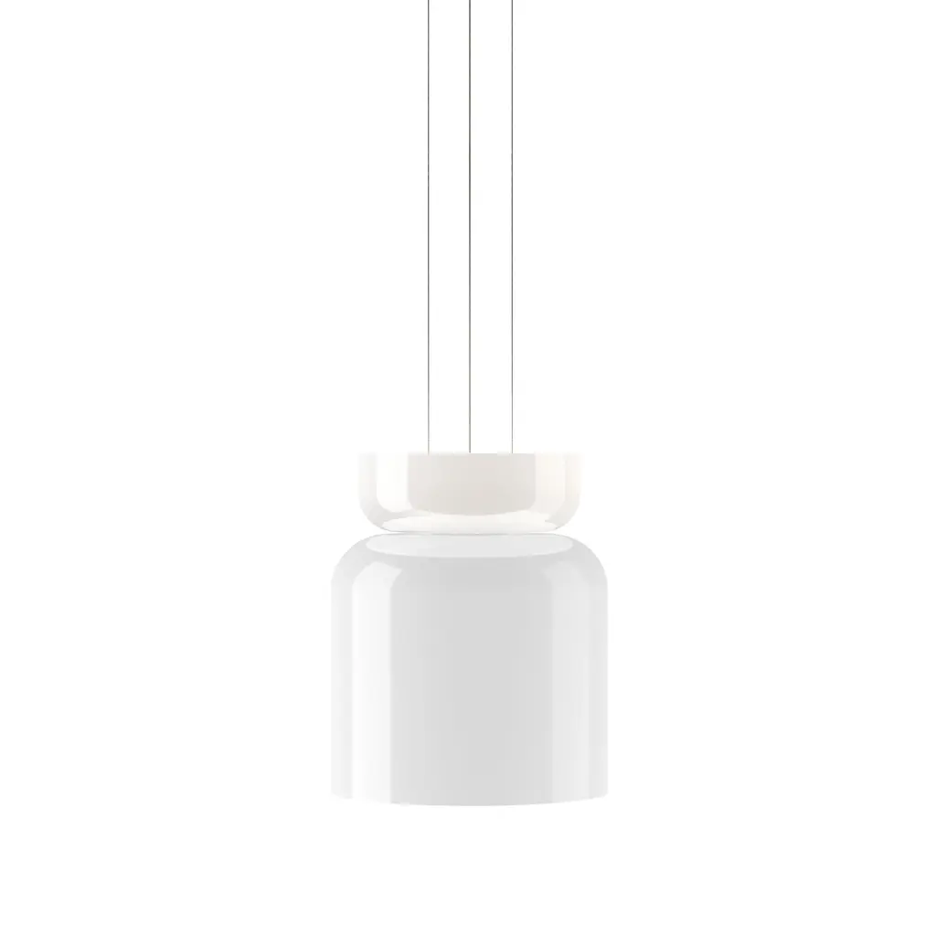 Radiant pure-white forms animate the highly versatile Up-Down version in Pablo Designs' LED lighting system Totem. Exquisite blown opal glass shades in 4 sizes of descending order (A,B,C,D) yield 16 doubled-up pendant variations designed around the modular platform. Each shade houses its own light engine that results in a warm and dimmable ambient glow via the softly diffusing glass structure—creating the option for personalized lighting solutions unique to any given space.