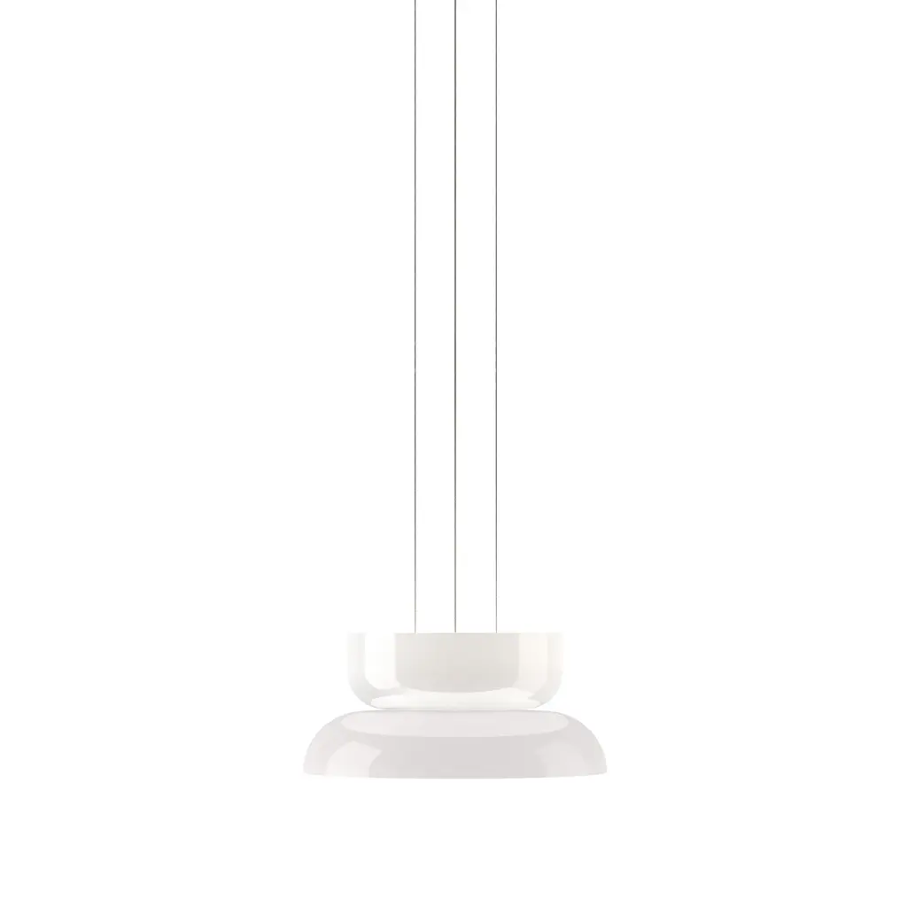 Radiant pure-white forms animate the highly versatile Up-Down version in Pablo Designs' LED lighting system Totem. Exquisite blown opal glass shades in 4 sizes of descending order (A,B,C,D) yield 16 doubled-up pendant variations designed around the modular platform. Each shade houses its own light engine that results in a warm and dimmable ambient glow via the softly diffusing glass structure—creating the option for personalized lighting solutions unique to any given space.