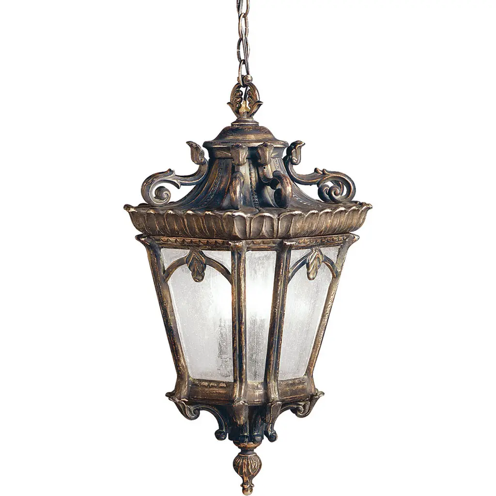 With its heavy textures, dark tones and fine attention to detail, this 3 light hanging outdoor pendant from the Tournai(TM) collection stands out from other outdoor fixtures. Handmade from cast aluminum, its distinctive Textured Black finish and Etched Seedy Glass panels give this piece a unique aged look.