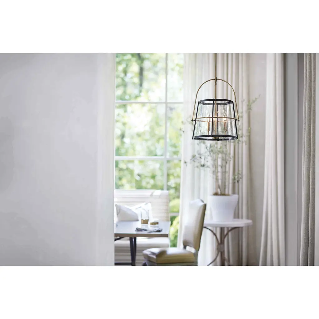 Tournon merges timeless appeal with contemporary functionality. The two-toned steel frame holds the clear seedy glass shade surrounding the lamps within. An oversized yoke completes the mid-century-modern design. It is available in a Heritage Brass or Brushed Nickel finish, each complemented by Black accents.
