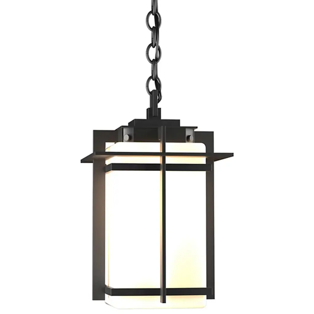 Taking inspiration from traditional Japanese stone lanterns, the Tourou Outdoor Pendant by Hubbardton Forge brings a strong and stylish accent to exterior spaces. Attached to its adjustable chain suspension by a geometric hook, this fixture presents slender bands of an angular framework that form an intricate, open cage around its rectangular shade. The opal glass shade contains the piece’s lamping and glows softly with light, elegantly harmonizing with the robust and weather-resistant metal that surrounds it