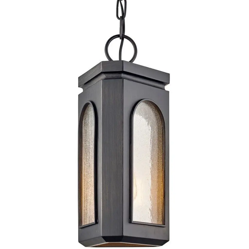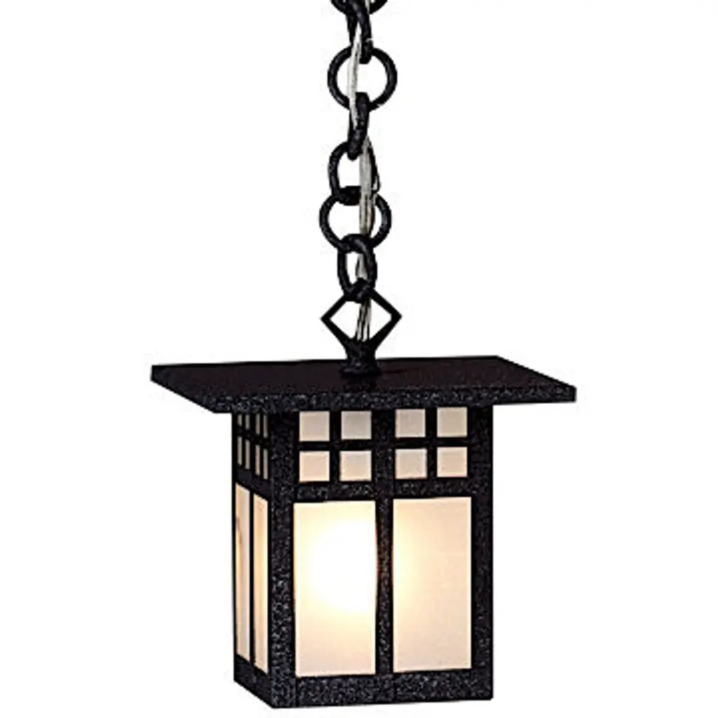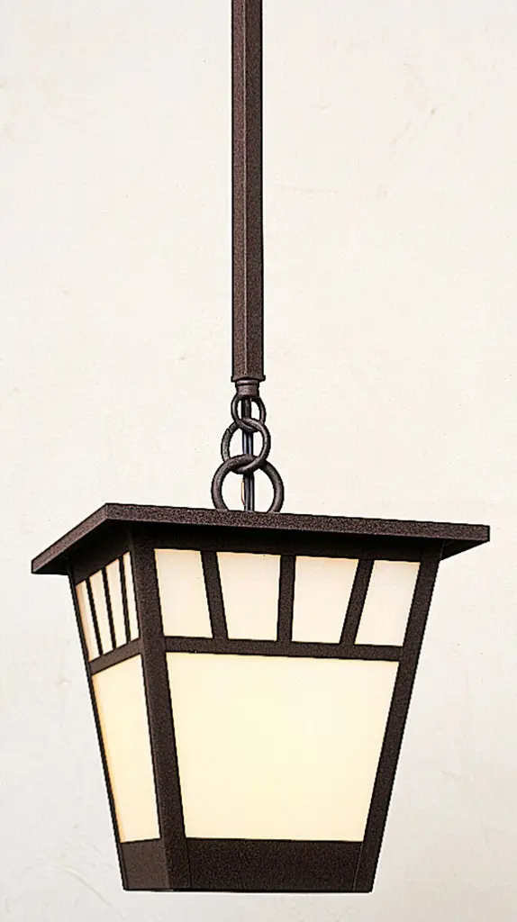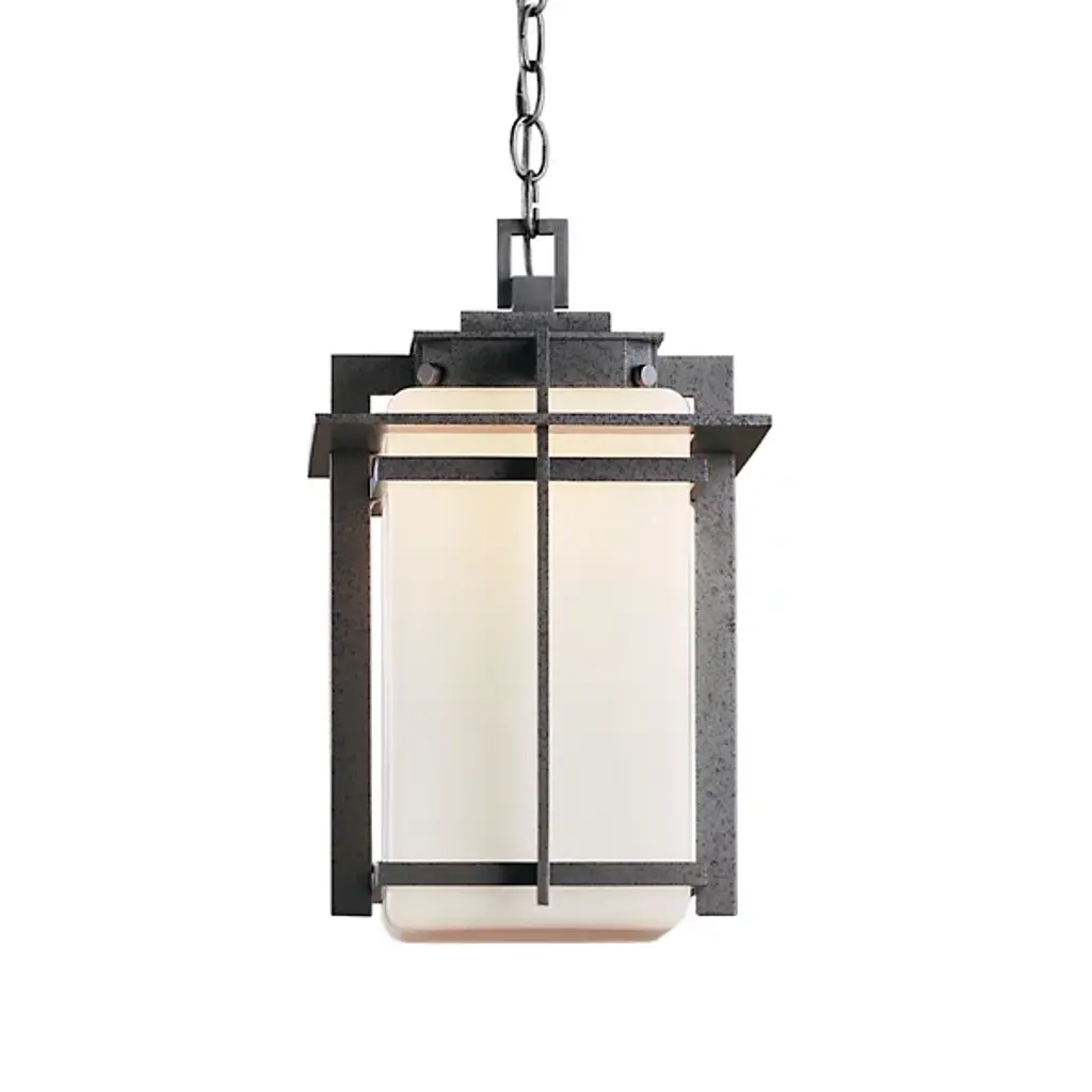 Taking inspiration from traditional Japanese stone lanterns, the Tourou Outdoor Pendant by Hubbardton Forge brings a strong and stylish accent to exterior spaces. Attached to its adjustable chain suspension by a geometric hook, this fixture presents slender bands of an angular framework that form an intricate, open cage around its rectangular shade. The opal glass shade contains the piece’s lamping and glows softly with light, elegantly harmonizing with the robust and weather-resistant metal that surrounds it