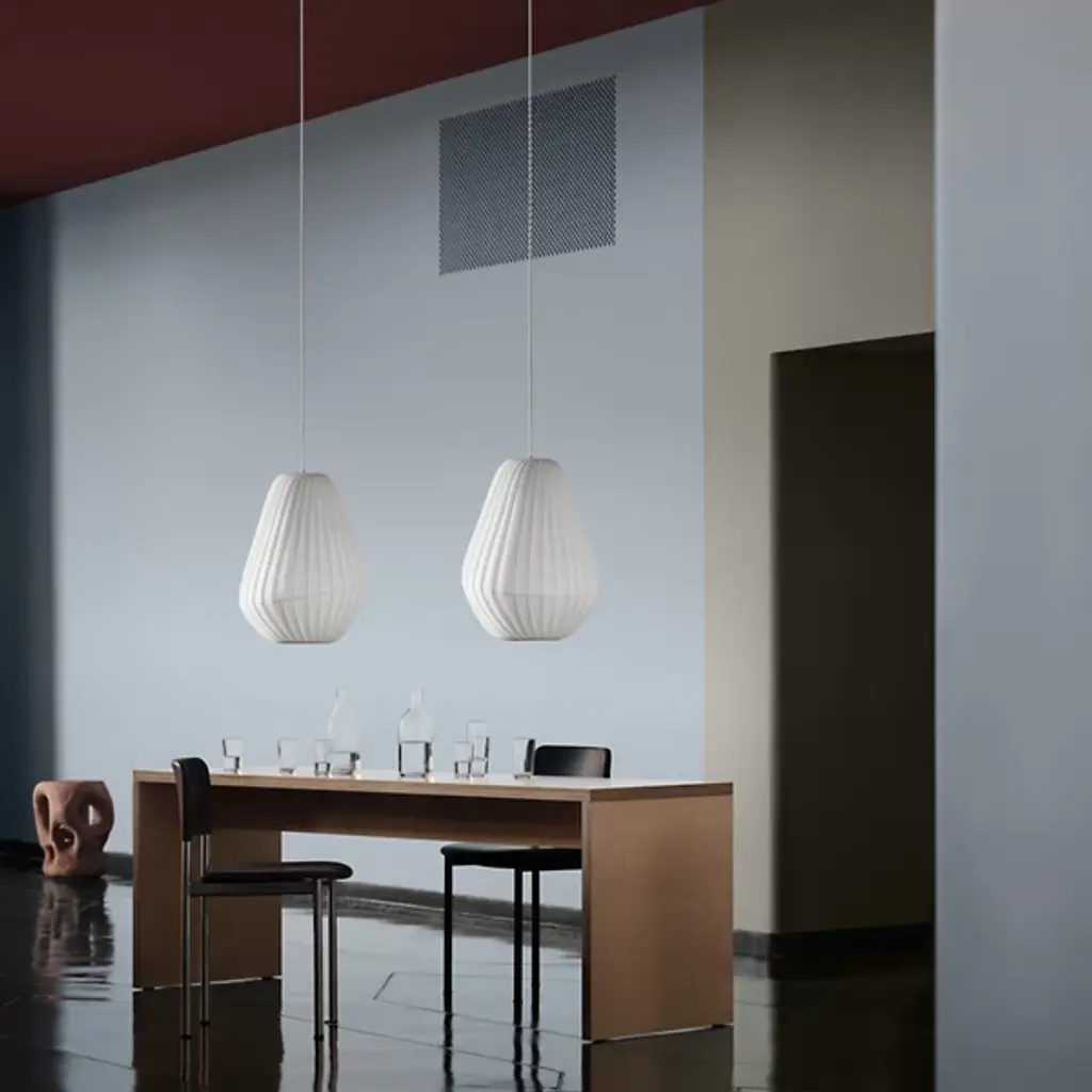 The TR31 Pendant from Tom Rossau adds a gorgeous, straightforward character to inside ceilings. A geometric fixture that draws inspiration from Rossau’s childhood in Odsherred, it calls to mind the rounded hills and entrancing landscapes that sparked his imagination. Each fixture is handmade in Denmark and uses a shade of translucent Nonwoven material over a flaring, rounded frame that bevels inward around the lamping to reduce glare to a mellow, even warmth distributed below.