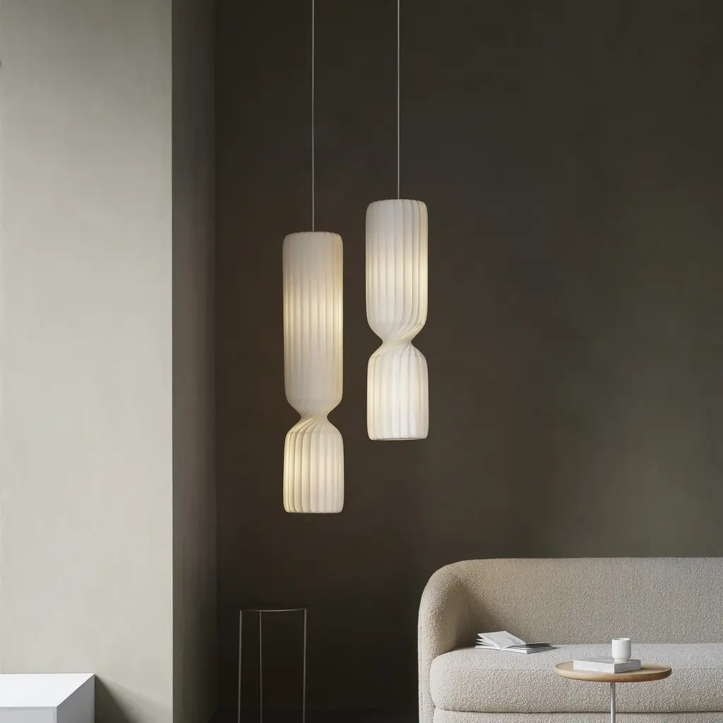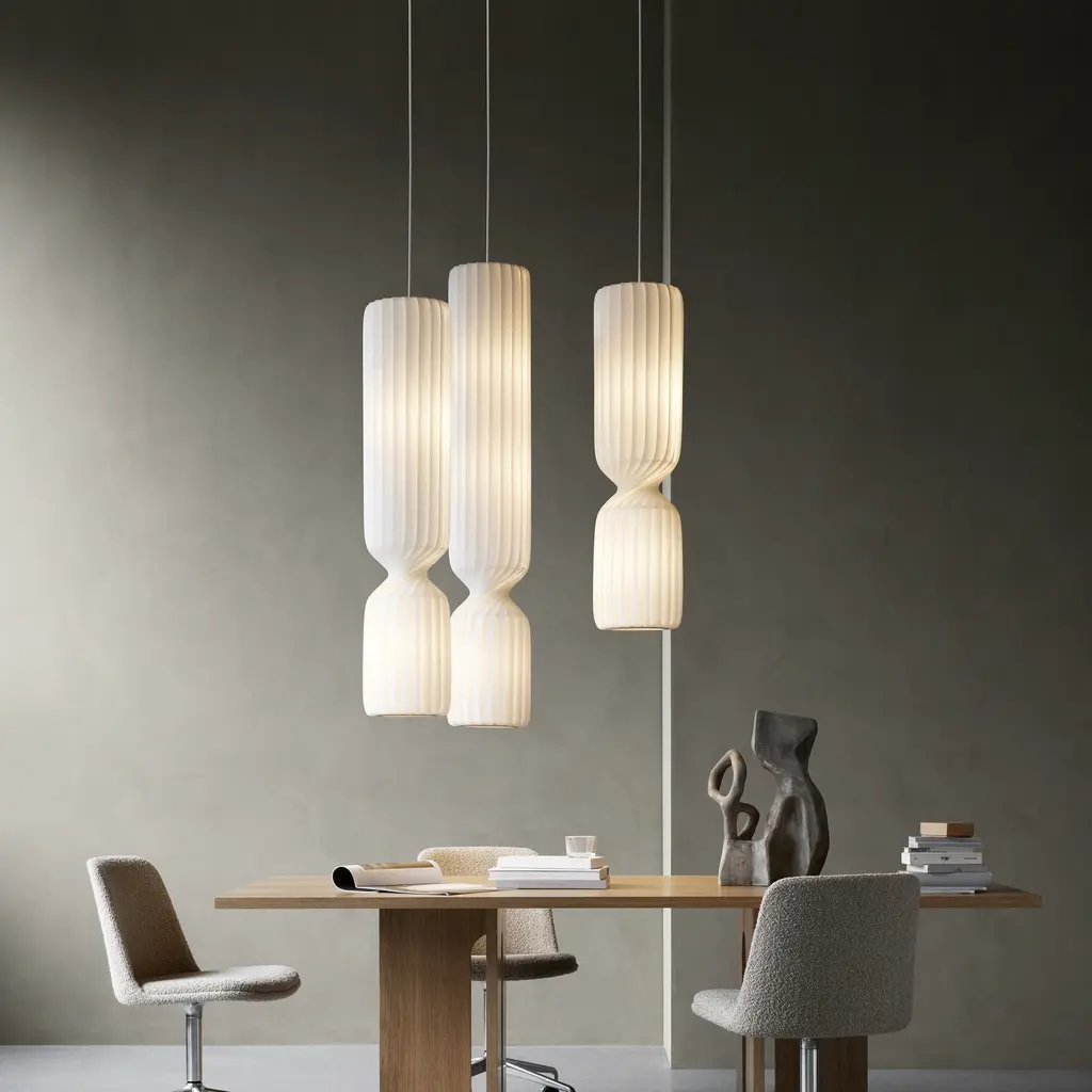 The TR41 LED Pendant Light from Tom Rossau features a distinctive Nordic design with its sculptural, asymmetrical slatted form. Available in three sizes, this series draws inspiration from the popular TR7 and TR37 lamps while introducing a unique hourglass silhouette with narrowing at the top, bottom, and lower center. Nominated for the 2021 Design Awards’ “Lamp of the Year,” the TR41 combines refined craftsmanship with striking visual contrast, making it a sophisticated statement piece that enhances any interior. Highlights