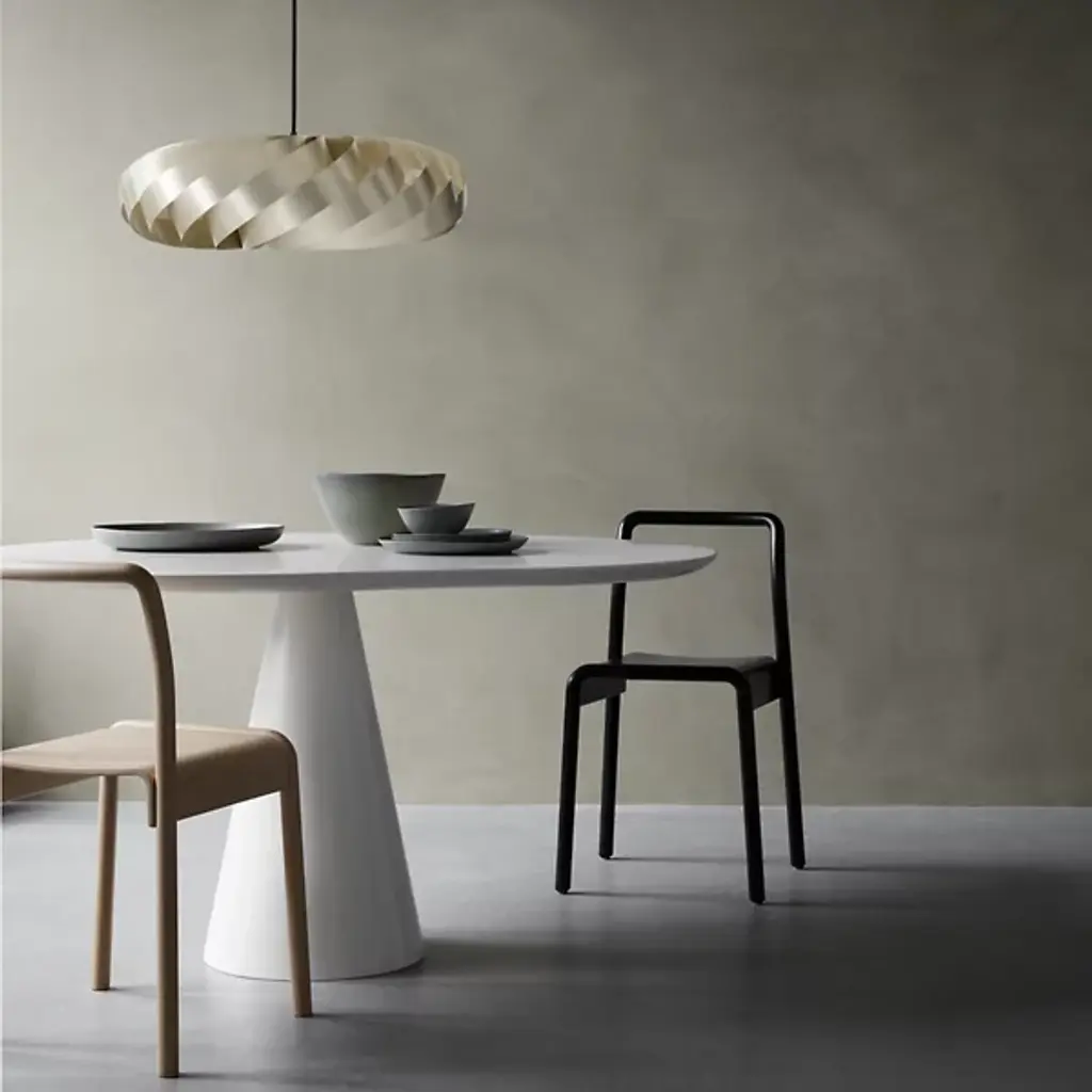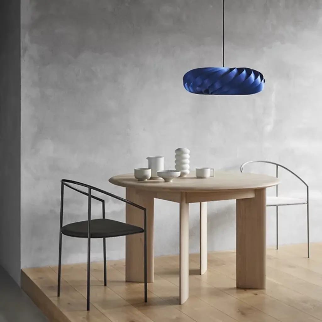 The TR5 Pendant from Tom Rossau is a sculptural suspension showing off swirling artistry and layered light. The overall design and careful curves are inspired by Tom Rossau’s childhood in Odsherred, Denmark, which calls to mind the region’s rolling hills and ethereal light. An airy shade structure made from simple wood veneer or aluminum strips emerges around a central lamp, adding organic curves to the contemporary housing and, reducing glare from the 8.5 Watt (850 Lumens) light while still providing ample downlight accented by a pattern of slender shadows.