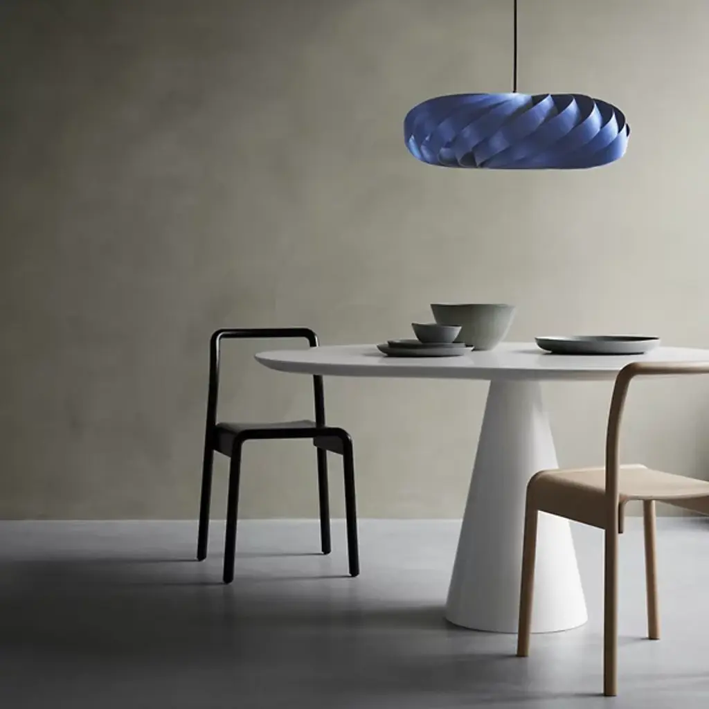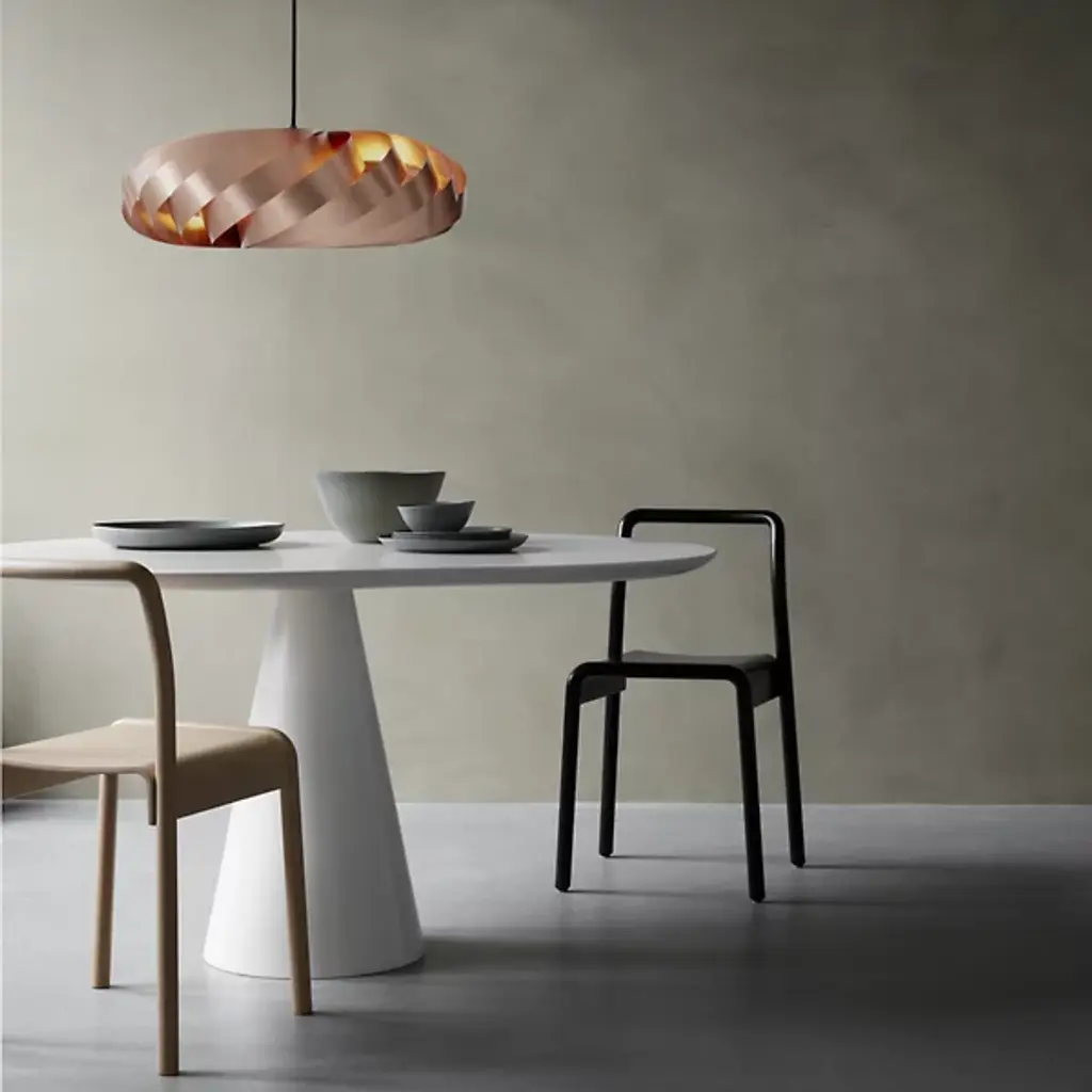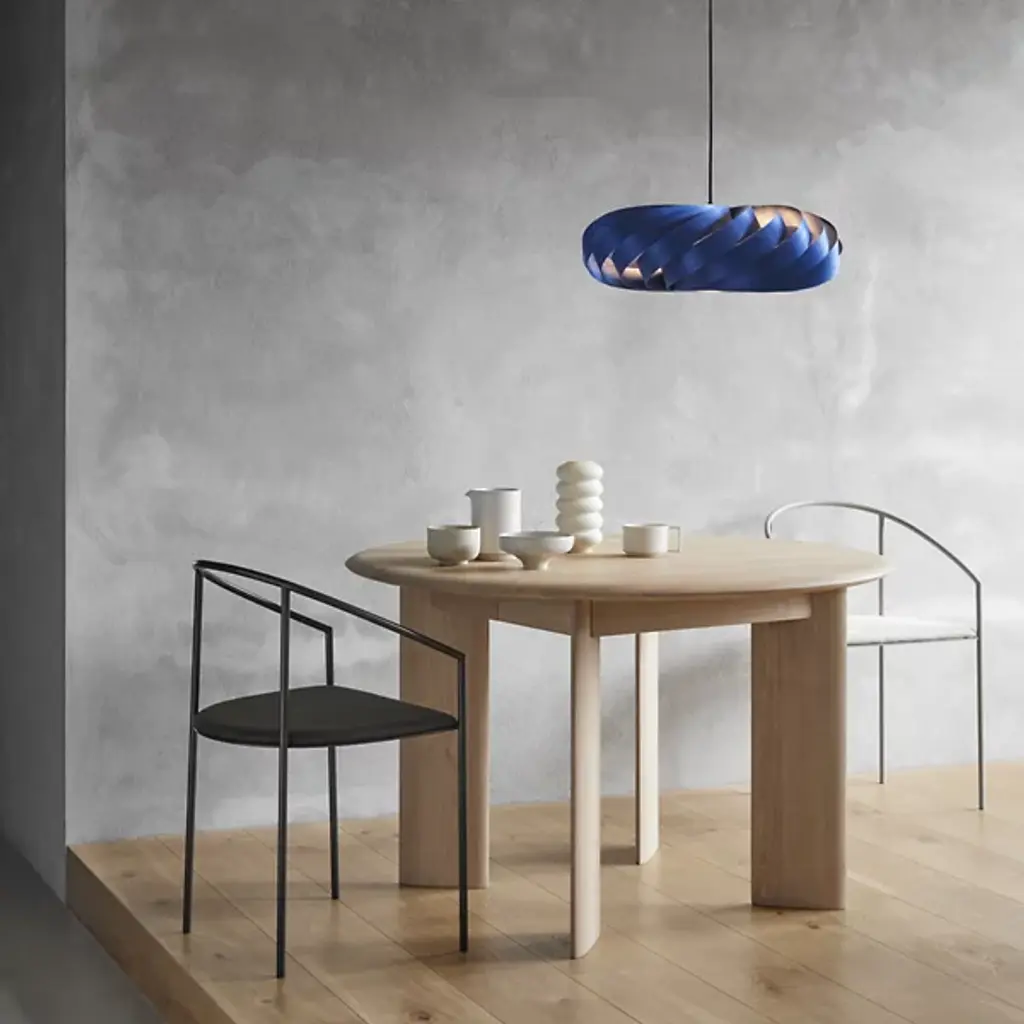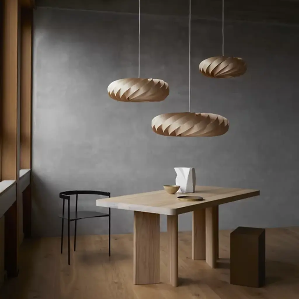 The TR5 Pendant from Tom Rossau is a sculptural suspension showing off swirling artistry and layered light. The overall design and careful curves are inspired by Tom Rossau’s childhood in Odsherred, Denmark, which calls to mind the region’s rolling hills and ethereal light. An airy shade structure made from simple wood veneer or aluminum strips emerges around a central lamp, adding organic curves to the contemporary housing and, reducing glare from the 8.5 Watt (850 Lumens) light while still providing ample downlight accented by a pattern of slender shadows.