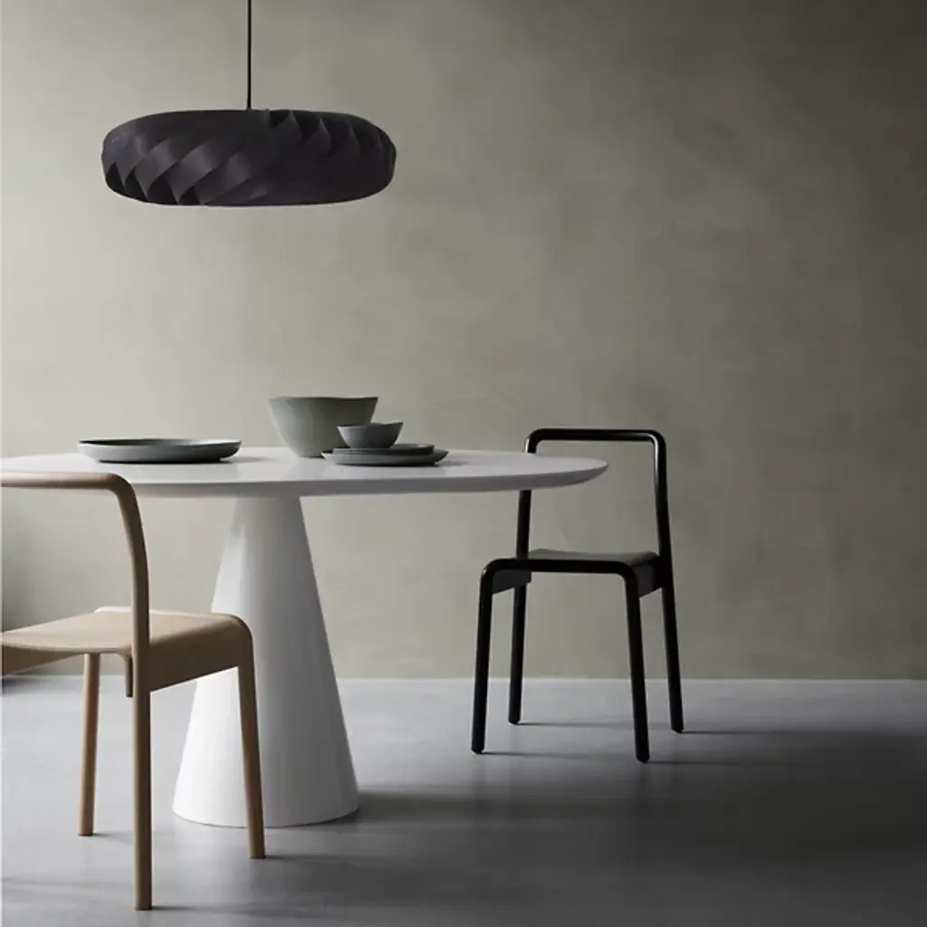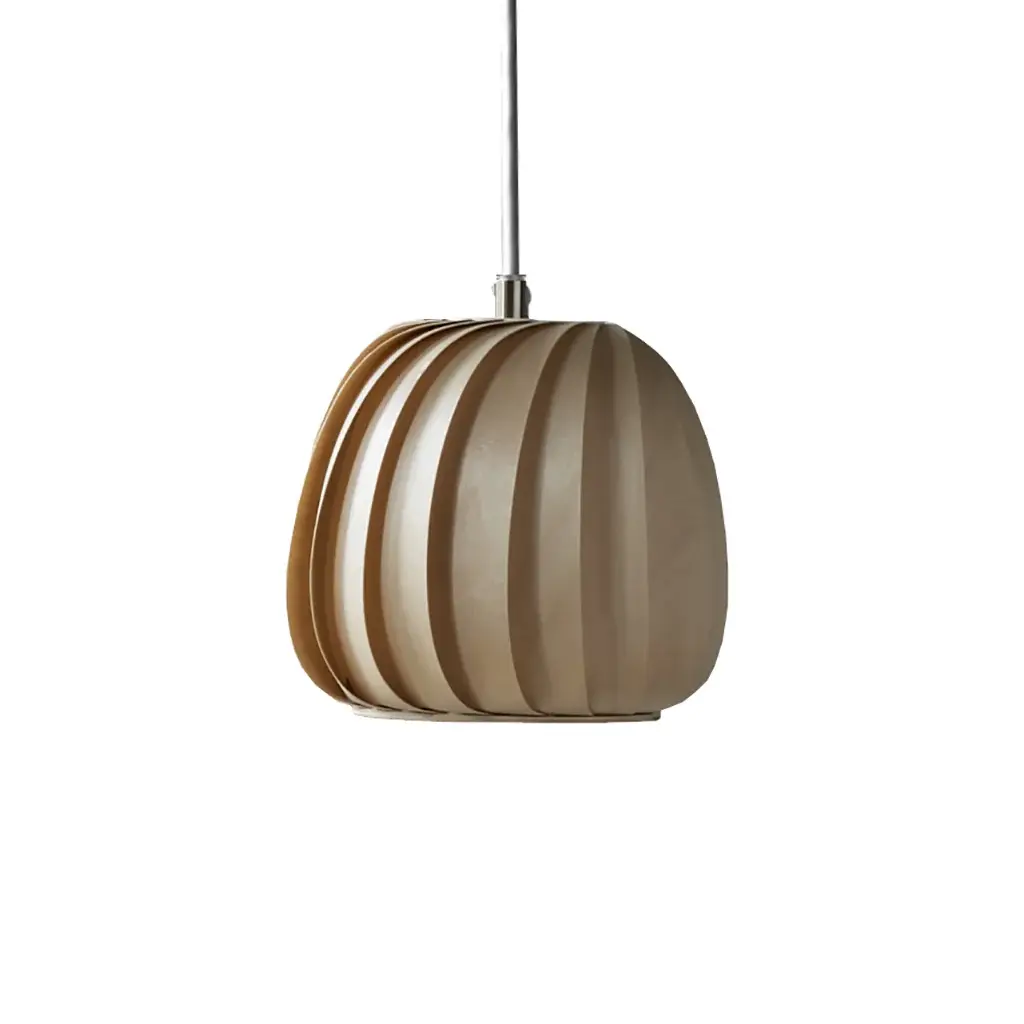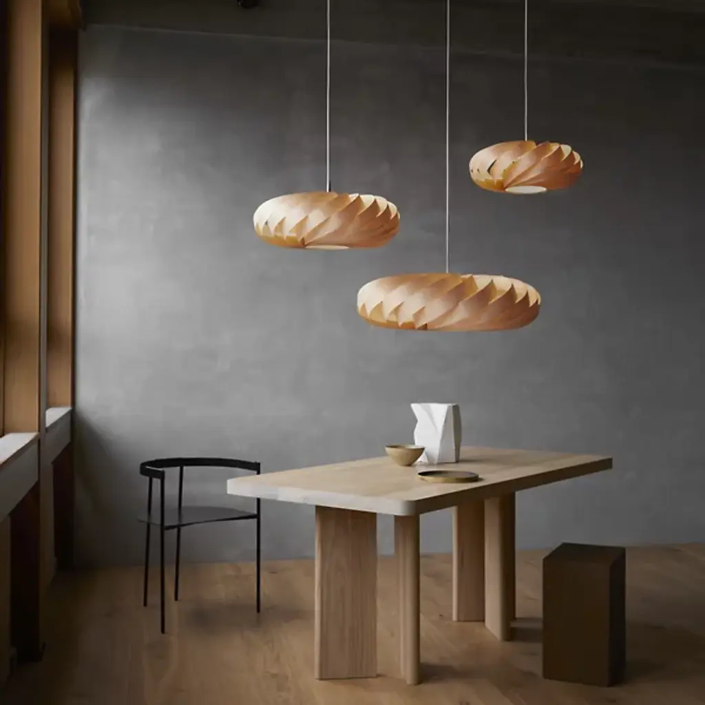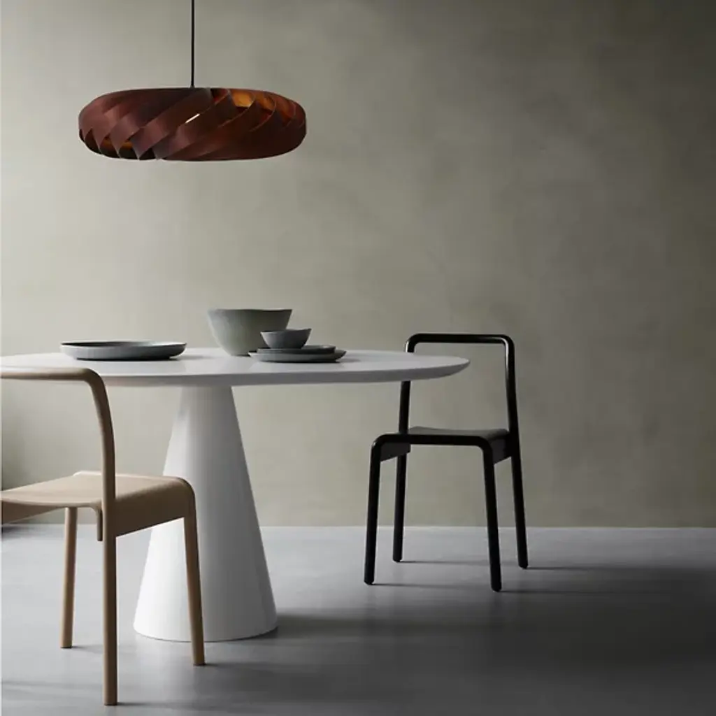 The TR5 Pendant from Tom Rossau is a sculptural suspension showing off swirling artistry and layered light. The overall design and careful curves are inspired by Tom Rossau’s childhood in Odsherred, Denmark, which calls to mind the region’s rolling hills and ethereal light. An airy shade structure made from simple wood veneer or aluminum strips emerges around a central lamp, adding organic curves to the contemporary housing and, reducing glare from the 8.5 Watt (850 Lumens) light while still providing ample downlight accented by a pattern of slender shadows.