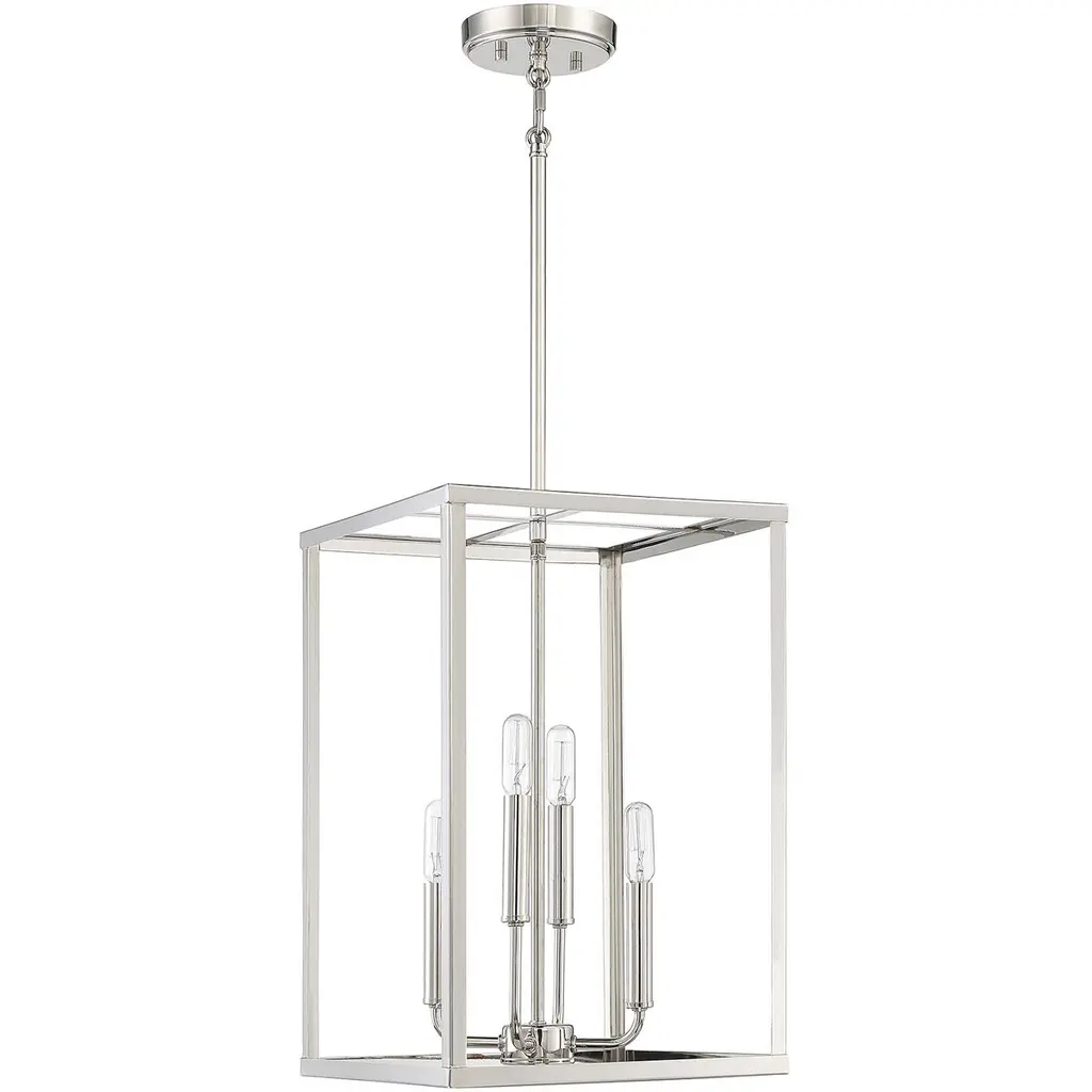 Go geometric with this 4-light pendant from Meridian Its open, tall cubic structure allows for the lights within to shine brightly and create lighting beauty in rooms with contemporary or transitional decor styles. Finished in sleek polished nickel. This pendant is 18" in height and 12" in width, plus it includes four 12" downrods and one 6" downrod to let you adjust the height for a maximum of 72". This pendant uses 4 candelabra size bulbs with a max of 60 watts per bulb, is LED compatible, is dimmable and can be used on a sloped ceiling.