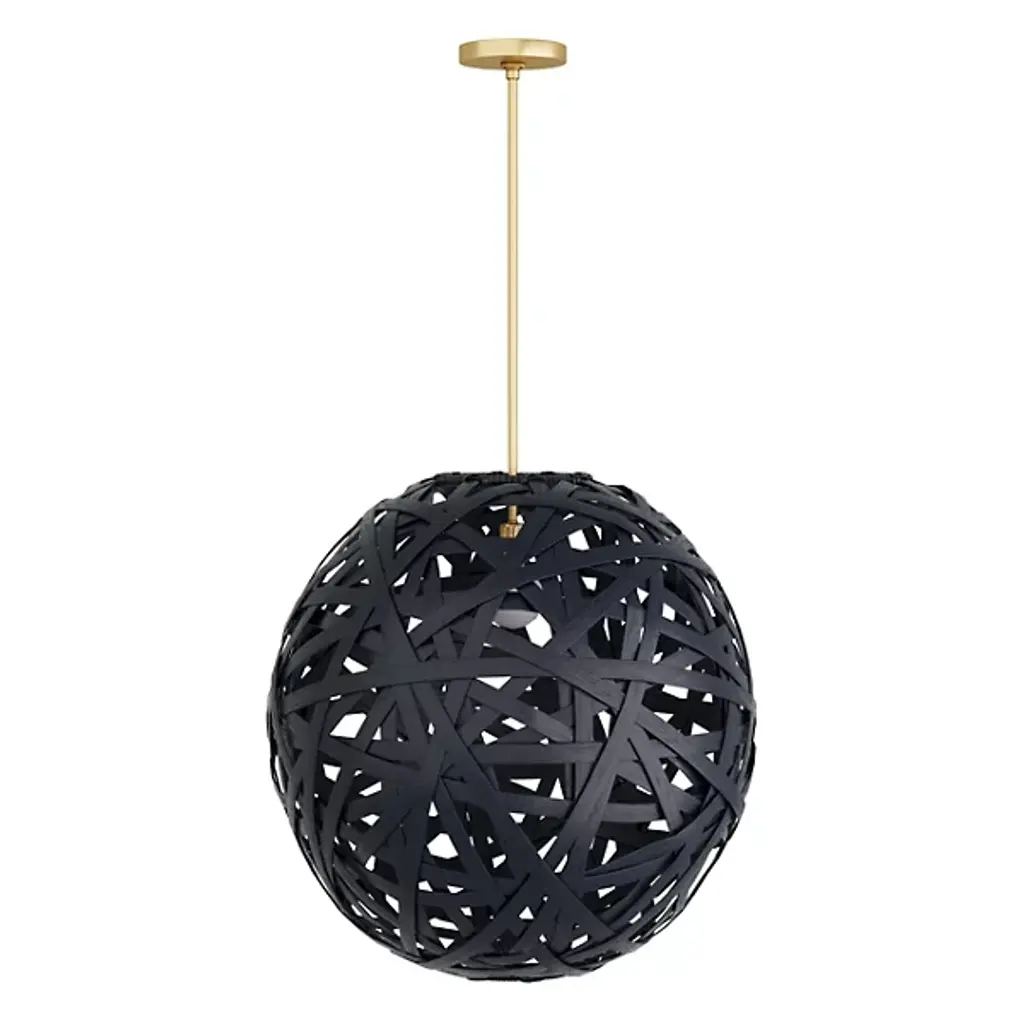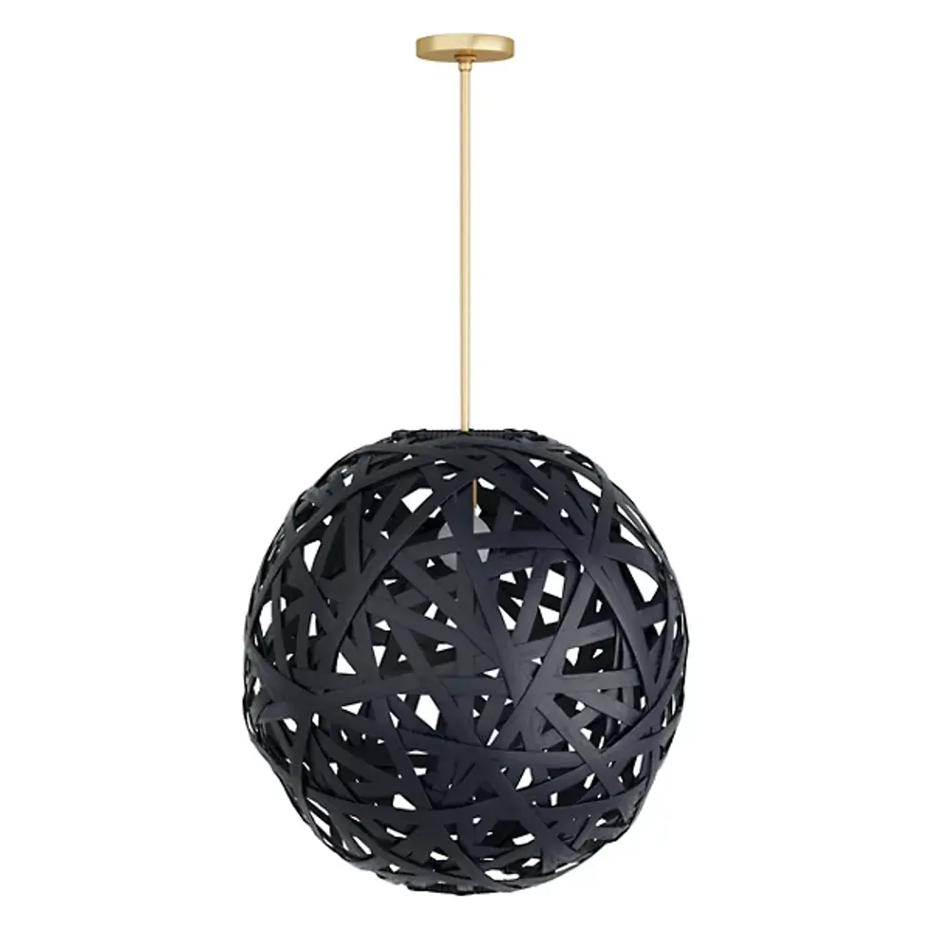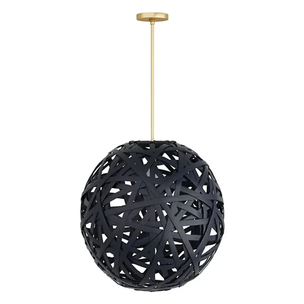 The Trai Pendant by Arteriors is a unique and stylish light fixture crafted in a tangle of black rattan strips. The oversized, texture-rich globe dangles from a steel pipe, and light peers through the pendant's open weave, casting dramatic patterns of light and shadow. The finish will vary, adding to the pendant's unique charm. It is damp-rated, making it perfect for indoor or covered outdoor use.