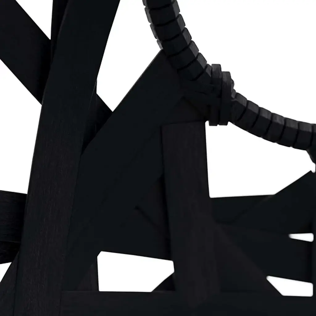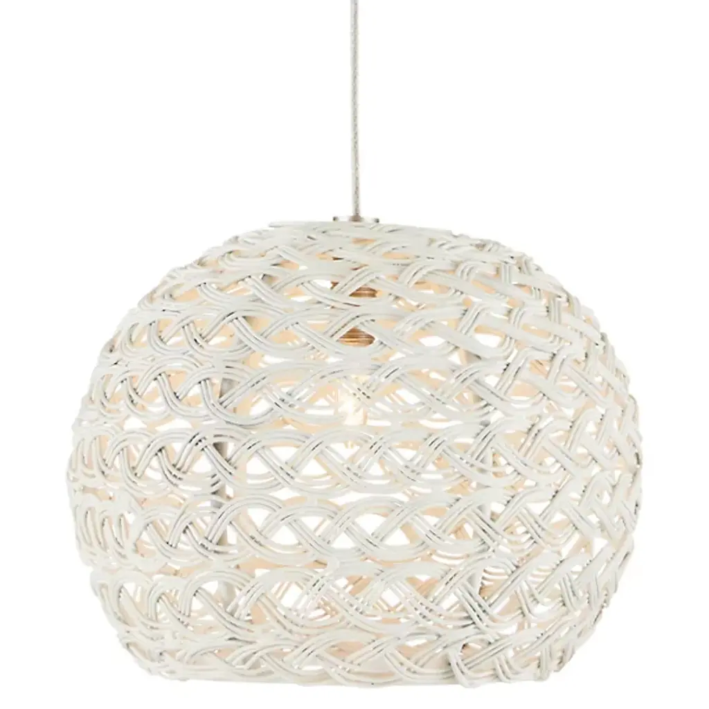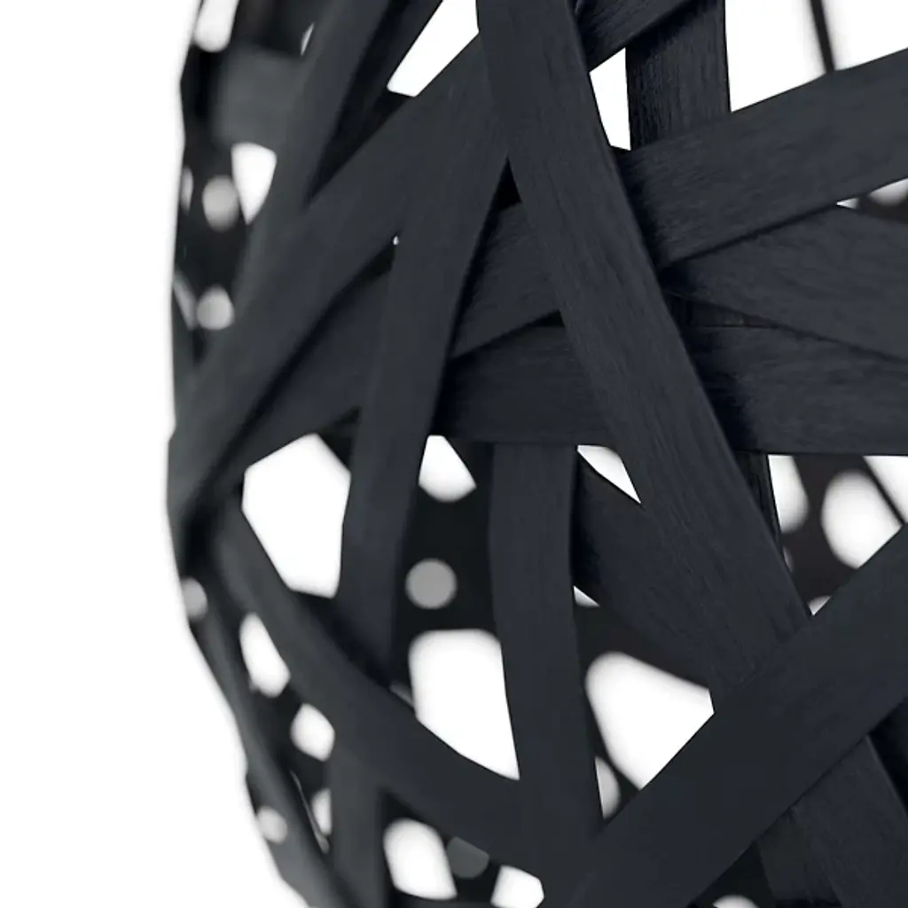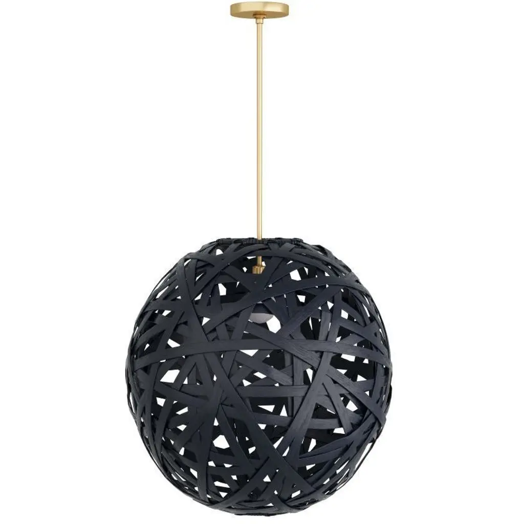 The Trai Pendant by Arteriors is a unique and stylish light fixture crafted in a tangle of black rattan strips. The oversized, texture-rich globe dangles from a steel pipe, and light peers through the pendant's open weave, casting dramatic patterns of light and shadow. The finish will vary, adding to the pendant's unique charm. It is damp-rated, making it perfect for indoor or covered outdoor use.