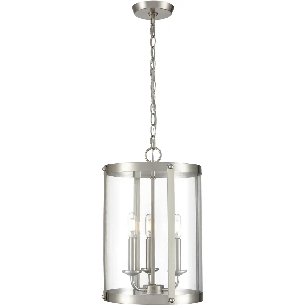 Crisp and traditional lantern style lighting is given an update in this 3-light pendant, which features a grey finish accentuated by polished nickel. 16" height and 10" width. Uses candelabra size bulbs with a max of 60 watts per bulb. LED bulb compatible. Supplied with 120" of chain.