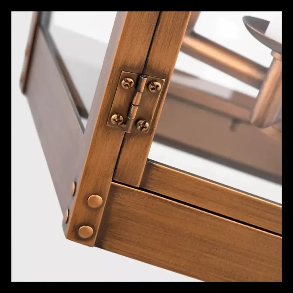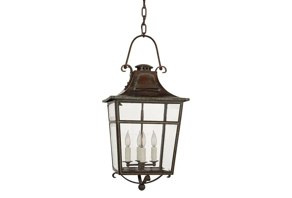The Amella outdoor pendant fixture in textured black by Chapman and Myers has a classic copper lantern profile with top and bottom glass panels. Assembled with an overlapping metal frame that is accented by rivet details. Each light has a historically inspired spun-metal chimney cap.