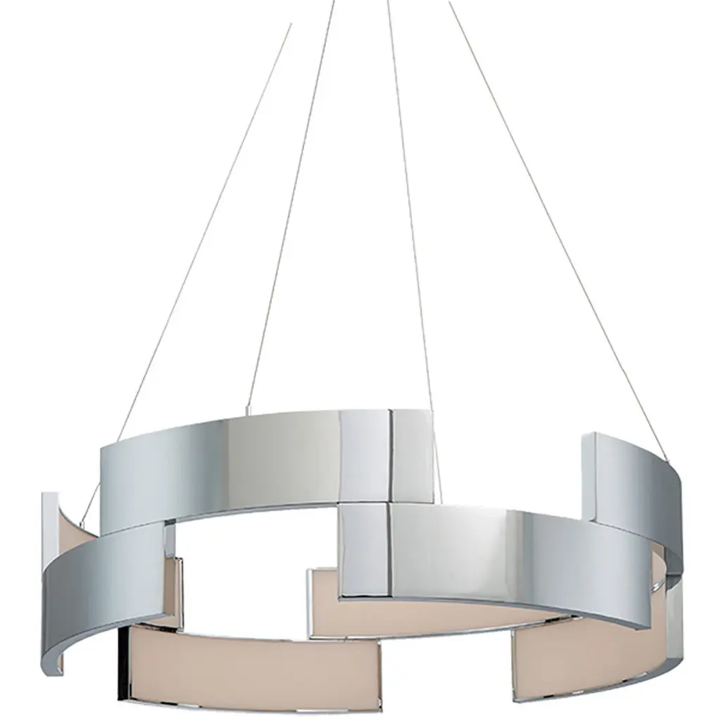 Futuristic design meets top-tier technology in this artful pendant, where cutting-edge LED light radiates inside terraced bands finished in black, chrome or white. Energy efficient integrated LED's provide a long-lasting maintenance-free bright and even illumination. Thin coated powered aircraft cables adjustable through push-pin connectors at the canopy provide an ultra-clean look. Can be mounted on a slope ceiling.