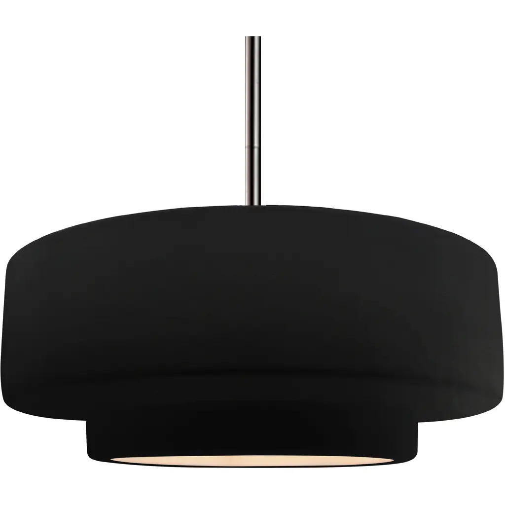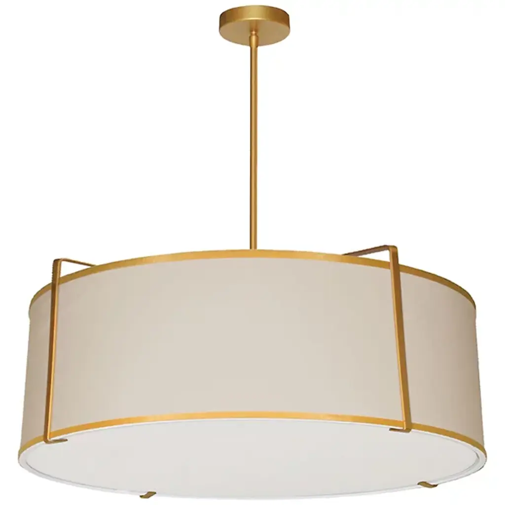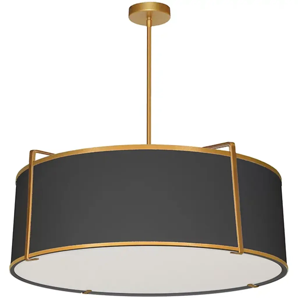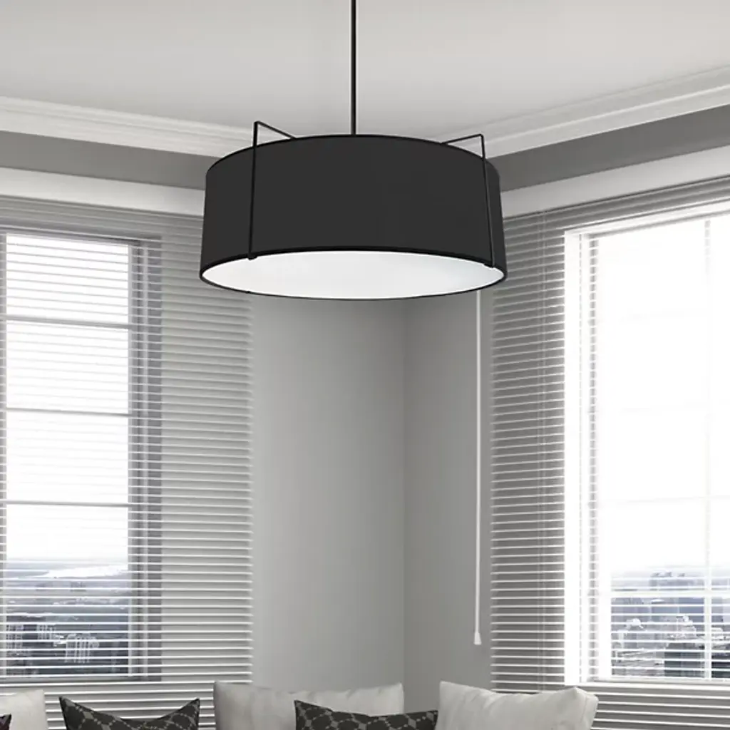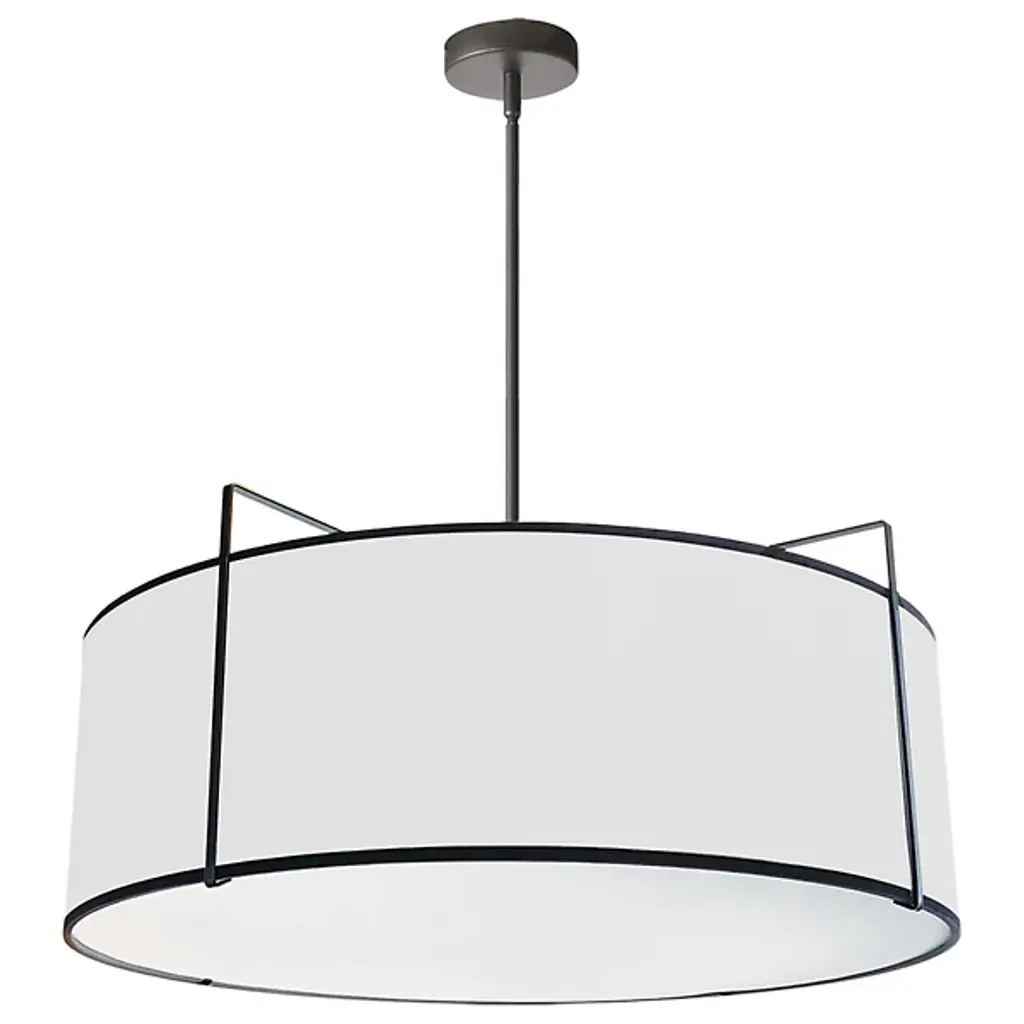 Clean aesthetics and a refined style highlight the Trapazoid Drum Pendant from Dainolite. It’s an elegant transitional design complementing your home’s modern or traditional décor. A slender downrod suspension and compact canopy let this piece slot in tight spaces on its own or in sequence. The eyes are instantly drawn to the contrast provided by a group of sleek metal accents. They angle out to hold a grand drum fabric shade. The group of bulbs inside turn on to generate a stream of diffused down lighting.