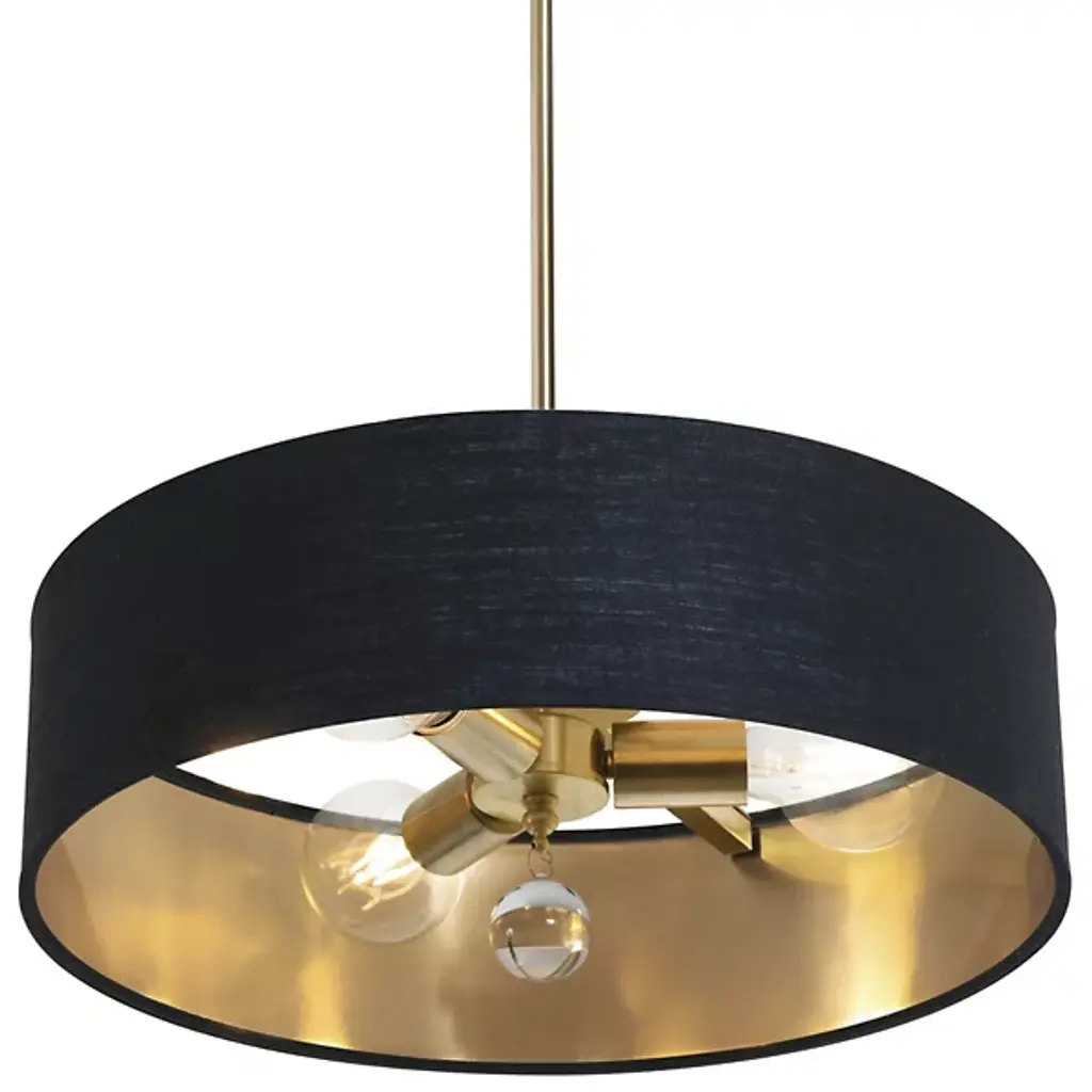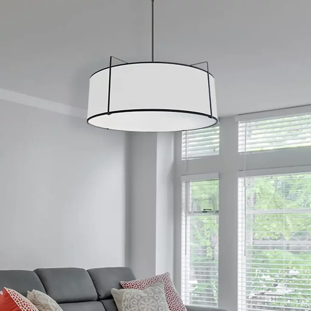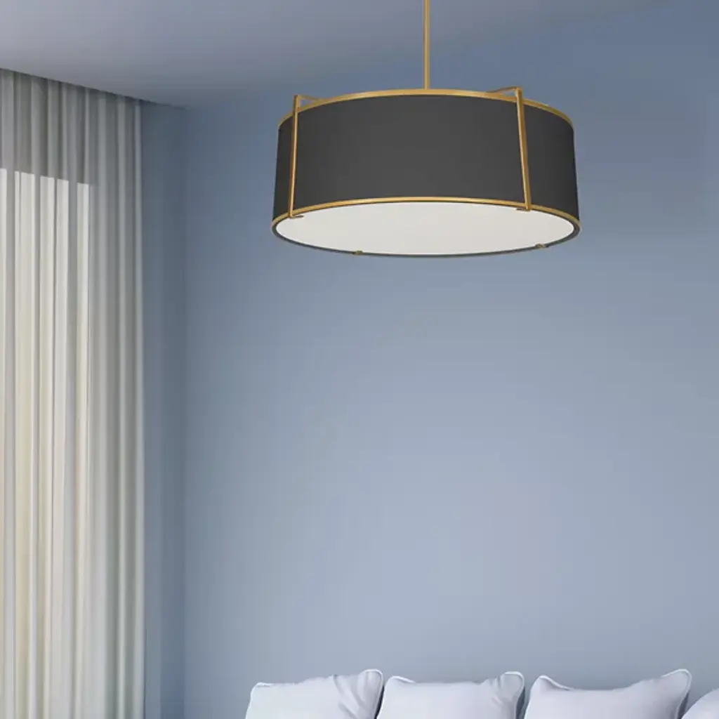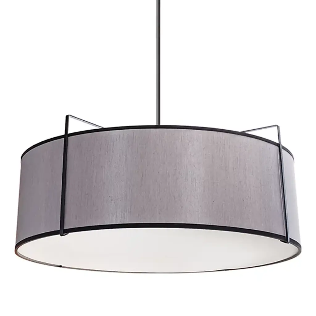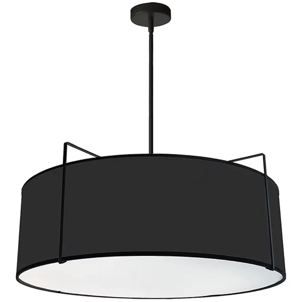 Clean aesthetics and a refined style highlight the Trapazoid Drum Pendant from Dainolite. It’s an elegant transitional design complementing your home’s modern or traditional décor. A slender downrod suspension and compact canopy let this piece slot in tight spaces on its own or in sequence. The eyes are instantly drawn to the contrast provided by a group of sleek metal accents. They angle out to hold a grand drum fabric shade. The group of bulbs inside turn on to generate a stream of diffused down lighting.