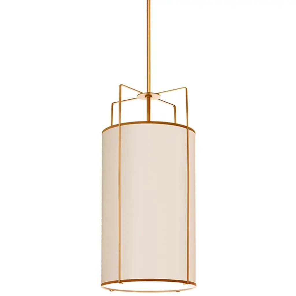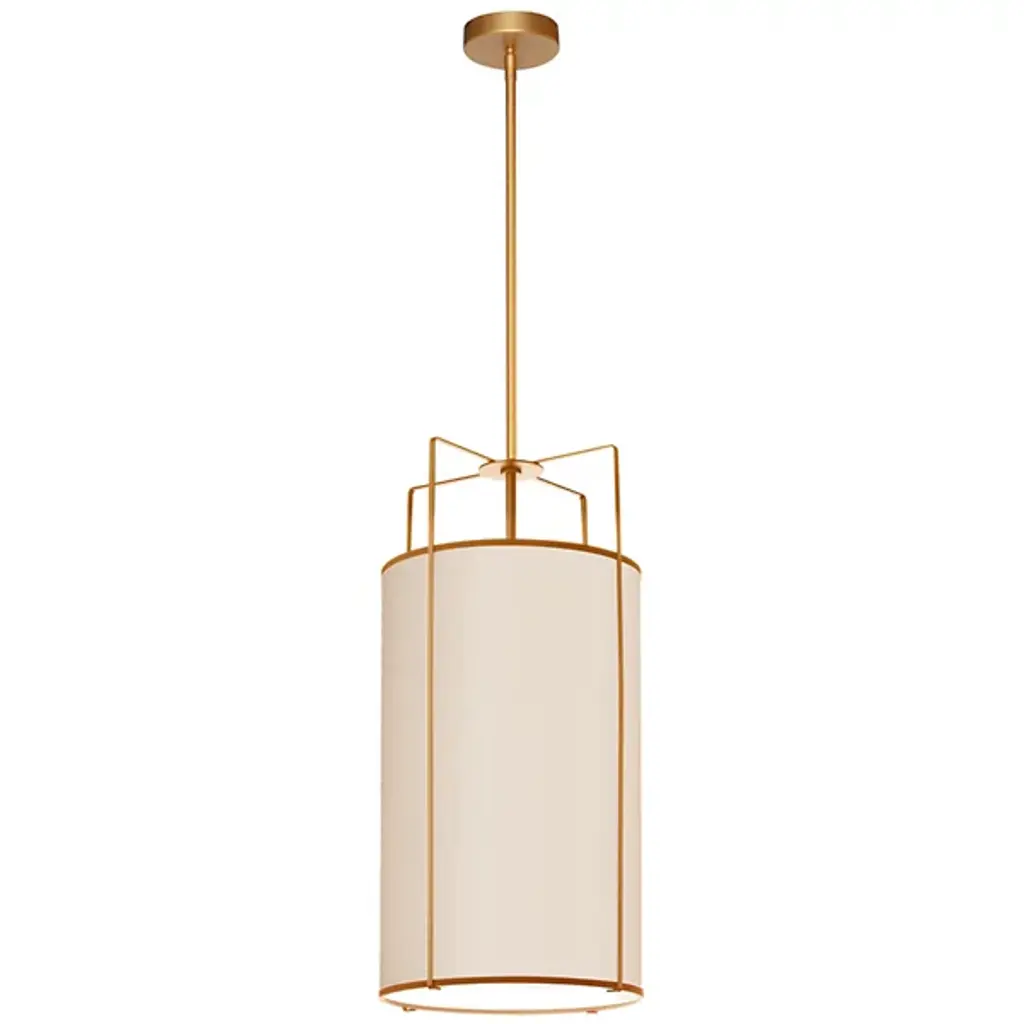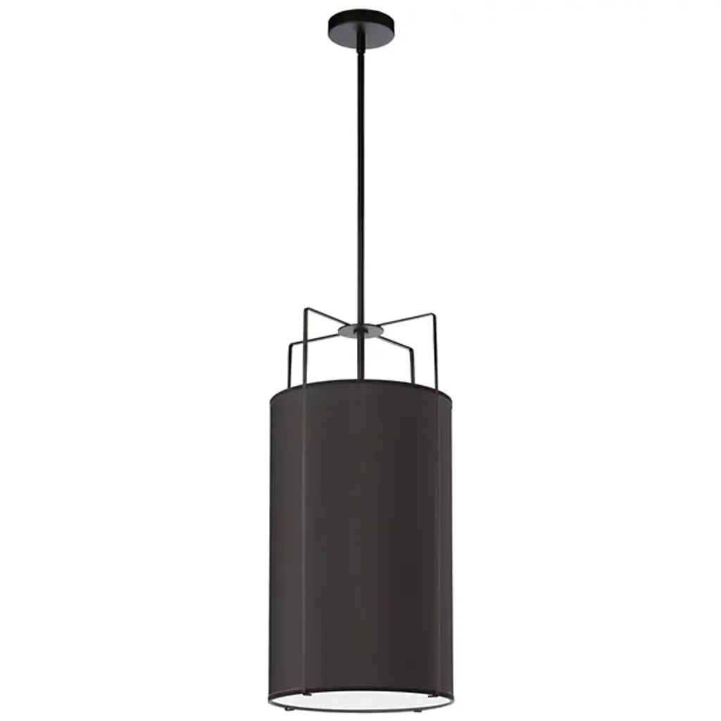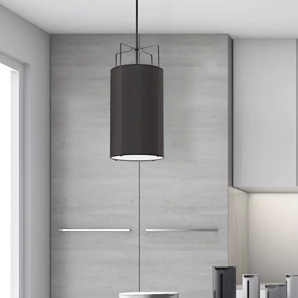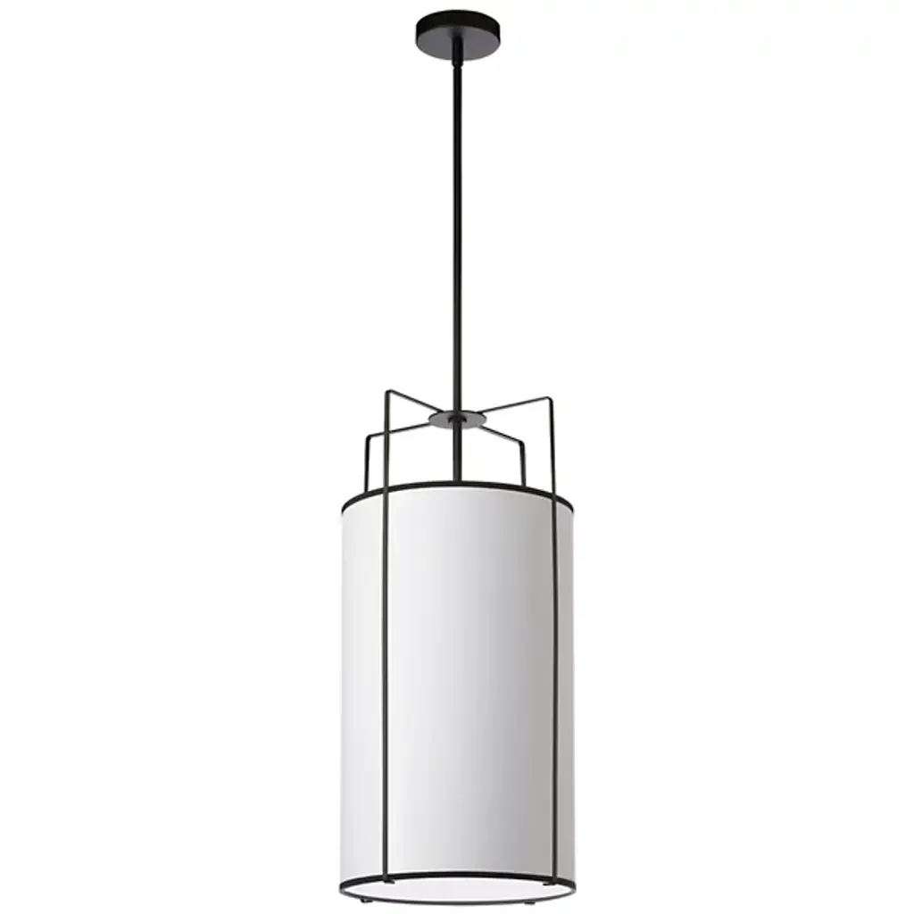 Distinctively geometric ceiling lighting. The Trapezoid Cylinder Pendant by Dainolite makes things interesting with its unique blend of shapes and materials. Its shade is a tall fabric cylinder, surrounded by a rectangular metal cage, which adds to the overall sense of height by extending a few inches above the shade. The wide opening of the shade allows for an uninterrupted wash of downlight onto a dining table or kitchen island countertop.