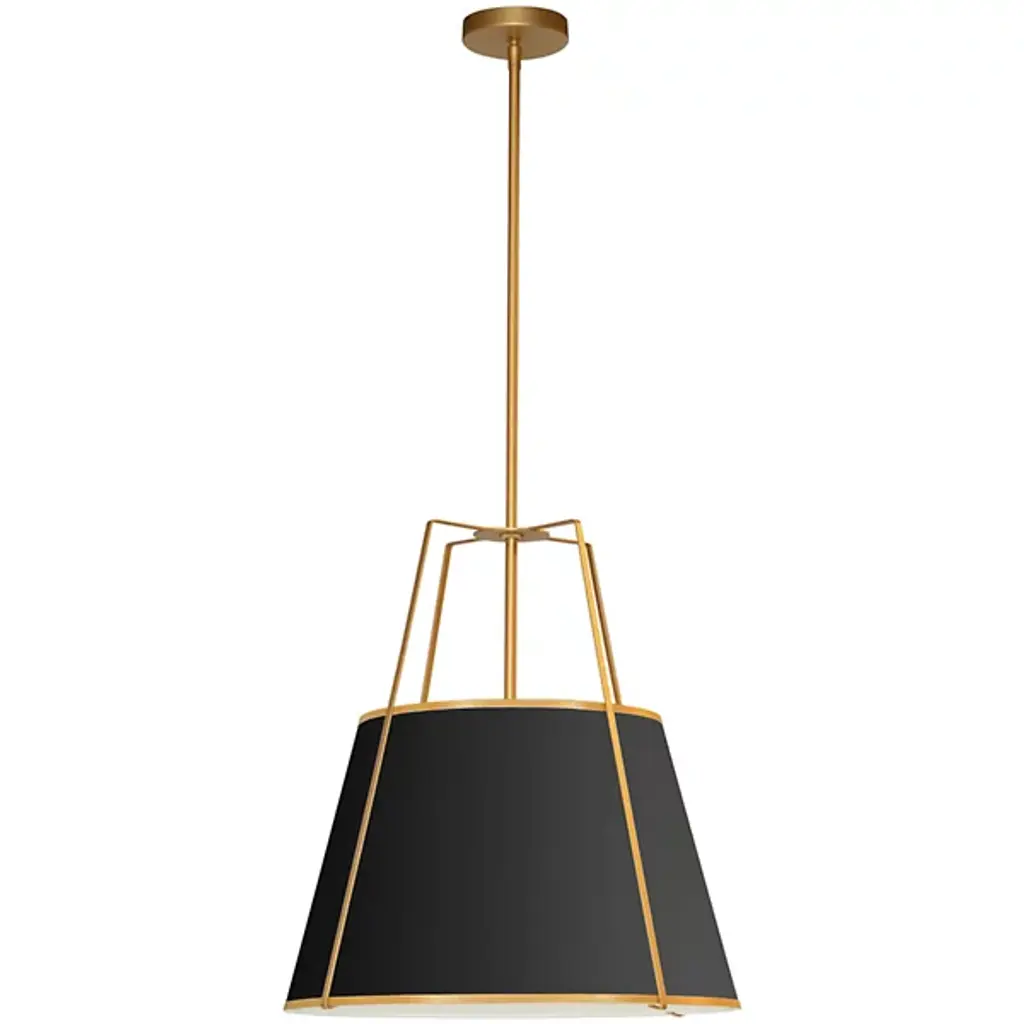 The Trapezoid Pendant by Dainolite has a crisp, geometric feel to it thanks to a slender set of crisply bent metal rods that cradle a tapered fabric shade. This simple composition is suspended by a single down rod, and the conical shade is paired with a fabric diffuser to give it a neat look while also filtering an even layer of illumination onto surroundings. A small line of trim on either end of the shade adds a tailored touch to this design as it lends a handsome mix of form and function to its environment.
