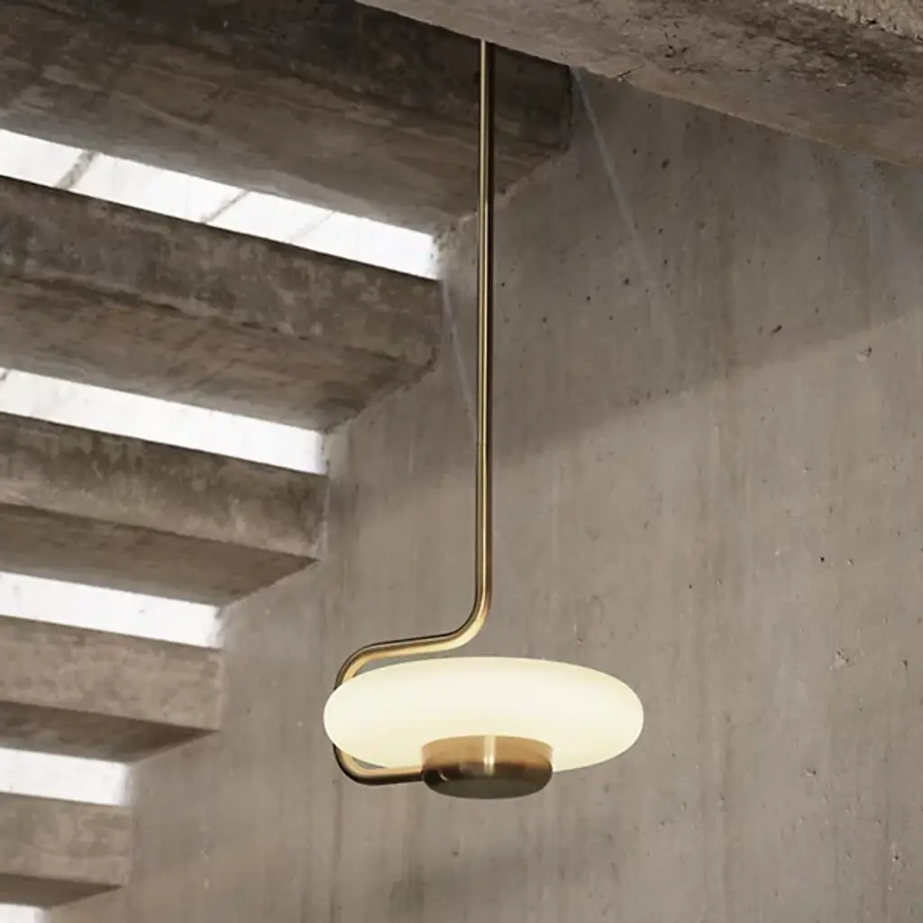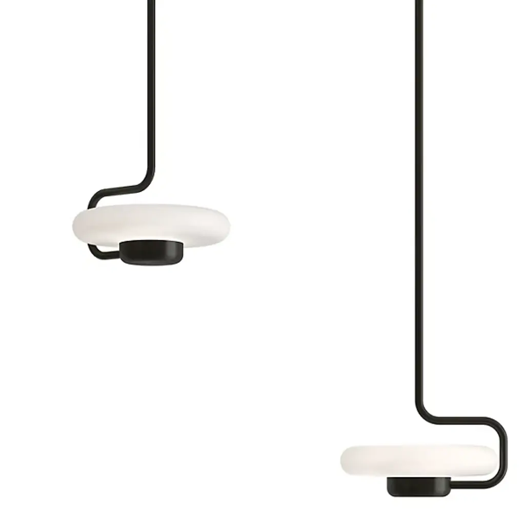 The Tratto LED Pendant from kdln emphasizes clarity of form through simple geometry and playful details. Designed by Oliver Schick, it begins with a circular canopy that anchors a single, slender arm, which arcs out and inward to support a flat diffuser made of mouth-blown opal glass with rounded edges. An efficient LED rests within, casting a steady, even light gently refracted into a warm glow. The pendant’s slender appearance is subtly retro, with rounded edges, while its smooth steel surfaces create a distinctly contemporary character.