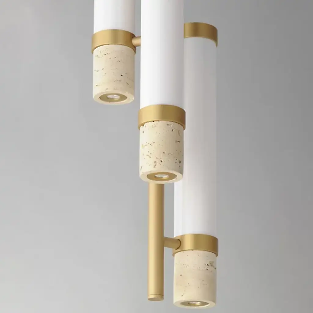The Travertine 3 Light LED Pendant from ET2 Lighting reimagines classical elements for modern spaces. Inspired by ancient architecture, this fixture pairs columns of natural travertine stone with LED tubes, creating a delightful chemistry of organic textures and cutting-edge illumination. The light diffuses evenly through matte acrylic, casting an indulgent glow that enhances the stone's subtle variations. This pendant offers a fresh take on minimalist design, proving that simplicity and natural elements coexist beautifully in contemporary lighting solutions.