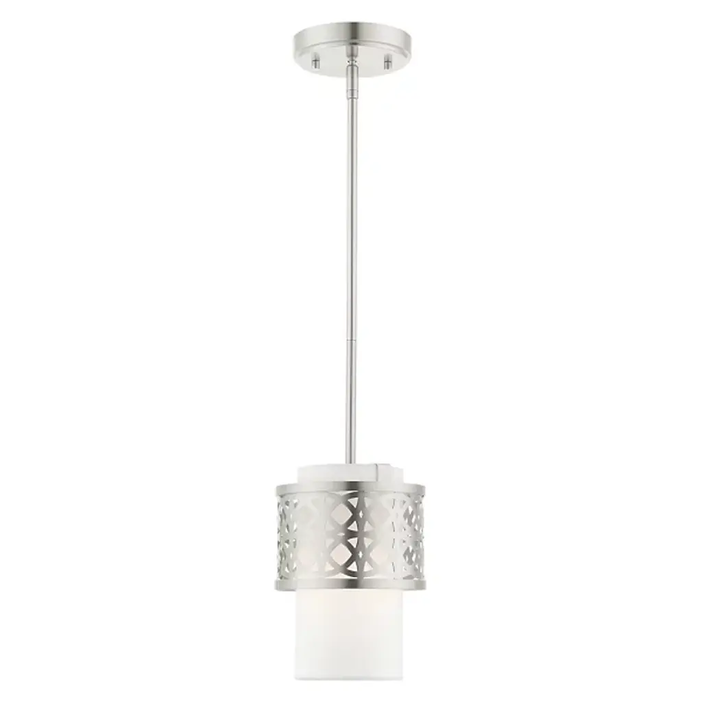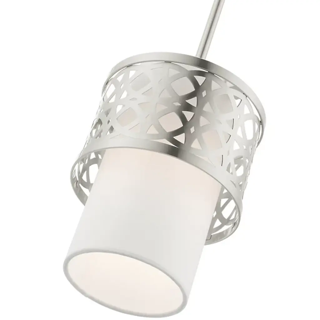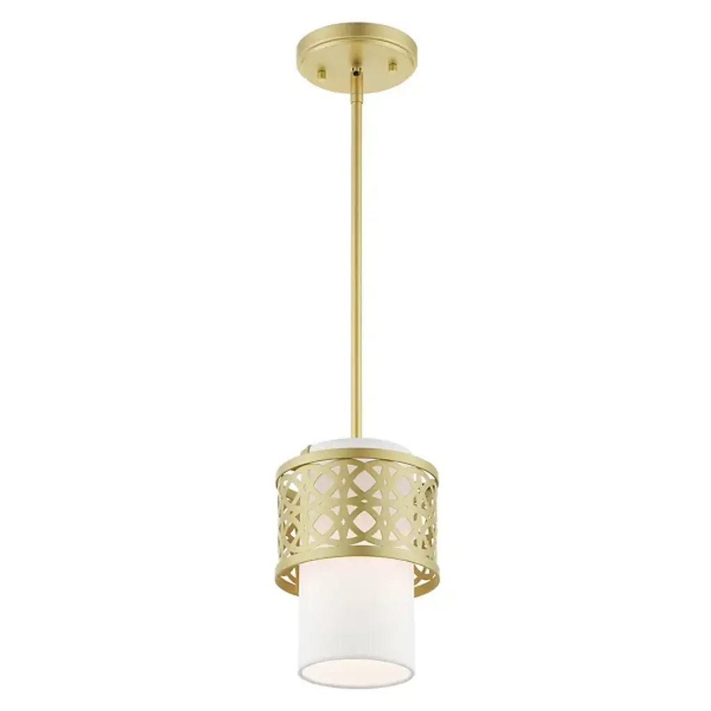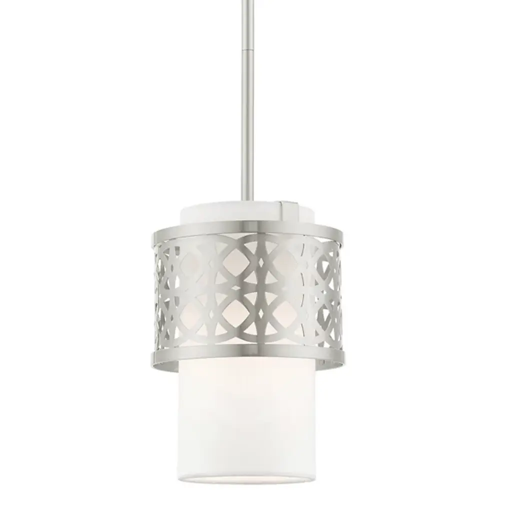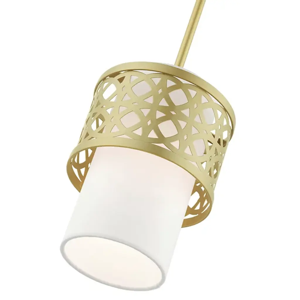 Lend your indoor living spaces a tasteful, transitional air with the Travis Mini Pendant from Alder & Ore. Ideal for both confined spaces as a single installation, or larger living spaces as an evenly-spaced arrangement, it extends down from a sleek disc canopy along a slender downrod. This downrod seats damp-listed lamping beneath a compound shade, a larger cylindrical shade of hardback fabric placed within a shorter, wider metal shade with a series of interlocking rings pattered around it that obscures bright glare from the sides, transforming it into an elegant ambiance.