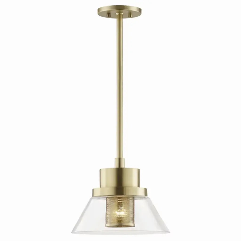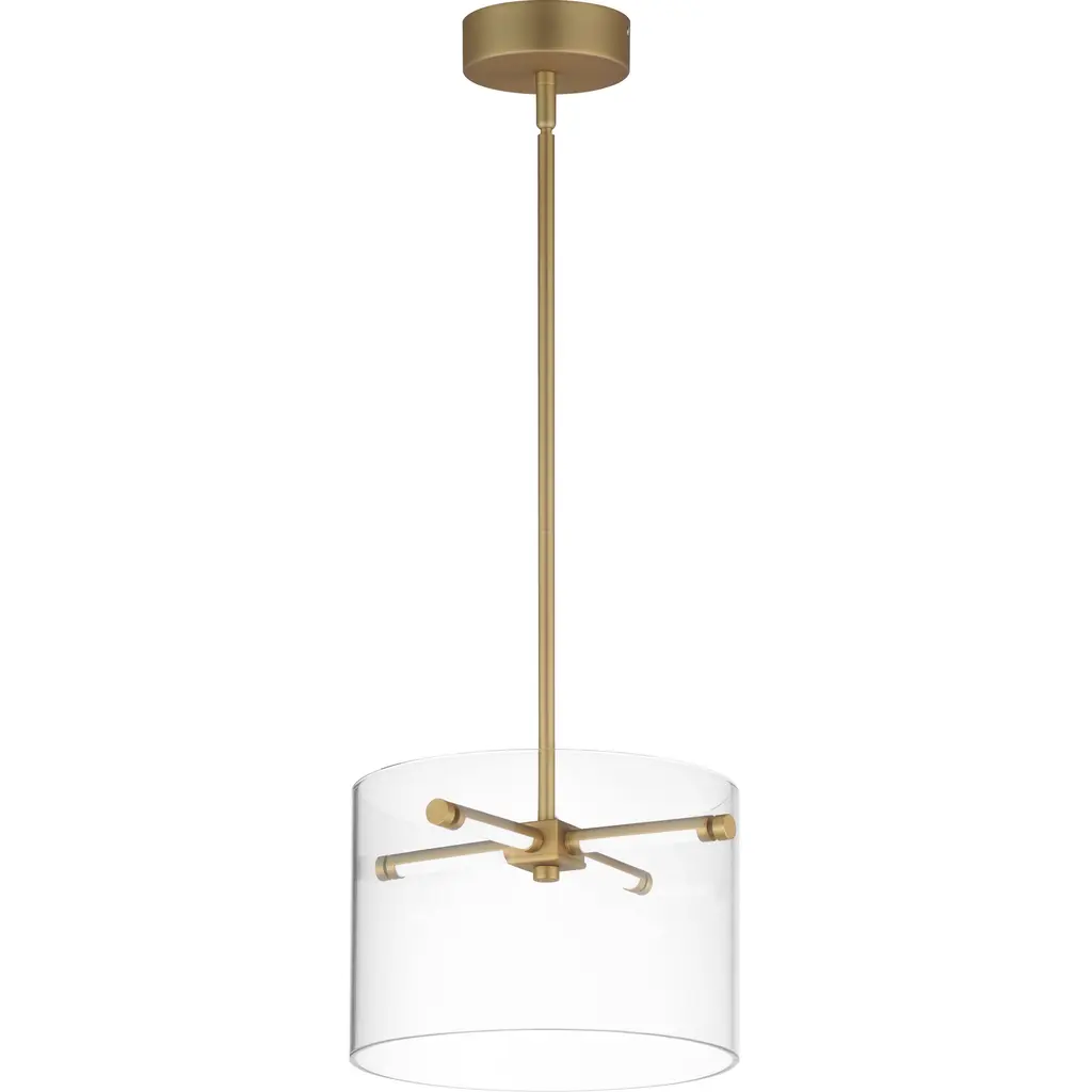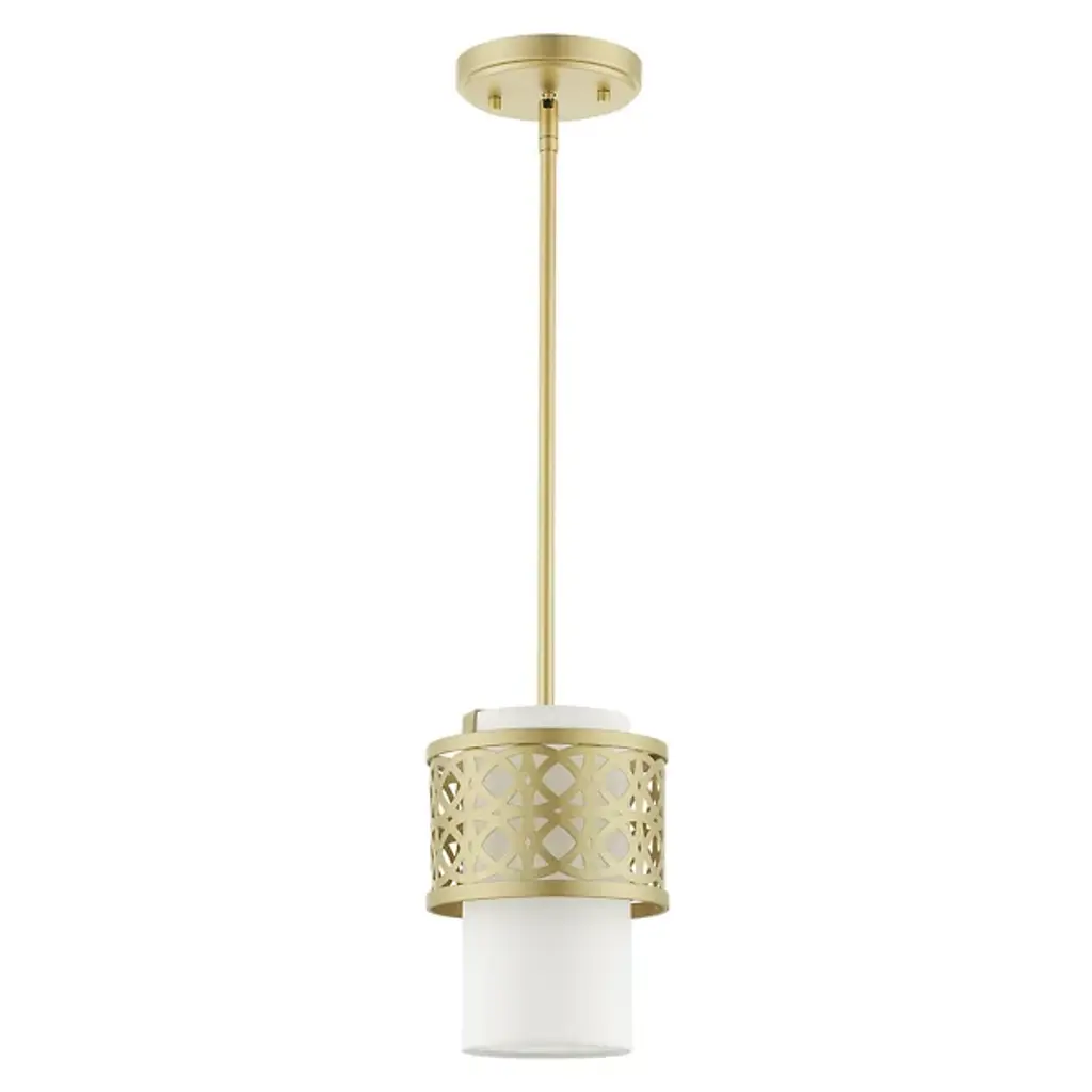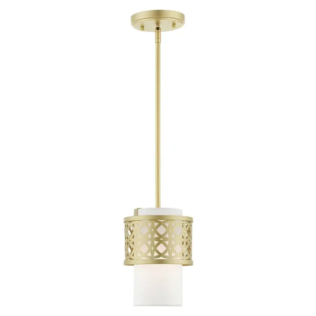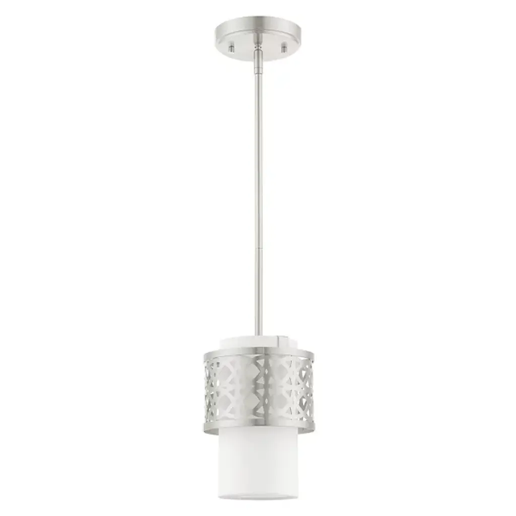 Lend your indoor living spaces a tasteful, transitional air with the Travis Mini Pendant from Alder & Ore. Ideal for both confined spaces as a single installation, or larger living spaces as an evenly-spaced arrangement, it extends down from a sleek disc canopy along a slender downrod. This downrod seats damp-listed lamping beneath a compound shade, a larger cylindrical shade of hardback fabric placed within a shorter, wider metal shade with a series of interlocking rings pattered around it that obscures bright glare from the sides, transforming it into an elegant ambiance.